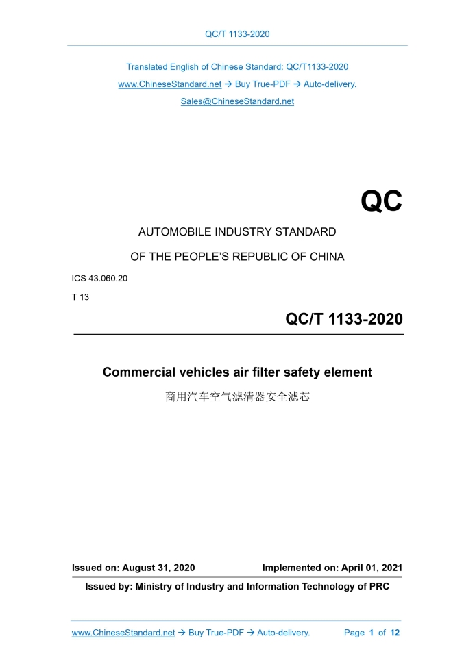 QC/T 1133-2020: Commercial vehicles air filter safety element Delivery: 9 seconds. True-PDF full-copy in English & invoice will be downloaded + auto-delivered via email. See step-by-step procedure Status: Valid