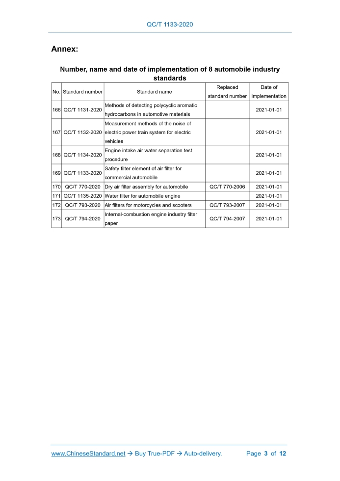 QC/T 1133-2020: Commercial vehicles air filter safety element---This is an excerpt. Full copy of true-PDF in English version (including equations, symbols, images, flow-chart, tables, and figures etc.), auto-downloaded/delivered in 9 seconds, can be purchased online: https://www.ChineseStandard.net/PDF.aspx/QCT1133-2020QC AUTOMOBILE INDUSTRY STANDARD OF THE PEOPLE’S REPUBLIC OF CHINA ICS 43.060.20 T 13 Commercial vehicles air filter safety element ISSUED ON: AUGUST 31, 2020 IMPLEMENTED ON: APRIL 01, 2021 Issued by: Ministry of Industry and Information Technology of PRC Annex: Number, name and date of implementation of 8 automobile industry standards No. Standard number Standard name Replaced standard number Date of implementation 166 QC/T 1131-2020 Methods of detecting polycyclic aromatic hydrocarbons in automotive materials 2021-01-01 167 QC/T 1132-2020 Measurement methods of the noise of electric power train system for electric vehicles 2021-01-01 168 QC/T 1134-2020 Engine intake air water separation test procedure 2021-01-01 169 QC/T 1133-2020 Safety filter element of air filter for commercial automobile 2021-01-01 170 QC/T 770-2020 Dry air filter assembly for automobile QC/T 770-2006 2021-01-01 171 QC/T 1135-2020 Water filter for automobile engine 2021-01-01 172 QC/T 793-2020 Air filters for motorcycles and scooters QC/T 793-2007 2021-01-01 173 QC/T 794-2020 Internal-combustion engine industry filter paper QC/T 794-2007 2021-01-01 Table of ContentsForeword ... 5 1 Scope ... 6 2 Normative references ... 6 3 Terms and definitions ... 7 4 Requirements ... 7 5 Test method ... 9 6 Inspection rules ... 10 7 Marking, packaging, transportation, storage ... 11 Commercial vehicles air filter safety element1 ScopeThis document specifies the technical requirements, test methods, inspection rules, marking, packaging, transportation, storage of safety elements of commercial vehicle air filters. This document is applicable to safety elements of commercial vehicle air filters (hereinafter referred to as filter elements), which have a volume flow of less than 4000 m3/h. For the safety elements of air filters for construction machinery, agricultural and forestry machinery, ships and stationary power, they may refer to this document.2 Normative referencesThe contents of the following documents constitute the indispensable clauses of this document through normative references in the text. Among them, for dated reference documents, only the version corresponding to that date is applicable to this document; for undated reference documents, the latest version (including all amendments) is applicable to this document. GB/T 1184-1996 Geometrical tolerancing - Geometrical tolerance for features without individual tolerance indications GB/T 1804-2000 General tolerances - Tolerances for linear and angular dimensions without individual tolerance indications GB/T 1958 Geometrical product specifications (GPS) - Geometrical tolerance - Verification GB/T 2828.1 Sampling procedures for inspection by attributes -Part 1: Sampling schemes indexed by acceptance quality limit (AQL) for lot-by-lot inspection GB/T 14656 Test method for burning behavior of flame-retardant paper and board QC/T 32-2017 Test methods of air cleaners for automobiles element shall not be greater than 0.30 g/(m3 • min-1); the specific dust penetration rate of the non-paper filter element shall not be greater than 0.70 g/(m3 • min-1). 4.6 Flame-retardancy For filter elements used in special occasions (such as natural gas engines, etc.), the flame-retardancy of the filter material used shall meet the following requirements: a) The average continuous burning time is not more than 5 s; b) The average carbonization length is not more than 115 mm. 4.7 Folding distance and number of folds 4.7.1 The folding distance of the filter element shall be uniform. The maximum folding distance of its unevenness, on the outer diameter of the filter element, shall not be greater than 1.5 times the nominal folding distance. The minimum folding distance shall not be less than 0.5 times the nominal folding distance. 4.7.2 Tolerance of number of folds of filter paper: For filter paper, which has a number of folds of less than 50, the tolerance is ±2 folds; for filter paper, which has a number of folds of 50 ~ 100, the tolerance is ±3 folds; for filter paper, which has a number of folds of more than 100, the tolerance is ±4 folds. 4.8 Dimensional tolerance, shape, position tolerance 4.8.1 The dimensional deviation of the inner hole diameter of the filter element's end cover shall meet the requirements of grade C in GB/T 1804-2000. 4.8.2 The height deviation of the filter element shall meet the requirements of grade C in GB/T 1804-2000. 4.8.3 The perpendicularity deviation, BETWEEN the center line of the filter element AND the end surface, shall meet the requirements of grade L in GB/T 1184-1996. 4.8.4 The parallelism tolerance of both ends of the filter element shall not be greater than 1.5 mm. The measurement position shall be on the ring surface, which is 10 mm away from the inner diameter of the filter element. 4.9 Appearance 4.9.1 The filter element shall be clean. The inner and outer surface shall be free of dirt and impurities. 4.9.2 The metal parts, which are used in the filter element, shall be treated with 5.4.3 If the requirements of 5.1.5 (pre-filter dust removal) in QC/T 32-2017 are applicable, it shall follow the requirements. In this test, the efficiency of the pre- filter will be different from that under normal conditions; however, if it drops significantly, it shall check the reason AND make records truthfully. 5.4.4 Collect the test dust, on the inner wall of the connecting pipe, between the absolute filter and the test piece. Weigh it together with the absolute filter. Calculate and determine the increase in the mass of the absolute filter. 5.4.5 Calculate the specific dust penetration according to formula (1): Where: SDP - Specific dust penetra