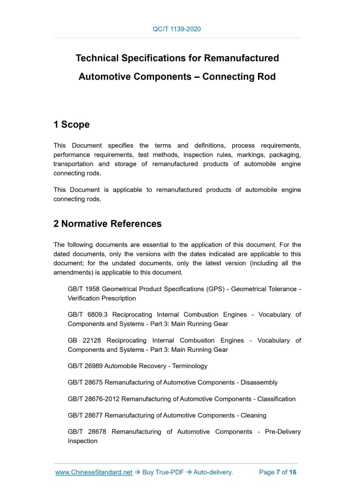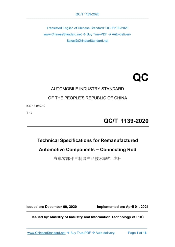 QC/T 1139-2020: Technical Specifications for Remanufactured Automotive Components - Connecting Rod Delivery: 9 seconds. True-PDF full-copy in English & invoice will be downloaded + auto-delivered via email. See step-by-step procedure Status: Valid