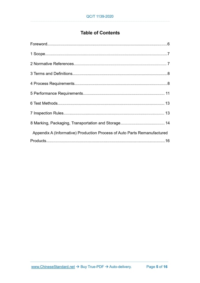 QC/T 1139-2020: Technical Specifications for Remanufactured Automotive Components - Connecting Rod---This is an excerpt. Full copy of true-PDF in English version (including equations, symbols, images, flow-chart, tables, and figures etc.), auto-downloaded/delivered in 9 seconds, can be purchased online: https://www.ChineseStandard.net/PDF.aspx/QCT1139-2020 QC AUTOMOBILE INDUSTRY STANDARD OF THE PEOPLE’S REPUBLIC OF CHINA ICS 43.060.10 T 12 Technical Specifications for Remanufactured Automotive Components – Connecting Rod ISSUED ON: DECEMBER 09, 2020 IMPLEMENTED ON: APRIL 01, 2021 Issued by: Ministry of Industry and Information Technology of PRC Table of ContentsForeword...6 1 Scope...7 2 Normative References... 7 3 Terms and Definitions...8 4 Process Requirements...8 5 Performance Requirements... 11 6 Test Methods... 13 7 Inspection Rules... 13 8 Marking, Packaging, Transportation and Storage... 14 Appendix A (Informative) Production Process of Auto Parts Remanufactured Products...16 Technical Specifications for Remanufactured Automotive Components – Connecting Rod1 ScopeThis Document specifies the terms and definitions, process requirements, performance requirements, test methods, inspection rules, markings, packaging, transportation and storage of remanufactured products of automobile engine connecting rods. This Document is applicable to remanufactured products of automobile engine connecting rods.2 Normative ReferencesThe following documents are essential to the application of this document. For the dated documents, only the versions with the dates indicated are applicable to this document; for the undated documents, only the latest version (including all the amendments) is applicable to this document. GB/T 1958 Geometrical Product Specifications (GPS) - Geometrical Tolerance - Verification Prescription GB/T 6809.3 Reciprocating Internal Combustion Engines - Vocabulary of Components and Systems - Part 3: Main Running Gear GB 22128 Reciprocating Internal Combustion Engines - Vocabulary of Components and Systems - Part 3: Main Running Gear GB/T 26989 Automobile Recovery - Terminology GB/T 28675 Remanufacturing of Automotive Components - Disassembly GB/T 28676-2012 Remanufacturing of Automotive Components - Classification GB/T 28677 Remanufacturing of Automotive Components - Cleaning GB/T 28678 Remanufacturing of Automotive Components - Pre-Delivery Inspection 4.1.2 The production process of the remanufactured products can refer to Figure A.1. 4.2 Disassembly requirements 4.2.1 The disassembly of the connecting rod shall comply with the requirements of GB/T 28675. 4.2.2 The connecting rod shall be disassembled into connecting rod body, connecting rod cover, connecting rod bolt and small end bushing. Except for connecting rod body and connecting rod cover, the remaining parts shall be discarded. 4.2.3 When removing the connecting rod bushing, no scratches or other damages shall be made to the installation hole. 4.2.4 Group and mark according to quality matching. Marking positions and numbering rules should meet the requirements of original product design or remanufactured product technical documents. 4.3 Cleaning requirements After disassembly, the cleaning of the connecting rod shall comply with the provisions of GB/T 28677; and the oil dirt and sediment in the oil passage shall be thoroughly removed. 4.4 Testing and classification requirements 4.4.1 Testing requirements 4.4.1.1 The connecting rod shall be free of cracks. 4.4.1.2 The large-end threaded hole of the connecting rod shall be visually inspected without damage. If necessary, a special inspection tool may be used for inspection. 4.4.1.3 The connecting rod shall be tested for geometric tolerances to meet the requirements specified in the technical documents of the remanufacturing enterprise. 4.4.1.4 After re-tightening the torque according to the original product technical documents, the flatness of both sides of the connecting rod large-end hole shall be no greater than 0.1mm. 4.4.2 Classification requirements 4.4.2.1 The classification of old connecting rods after dismantling shall comply with the provisions of GB/T 28676. 4.4.2.2 Old connecting rods that meet the following conditions can be remanufactured, otherwise they shall be discarded: a) There is no crack in the connecting rod body and the connecting rod cover; b) There is no damage to the large-end threaded hole of the connecting rod; c) The connecting rod shall have no warpage and deformation, and the flatness of the side surface shall be less than 0.1mm. 4.5 Repair requirements 4.5.1 Repair of end face After re-tightening the torque according to the original product technical document, the end face of the connecting rod shaft hole is used as the positioning reference; and the two ends of the connecting rod are processed and levelled. The maximum allowable processing on one side is 0.05mm. 4.5.2 Repair of large end holes If the size and geometric dimensions of the connecting rod large end hole exceed the allowable tolerance range, the following methods or other methods can be used to repair: a) When the mating surfaces of the connecting rod body and the connecting rod cover are flat, a small amount of the mating surface materials of the connecting rod body and the connecting rod cover are removed, and the connecting rod bolts are tightened to a certain torque value according to the provisions of the remanufactured product technical documents. The large end hole of the connecting rod is machined to meet the requirements for technical document of the remanufactured product; b) When the mating surface of the connecting rod body and the connecting rod cover is a special-shaped surface, increase the large end hole of the connecting rod and use a special thick bearing bush, or use electric brush plating, metal spraying, etc. to add materials; the connecting rod bolts are tightened to a certain torque value according to the provisions of the remanufactured product tec