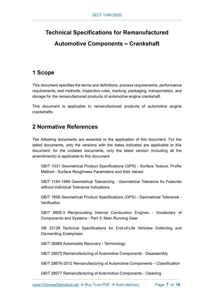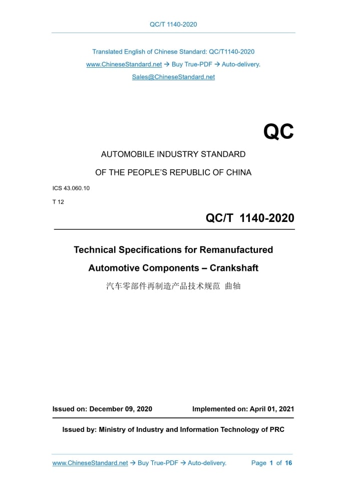 QC/T 1140-2020: Technical Specifications for Remanufactured Automotive Components - Crankshaft Delivery: 9 seconds. True-PDF full-copy in English & invoice will be downloaded + auto-delivered via email. See step-by-step procedure Status: Valid