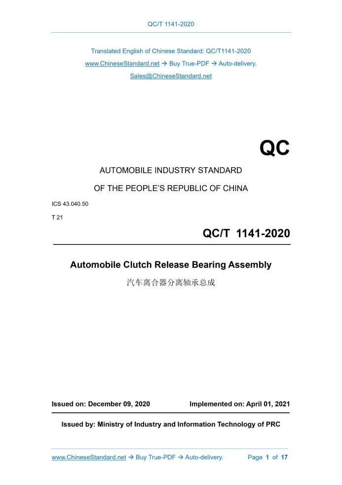QC/T 1141-2020: Automobile Clutch Release Bearing Assembly Delivery: 9 seconds. True-PDF full-copy in English & invoice will be downloaded + auto-delivered via email. See step-by-step procedure Status: Valid