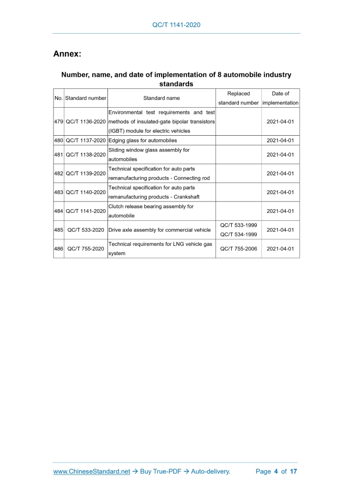 QC/T 1141-2020: Automobile Clutch Release Bearing Assembly---This is an excerpt. Full copy of true-PDF in English version (including equations, symbols, images, flow-chart, tables, and figures etc.), auto-downloaded/delivered in 9 seconds, can be purchased online: https://www.ChineseStandard.net/PDF.aspx/QCT1141-2020QC AUTOMOBILE INDUSTRY STANDARD OF THE PEOPLE’S REPUBLIC OF CHINA ICS 43.040.50 T 21 Automobile Clutch Release Bearing Assembly ISSUED ON: DECEMBER 09, 2020 IMPLEMENTED ON: APRIL 01, 2021 Issued by: Ministry of Industry and Information Technology of PRC Annex: Number, name, and date of implementation of 8 automobile industry standards No. Standard number Standard name Replaced standard number Date of implementation 479 QC/T 1136-2020 Environmental test requirements and test methods of insulated-gate bipolar transistors (IGBT) module for electric vehicles 2021-04-01 480 QC/T 1137-2020 Edging glass for automobiles 2021-04-01 481 QC/T 1138-2020 Sliding window glass assembly for automobiles 2021-04-01 482 QC/T 1139-2020 Technical specification for auto parts remanufacturing products - Connecting rod 2021-04-01 483 QC/T 1140-2020 Technical specification for auto parts remanufacturing products - Crankshaft 2021-04-01 484 QC/T 1141-2020 Clutch release bearing assembly for automobile 2021-04-01 485 QC/T 533-2020 Drive axle assembly for commercial vehicle QC/T 533-1999 QC/T 534-1999 2021-04-01 486 QC/T 755-2020 Technical requirements for LNG vehicle gas system QC/T 755-2006 2021-04-01 Table of ContentsForeword ... 6 1 Scope ... 7 2 Normative Reference ... 7 3 Terms and Definitions ... 7 4 Technical Requirements ... 8 5 Test Methods ... 10 Automobile Clutch Release Bearing Assembly1 ScopeThis document specifies the technical requirements and bench test methods for automotive clutch release bearing assembly. This document is applicable to automotive mechanically and hydraulically controlled clutch release bearing assembly.2 Normative ReferenceThe following documents are essential to the application of this document. For the dated documents, only the versions with the dates indicated are applicable to this document; for the undated documents, only the latest version (including all the amendments) is applicable to this document. QC/T 1125-2019 Automobile Clutch System Terms and Definitions3 Terms and DefinitionsFor the purposes of this document, the terms and definitions given in QC/T 1125-2019 and the following apply. 3.1 Mechanically controlled clutch release bearing A clutch release bearing that realizes clutch separation and engagement under the action of a mechanical mechanism. 3.2 Hydraulically controlled clutch release bearing The clutch release bearing that realizes the clutch separation and engagement under the action of hydraulic pressure. 3.3 Self-aligning clutch release bearing assembly Bearing assembly with automatic adjustment to realize the coaxial rotation performance of the clutch release bearing assembly and the clutch cover assembly. 3.4 Non-aligning clutch release bearing assembly 4.2 Aligning force According to the test method specified in 5.1.2, the aligning force of self-aligning clutch release bearing assembly of a passenger car shall be 25~150N; and the aligning force of self-aligning clutch release bearing assembly of a commercial vehicle shall be 100~400N; for those with special requirements, they can be implemented according to customer's technical requirements. 4.3 Aligning displacement According to the test method specified in 5.1.3, the aligning displacement of the self- aligning clutch release bearing assembly shall be no less than 1.0mm; for those with special requirements, they can be implemented according to the customer’s technical requirements. 4.4 Noise According to the test method specified in 5.1.4, the noise of the clutch release bearing assembly of passenger cars shall not exceed 64dB (A); and the noise of the clutch release bearing assembly of commercial vehicles shall not exceed 74dB (A); for those with special requirements, they can be implemented according to customer's technical requirements. 4.5 Durability After the durability test is completed in accordance with the test conditions specified in 5.1.5.1, any part of the clutch release bearing assembly shall not be damaged; the amount of wearing on the rotating end face of the bearing shall be no greater than 0.5mm; and the noise value after the test shall be no greater than 120% before the test; and it shall meet the performance requirements of 4.1, 4.2 and 4.3; and the hydraulically controlled clutch release bearing shall also meet the performance requirements of 4.6 and 4.7. 4.6 Pressure resistance According to the test method specified in 5.2.6, the pressure drop of the hydraulically controlled clutch release bearing assembly of the commercial vehicle shall be less than 0.5MPa; and the pressure drop of the hydraulically controlled clutch release bearing assembly of the passenger car shall be less than 0.2MPa. 4.7 Low pressure sealing performance According to the test method specified in 5.2.7, the pressure drop of the hydraulically controlled clutch release bearing assembly shall be less than 1kPa. 4.8 Low temperature performance 1 – motor; 2 – substitute flywheel; 3 – clutch driven plate assembly; 4 – heater; 5 – clutch cover assembly; 6 – insulation protective cover; 7 – release bearing assembly; 8 – force sensor; 9 – connecting rod; 10 – camshaft; 11 – loading motor Figure 5 – Schematic Diagram of Durability Test of Clutch Release Bearing Assembly 5.2 Hydraulically controlled clutch release bearing assembly 5.2.1 Start-up torque test The same as 5.1.1. 5.2.2 Aligning force test The same as 5.1.2. 5.2.3 Aligning displacement test The same as 5.1.3. 5.2.4 Noise test The same as 5.1.4. 5.2.5 Durability test 5.2.5.1 Test conditions The same as 5.1.5.1. 5.2.5.2 Test procedures The hydraulically controlled clutch release bearing assembly and the matching clutch co