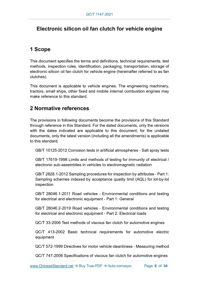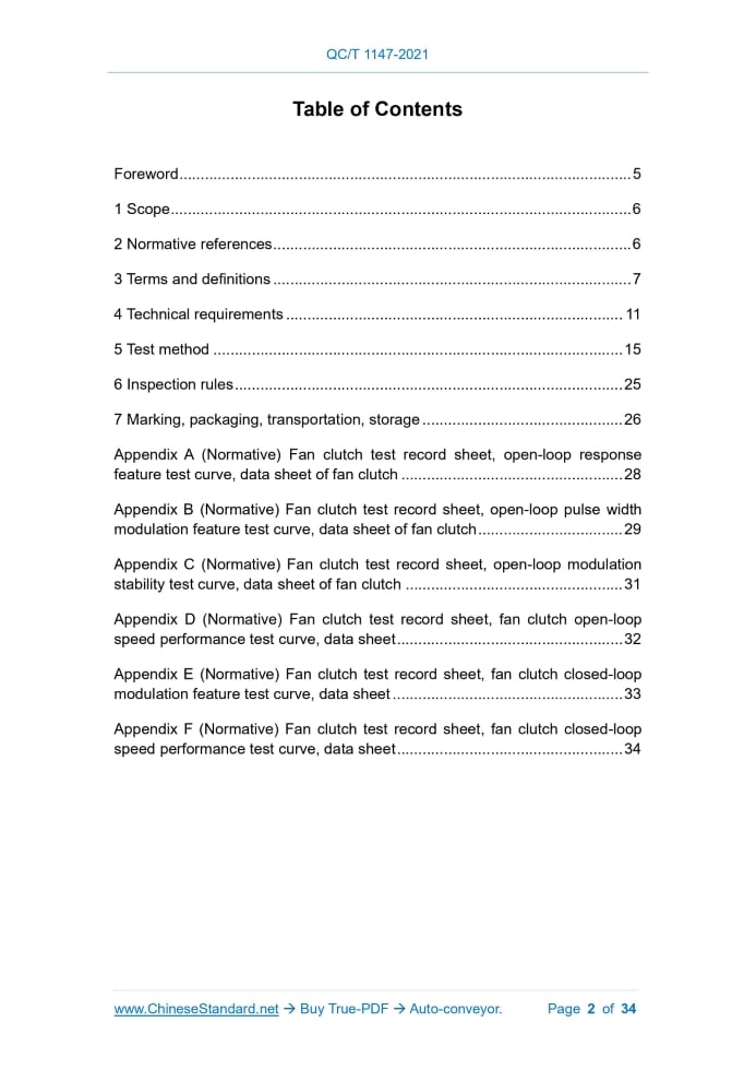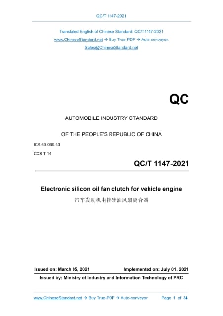QC/T 1147-2021: Electronic silicon oil fan clutch for vehicle engine---This is an excerpt. Full copy of true-PDF in English version (including equations, symbols, images, flow-chart, tables, and figures etc.), auto-downloaded/delivered in 9 seconds, can be purchased online: https://www.ChineseStandard.net/PDF.aspx/QCT1147-2021QC AUTOMOBILE INDUSTRY STANDARD OF THE PEOPLE’S REPUBLIC OF CHINA ICS 43.060.40 CCS T 14 Electronic silicon oil fan clutch for vehicle engine ISSUED ON: MARCH 05, 2021 IMPLEMENTED ON: JULY 01, 2021 Issued by: Ministry of Industry and Information Technology of PRC Table of ContentsForeword ... 5 1 Scope ... 6 2 Normative references ... 6 3 Terms and definitions ... 7 4 Technical requirements ... 11 5 Test method ... 15 6 Inspection rules ... 25 7 Marking, packaging, transportation, storage ... 26 Appendix A (Normative) Fan clutch test record sheet, open-loop response feature test curve, data sheet of fan clutch ... 28 Appendix B (Normative) Fan clutch test record sheet, open-loop pulse width modulation feature test curve, data sheet of fan clutch ... 29 Appendix C (Normative) Fan clutch test record sheet, open-loop modulation stability test curve, data sheet of fan clutch ... 31 Appendix D (Normative) Fan clutch test record sheet, fan clutch open-loop speed performance test curve, data sheet ... 32 Appendix E (Normative) Fan clutch test record sheet, fan clutch closed-loop modulation feature test curve, data sheet ... 33 Appendix F (Normative) Fan clutch test record sheet, fan clutch closed-loop speed performance test curve, data sheet ... 34 Electronic silicon oil fan clutch for vehicle engine1 ScopeThis document specifies the terms and definitions, technical requirements, test methods, inspection rules, identification, packaging, transportation, storage of electronic silicon oil fan clutch for vehicle engine (hereinafter referred to as fan clutches). This document is applicable to vehicle engines. The engineering machinery, tractors, small ships, other fixed and mobile internal combustion engines may make reference to this standard.2 Normative referencesThe provisions in following documents become the provisions of this Standard through reference in this Standard. For the dated documents, only the versions with the dates indicated are applicable to this document; for the undated documents, only the latest version (including all the amendments) is applicable to this standard. GB/T 10125-2012 Corrosion tests in artificial atmospheres - Salt spray tests GB/T 17619-1998 Limits and methods of testing for immunity of electrical / electronic sub-assemblies in vehicles to electromagnetic radiation GB/T 2828.1-2012 Sampling procedures for inspection by attributes - Part 1: Sampling schemes indexed by acceptance quality limit (AQL) for lot-by-lot inspection GB/T 28046.1-2011 Road vehicles - Environmental conditions and testing for electrical and electronic equipment - Part 1: General GB/T 28046.2-2019 Road vehicles - Environmental conditions and testing for electrical and electronic equipment - Part 2: Electrical loads QC/T 33-2006 Test methods of viscous fan clutch for automotive engines QC/T 413-2002 Basic technical requirements for automotive electric equipment QC/T 572-1999 Directives for motor vehicle cleanliness - Measuring method QC/T 747-2006 Specifications of viscous fan clutch for automotive engines output speed to gradually approaches to the target output speed, by making the fan clutch be in the disengaged status, through automatic adjustment of pulse width modulation signal, based on the feedback from the output speed. 3.25 Closed-loop speed feature When the target speed of the fan clutch is constant, AND the different input speeds are set, the performance of the control system, to control the output speed to gradually approaches to the target output speed, by making the fan clutch be in the disengaged status, through automatic adjustment of pulse width modulation signal, based on the feedback from the output speed.4 Technical requirements4.1 General requirements 4.1.1 Processing and casting The fan clutch shall be manufactured, in accordance with the approved product drawings and technical documents. The surface of the fan clutch casting is smooth. There must be no defect, such as blisters, shrinkage, cracks, etc. It shall meet the requirements of QC/T 747-2006 or drawings and related technical conditions. 4.1.2 Working voltage of coil The working voltage of the fan clutch's coil shall generally be 24V ± 4V and 12V ± 2V; OR it shall meet the requirements of the drawing and related technical conditions. 4.1.3 Working voltage of Hall speed sensor The working voltage of the fan clutch's Hall speed sensor shall generally be 3.8V ~ 24V; OR it shall meet the requirements of the drawing and related technical conditions. 4.1.4 Working frequency of pulse width modulation signal The working frequency of the pulse width modulation signal of the fan clutch shall generally be 1Hz ~ 10Hz; OR it shall meet the requirements of the drawings and related technical conditions. 4.1.5 Working environment temperature The working environment temperature of the fan clutch shall be -41°C ~ 125°C; OR it shall meet the requirements of drawings and related technical conditions. 4.1.6 Cleanliness The cleanliness in the working chamber of the fan clutch shall meet the requirements of QC/T 572-1999 or drawings and related technical documents. 4.1.7 Dynamic balance The dynamic balance performance of the rotating parts of the fan clutch shall meet the requirements of QC/T 747-2006 or drawings and related technical documents. 4.1.8 Main bearing seal When tested according to the requirements of 5.1, the sealing performance of the main bearing of the fan clutch shall meet the requirements of QC/T 747- 2006 or drawings and related technical documents. 4.2 Performance requirements 4.2.1 Open-loop performance 4.2.1.1 Response feature a) Engaged response feature Carry out the test in accordance 