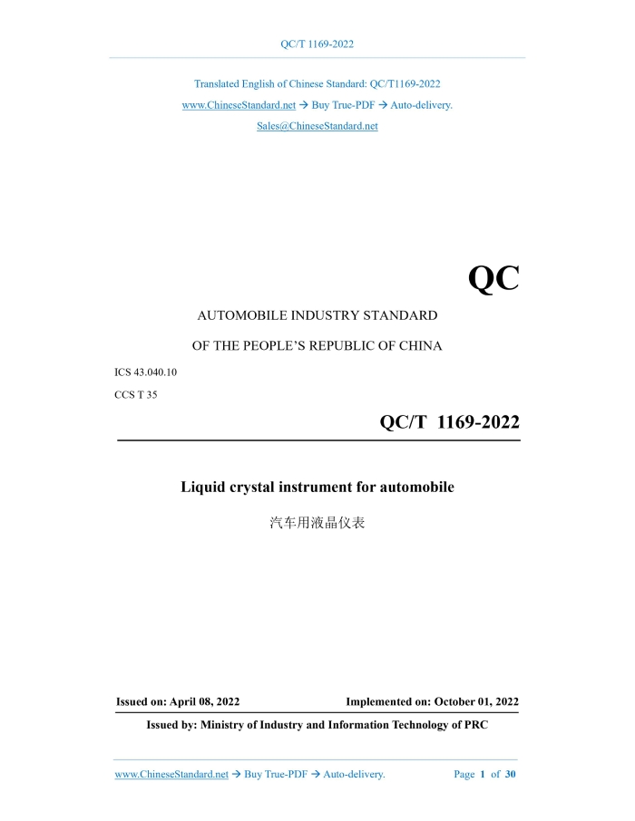 QC/T 1169-2022: Liquid crystal instrument for automobile Delivery: 9 seconds. True-PDF full-copy in English & invoice will be downloaded + auto-delivered via email. See step-by-step procedure Status: Valid
