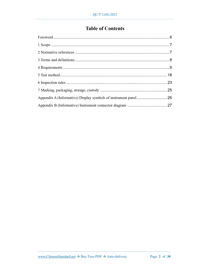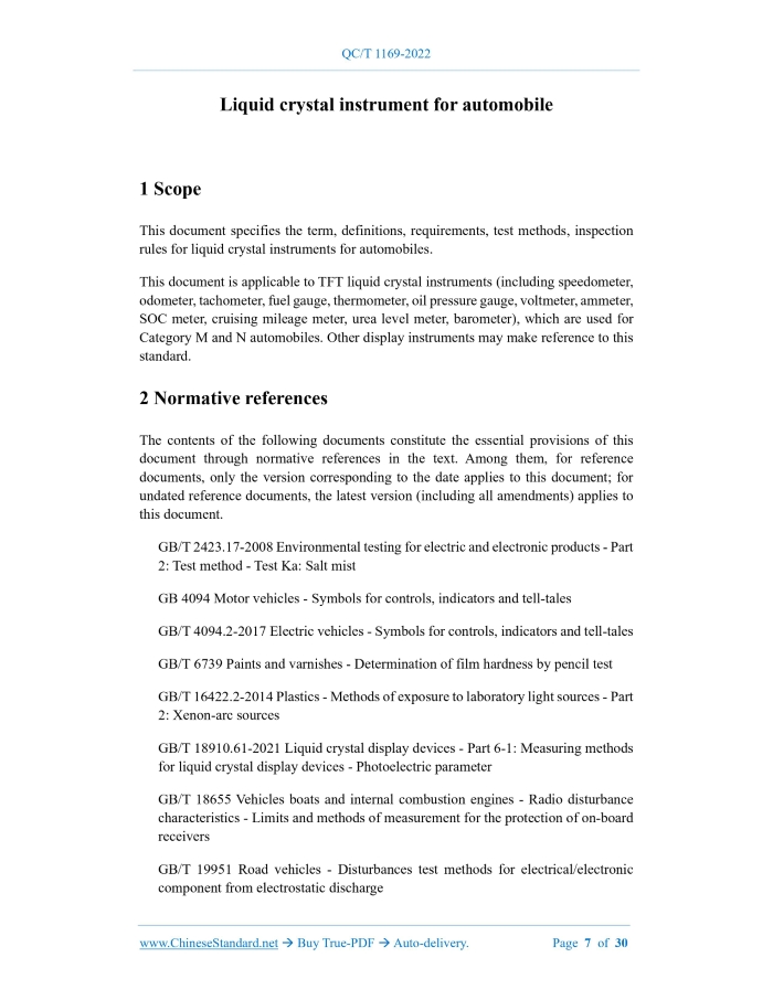 QC/T 1169-2022: Liquid crystal instrument for automobile---This is an excerpt. Full copy of true-PDF in English version (including equations, symbols, images, flow-chart, tables, and figures etc.), auto-downloaded/delivered in 9 seconds, can be purchased online: https://www.ChineseStandard.net/PDF.aspx/QCT1169-2022QC AUTOMOBILE INDUSTRY STANDARD OF THE PEOPLE’S REPUBLIC OF CHINA ICS 43.040.10 CCS T 35 Liquid crystal instrument for automobile ISSUED ON: APRIL 08, 2022 IMPLEMENTED ON: OCTOBER 01, 2022 Issued by: Ministry of Industry and Information Technology of PRC Table of ContentsForeword ... 6 1 Scope ... 7 2 Normative references ... 7 3 Terms and definitions ... 8 4 Requirements ... 9 5 Test method ... 18 6 Inspection rules ... 23 7 Marking, packaging, storage, custody ... 25 Appendix A (Informative) Display symbols of instrument panel ... 26 Appendix B (Informative) Instrument connector diagram ... 27 Liquid crystal instrument for automobile1 ScopeThis document specifies the term, definitions, requirements, test methods, inspection rules for liquid crystal instruments for automobiles. This document is applicable to TFT liquid crystal instruments (including speedometer, odometer, tachometer, fuel gauge, thermometer, oil pressure gauge, voltmeter, ammeter, SOC meter, cruising mileage meter, urea level meter, barometer), which are used for Category M and N automobiles. Other display instruments may make reference to this standard.2 Normative referencesThe contents of the following documents constitute the essential provisions of this document through normative references in the text. Among them, for reference documents, only the version corresponding to the date applies to this document; for undated reference documents, the latest version (including all amendments) applies to this document. GB/T 2423.17-2008 Environmental testing for electric and electronic products - Part 2: Test method - Test Ka: Salt mist GB 4094 Motor vehicles - Symbols for controls, indicators and tell-tales GB/T 4094.2-2017 Electric vehicles - Symbols for controls, indicators and tell-tales GB/T 6739 Paints and varnishes - Determination of film hardness by pencil test GB/T 16422.2-2014 Plastics - Methods of exposure to laboratory light sources - Part 2: Xenon-arc sources GB/T 18910.61-2021 Liquid crystal display devices - Part 6-1: Measuring methods for liquid crystal display devices - Photoelectric parameter GB/T 18655 Vehicles boats and internal combustion engines - Radio disturbance characteristics - Limits and methods of measurement for the protection of on-board receivers GB/T 19951 Road vehicles - Disturbances test methods for electrical/electronic component from electrostatic discharge GB/T 21437.2-2008 Road vehicles - Electrical disturbances from conduction and coupling - Part 2: Electrical transient conduction along supply lines only GB/T 21437.3-2012 Road vehicles - Electrical disturbances from conduction and coupling - Part 3: Electrical transient transmission by capacitive and inductive coupling via lines other than supply lines GB/T 28046.2-2019 Road vehicles - Environmental conditions and testing for electrical and electronic equipment - Part 2: Electrical loads GB/T 28046.3-2011 Road vehicles - Environmental conditions and testing for electrical and electronic equipment - Part 3: Mechanical loads GB/T 28046.4-2011 Road vehicles - Environmental conditions and testing for electrical and electronic equipment - Part 4: Mechanical loads GB/T 28046.5-2013 Road vehicles - Environmental conditions and testing for electrical and electronic equipment - Part 5: Chemical loads GB/T 30038-2013 Road vehicles - Degrees of protection (IP-code) - Protection of electrical equipment against foreign objects, water and access QC/T 413-2002 Basic technical requirements for automotive electric equipment QC/T 550 Vehicle buzzer QC/T 727 Instrument for automobile and motorcycle SJ/T 11394 Measure methods of semiconductor light emitting diodes3 Terms and definitionsThe following terms and definitions apply to this document. 3.1 Liquid crystal instrument for automobile An instrument assembly consisting of at least one liquid crystal display, that comprehensively reflects vehicle conditions to the driver, through information display and alarms (including full liquid crystal instrument and combined liquid crystal instrument). 3.2 Full liquid crystal instrument 4.1.1 Transparent glass or transparent plastic parts shall not have bubbles, inclusions, ripples, spots, scratches, that affect the reading. The protective layer shall be uniform, without obvious defects such as bubbles, spots, rust, peeling off. The liquid crystal display shall not be cracked or deformed. All components fit together well, without looseness, falling off, visible foreign objects. 4.1.2 Division lines, pointers, numbers, characters, symbols shall be clear and complete, without refraction and reading distortion. 4.1.3 The lighting effect shall ensure that the division lines, pointers, numbers, text symbols of various instruments can be seen clearly; there shall be no glare from strong light. 4.1.4 When the signal indicator light is on, the various indication signals, symbols, patterns, colors on the instrument shall be clear and complete, without flashing. When the signal indicator is off, the signal state shall be clearly different from when it is on. 4.2 General provisions 4.2.1 Important information display The vehicle speed information and alarm information, which are displayed on the liquid crystal instrument, shall remain clearly visible, while the vehicle is running. The alarm information such as brake system malfunction, direction signal, TPMS should be displayed outside the liquid crystal display. 4.2.2 Unit and division 4.2.2.1 Pointer display The units and divisions of pointers (including virtual and physical pointers) display comply with the following requirements: - Units and divisions for speedometer, odometer, engine tachometer, fuel gauge, 
