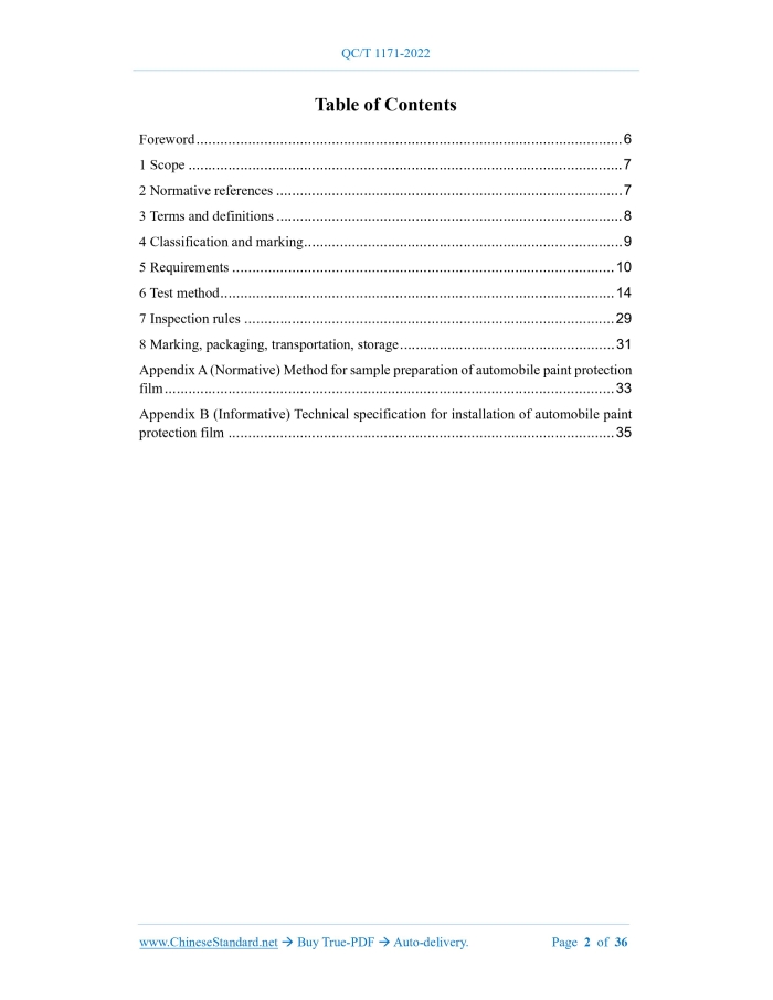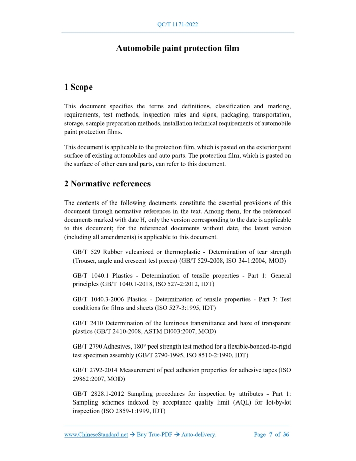 QC/T 1171-2022: Automotive paint protection film Delivery: 9 seconds. True-PDF full-copy in English & invoice will be downloaded + auto-delivered via email. See step-by-step procedure Status: Valid