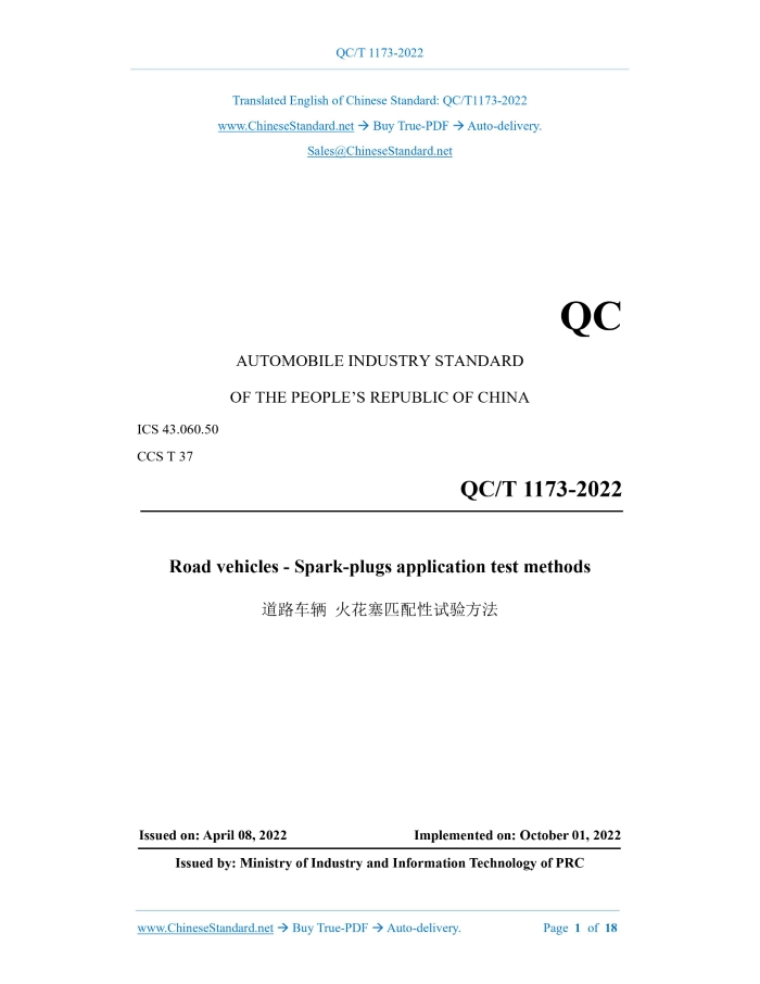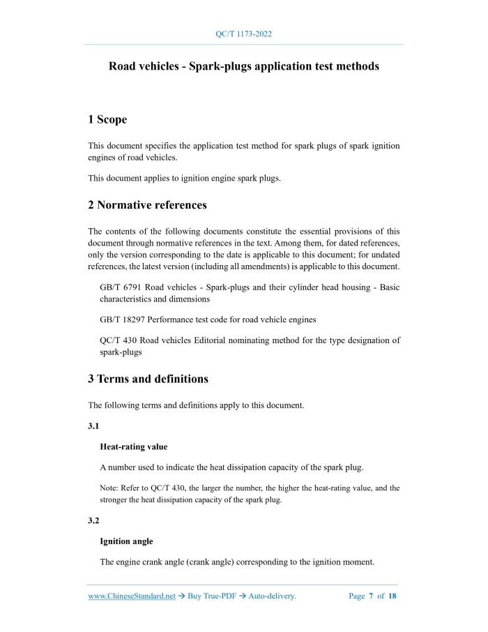 QC/T 1173-2022: Road vehicles - Spark-plugs application test methods Delivery: 9 seconds. True-PDF full-copy in English & invoice will be downloaded + auto-delivered via email. See step-by-step procedure Status: Valid