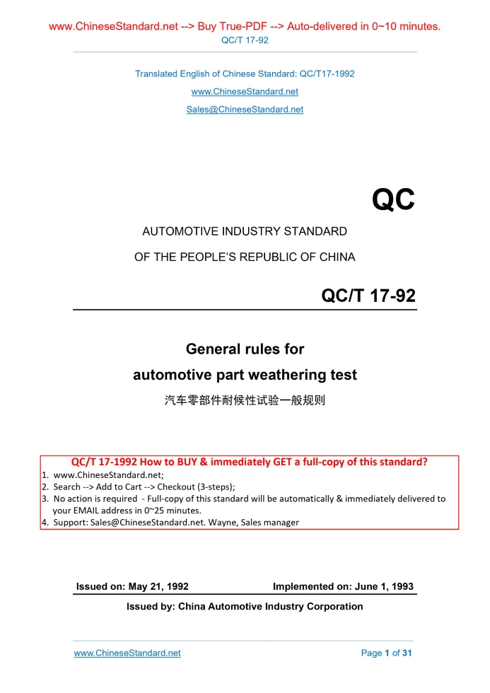 QC/T 17-1992: General Rules of Atmospheric Exposure Test for Auto Parts Delivery: 9 seconds. True-PDF full-copy in English & invoice will be downloaded + auto-delivered via email. See step-by-step procedure
