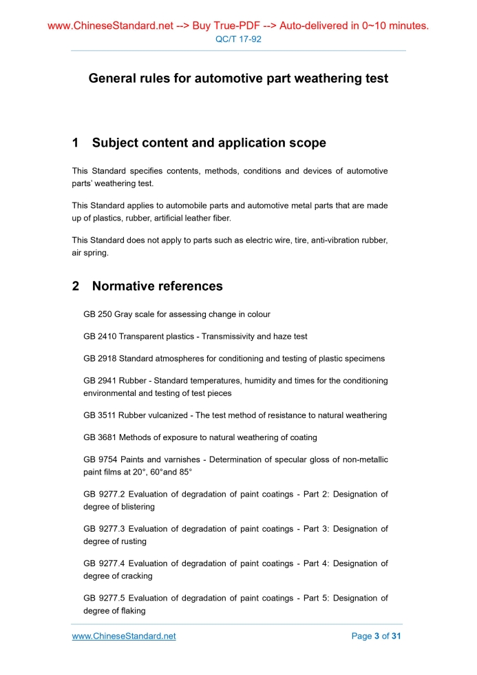 QC/T 17-1992: General Rules of Atmospheric Exposure Test for Auto Parts---This is an excerpt. Full copy of true-PDF in English version (including equations, symbols, images, flow-chart, tables, and figures etc.), auto-downloaded/delivered in 9 seconds, can be purchased online: https://www.ChineseStandard.net/PDF.aspx/QCT17-1992QC AUTOMOTIVE INDUSTRY STANDARD General rules for automotive part weathering test Issued on. MAY 21, 1992 Implemented on. JUNE 1, 1993 Issued by. China Automotive Industry Corporation Table of Contents1 Subject content and application scope... 3 2 Normative references... 3 3 Terms... 4 4 Test type and code name... 5 5 Service conditions and code... 6 6 Importance and classification of parts... 6 7 Specimens... 7 8 Test methods... 9 9 Evaluation methods... 19 10 Evaluation of test result... 21 11 Recording items... 22 Additional explanation... 31 General rules for automotive part weathering test1 Subject content and application scopeThis Standard specifies contents, methods, conditions and devices of automotive parts’ weathering test. This Standard applies to automobile parts and automotive metal parts that are made up of plastics, rubber, artificial leather fiber. This Standard does not apply to parts such as electric wire, tire, anti-vibration rubber, air spring.2 Normative referencesGB 250 Gray scale for assessing change in colour GB 2410 Transparent plastics - Transmissivity and haze test GB 2918 Standard atmospheres for conditioning and testing of plastic specimens GB 2941 Rubber - Standard temperatures, humidity and times for the conditioning environmental and testing of test pieces GB 3511 Rubber vulcanized - The test method of resistance to natural weathering GB 3681 Methods of exposure to natural weathering of coating GB 9754 Paints and varnishes - Determination of specular gloss of non-metallic paint films at 20°, 60°and 85° GB 9277.2 Evaluation of degradation of paint coatings - Part 2.Designation of degree of blistering GB 9277.3 Evaluation of degradation of paint coatings - Part 3.Designation of degree of rusting3 Terms3.1 Weather resistance. refers to anti-weathering ability of specimen under natural climate conditions such as sunlight, ozone, rain and snow, humidity and temperature. 3.2 Light resistance. refers to that surface of specimen resists degradation. 3.3 Degradation. means the phenomenon that when specimen is exposed in natural or artificial environment, its performance becomes worse as time goes by. 3.4 Exposure side. refers to the surface that specimen directly touches with sunlight, ozone, rain and snow. 3.5 Effective side. refers to the surface that has working function. a. Directly visible surface under service conditions. b. Surface of parts that is directly influenced by changes of surface condition. 3.6 Standard specimen. refers to the specimen, used for regular observation and comparison, that is stored in specified conditions. 3.7 Color-fading. refers to changes of specimen test that is caused by changes of color, brightness and other degradations. 3.8 Contact-pollution. refers to changes caused by different materials’ interaction.4 Test type and code nameTest types shall be divided into outdoor and indoor test; it is divided into seven types according to test conditions and types of testing machine (as shown in Table 1).5 Service conditions and codeConsider comprehensively according to environment and using sites of parts.6 Importance and classification of partsClassification shall be conducted according to degree of importance of part design, as shown in Table 37 Specimens7.1 Specimen shall be parts. If there are requirements in test, specimen used for coating, as specified in Table 4, shall be adopted. 7.2 When performance of test material changes, specimen shall be chosen according to different performances tested. P8 Test methods8.1 Outdoor test 8.1.1 Environment and exposure test site of outdoor test shall be in accordance with relevant provisions of GB 3681, GB 3511 and GB 1767. 8.1.2 Exposure time 8.1.3 Observation and test of specimen Item of observation and test of specimen is shown in Table 7, time of it is shown in Table 8.However, after suppliers and buyers negotiate, partial items of observation and test can be omitted. 8.1.4 Management of specimen. dirt of specimen shall be cleaned every month (but attention shall be paid to exposed surface) and cleaning shall be done (fiber and rubber products shall not washed by water) in WON and WOL. Lining of exposed surface of optical products (such as car light glass) shall be covered to avoid attaching dirt (other than specimen a) 8.2 Outdoor weather resistance test 8.2.1 Exposure device shall be in accordance with provisions of article 4 in GB 3511 or article 4 in GB 3681 or article 3 in GB 1767. 8.3 Outdoor light resistance test 8.3.1 Exposure devices shall be in accordance with provisions of article 8.2.1 and have good ventilation. The specimen above shall be covered by glass pane to avoid being influenced by wind and rain. The distance from specimen surface to glass pane (polished glass with thickness of 3mm) shall not be less than 5cm and glass pane shall be cleaned. 8.3.2 Exposure method shall be in accordance with provisions of article 8.2.2.But when specimen a is adopted, it shall be close to frame. 8.4 Outdoor shielding test 8.5 Indoor intensified test 8.5.1 Temperature of test room shall be 20±5°C. 8.5.2 Specimen. specimen shall be chosen according to purpose of test. 8.5.3 Test device9 Evaluation methods9.1 Evaluation of specimen shall be conducted after and before test, within specified time. Inspection of specimen after and before shall avoid the top and edge part of specimen. 9.2 Specimen shall be cleaned according to test purpose; if necessary, conduct in accordance with provisions in GB 2918 and GB 2941.WON, WOL and WAN test shall be conducted after stain on effective surface is cleaned. 9.5 Shape and size evaluation of specimen after test a. Changes of