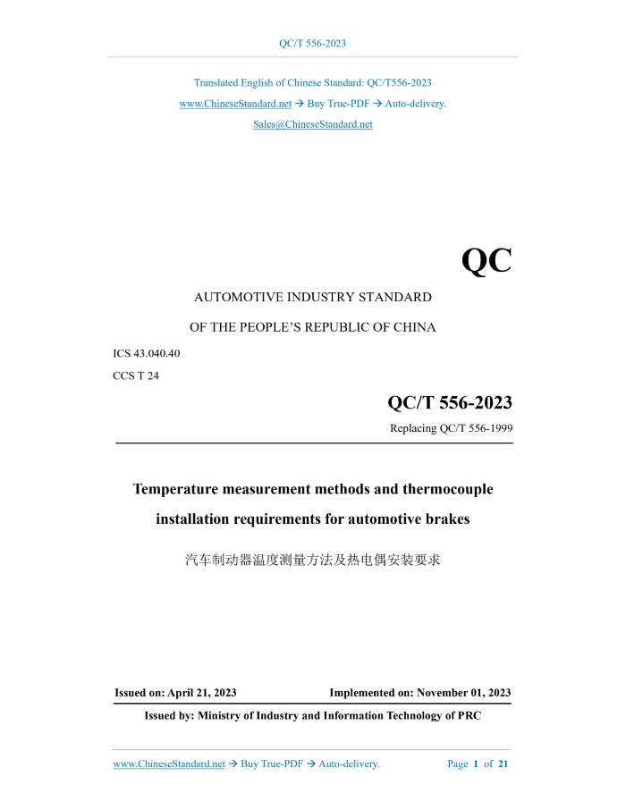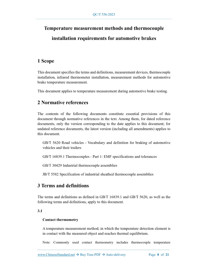QC/T 556-2023: Temperature measurement methods and thermocouple installation requirements for automobile brakes---This is an excerpt. Full copy of true-PDF in English version (including equations, symbols, images, flow-chart, tables, and figures etc.), auto-downloaded/delivered in 9 seconds, can be purchased online: https://www.ChineseStandard.net/PDF.aspx/QCT556-2023 QC AUTOMOTIVE INDUSTRY STANDARD ICS 43.040.40 CCS T 24 Replacing QC/T 556-1999 Temperature measurement methods and thermocouple installation requirements for automotive brakes Issued on. APRIL 21, 2023 Implemented on. NOVEMBER 01, 2023 Issued by. Ministry of Industry and Information Technology of PRC Announcement of Ministry of Industry and Information Technology of the People's Republic of China No.7, 2023 Table of ContentsForeword... 6 1 Scope... 8 2 Normative references... 8 3 Terms and definitions... 8 4 Measuring devices... 9 5 Thermocouple installation... 10 6 Installation of infrared thermometer... 16 7 Measurement methods... 17 Appendix A (Informative) Commonly used thermocouple structural types... 19ForewordThis document is drafted in accordance with the provisions of GB/T 1.1-2020 "Directives for standardization - Part 1.Rules for the structure and drafting of standardizing documents". This document replaces QC/T 556-1999 "Temperature measurement methods and thermocouple installation requirements for automotive brakes". Compared with QC/T 556-1999, in addition to structural adjustments and editorial changes, the main technical changes are as follows. a) ADD a "Terms and definitions" chapter (see Chapter 3); b) ADD "Measuring device for contact temperature measurement method", detailing the requirements for thermocouples and thermocouple selection (see 4.1); c) ADD "Measuring device for non-contact thermometry", detailing the requirements for infrared thermometers (see 4.2); d) CHANGE the indication error requirements for “display and recording devices” (see 4.3; 1.2 of the 1999 edition); e) CHANGE the specific requirements for the installation of embedded thermocouples on the brake lining assembly (see 5.1.1; 2.1 of the 1999 edition); f) CHANGE the specific requirements for the installation of embedded thermocouples on the brake drum (disc) (see 5.1.2; 2.2 of the 1999 edition); g) CHANGE the specific requirements for the installation of embedded thermocouples when measuring brake fluid temperature (see 5.1.3; 2.3 of the 1999 edition); h) ADD the specific requirements for the installation of rubbing thermocouples (see 5.2); i) ADD a chapter "Installation of infrared thermometer", describing the installation steps and requirements (see Chapter 6); j) CHANGE the specific requirements for "measurement preparation" (see 7.1; 3.1 of the 1999 edition); k) CHANGE the specific requirements for "Temperature measurement" (see 7.2; 3.2 of the 1999 edition); 1) DELETE the relevant content of "Temperature compensation when the free end of the thermocouple is not 0 °C" (3.3 of the 1999 edition); m) DELETE "Standard thermocouple technical data" and "Five thermocouple K value tables" (Appendix A and Appendix B of the 1999 edition); n) ADD "Commonly used thermocouple structural types" (see Appendix A). Please note that some content in this document may be subject to patents. The publisher of this document assumes no responsibility for identifying patents. This document was proposed by AND shall be under the jurisdiction of the National Automotive Standardization Technical Committee (SAC/TC 114). Drafting organizations of this document. Zhejiang Asia-Pacific Mechanical and Electrical Co., Ltd., China FAW Motor Co., Ltd., Dongfeng Motor Group Co., Ltd., Wanxiang Qianchao Co., Ltd., Ruili Group Ruian Auto Parts Co., Ltd., Xiangyang Da'an Automobile Inspection Center Co., Ltd., Anji Asia Pacific Braking Systems Co., Ltd., BAIC Motor Co., Ltd. The main drafters of this document. Li Xuejia, Zheng Dongming, Wang Shishuang, Ye Xiaoming, Wu Huojuan, Xiong Zhiqiang, Hu Dexiang, Wang Wei, Hong Qingliang. This standard replaces the standard previously issued as follows. - It was first released in 1985 as JB 3936-1985; - In 1999, the original standard number was converted into the industry standard number QC/T 556-1999, with the content remained unchanged; - This is the first revision. Temperature measurement methods and thermocouple installation requirements for automotive brakes1 ScopeThis document specifies the terms and definitions, measurement devices, thermocouple installation, infrared thermometer installation, measurement methods for automotive brake temperature measurement. This document applies to temperature measurement during automotive brake testing.2 Normative referencesThe contents of the following documents constitute essential provisions of this document through normative references in the text. Among them, for dated reference documents, only the version corresponding to the date applies to this document; for undated reference documents, the latest version (including all amendments) applies to this document. GB/T 5620 Road vehicles - Vocabulary and definition for braking of automotive vehicles and their trailers GB/T 16839.1 Thermocouples - Part 1.EMF specifications and tolerances GB/T 30429 Industrial thermocouple assemblies JB/T 5582 Specification of industrial sheathed thermocouple assemblies3 Terms and definitionsThe terms and definitions as defined in GB/T 16839.1 and GB/T 5620, as well as the following terms and definitions, apply to this document. 3.1 Contact thermometry A temperature measurement method, in which the temperature detection element is in contact with the measured object and reaches thermal equilibrium. Note. Commonly used contact thermometry includes thermocouple temperature measurement method, resistance temperature measurement method, etc. 3.2 Non-contact thermometry A temperature measurement method, in which the temperature detection element does not come into contact with the object being measured