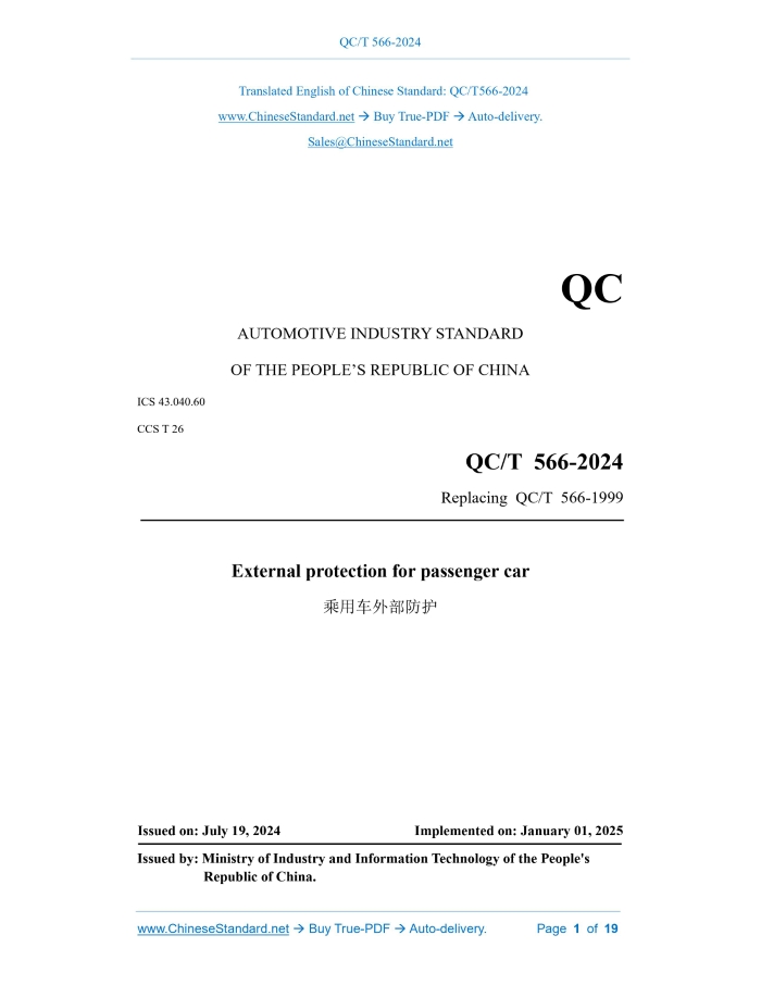 QC/T 566-2024: External protection for passenger car Delivery: 9 seconds. True-PDF full-copy in English & invoice will be downloaded + auto-delivered via email. See step-by-step procedure Status: Valid QC/T 566: Historical versions