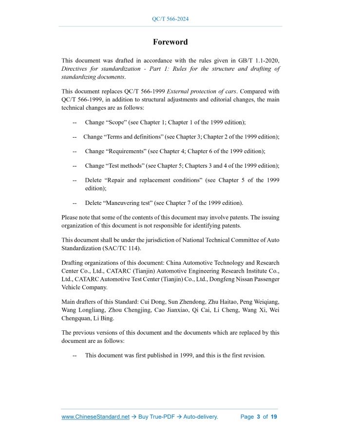 QC/T 566-2024: External protection for passenger car---This is an excerpt. Full copy of true-PDF in English version (including equations, symbols, images, flow-chart, tables, and figures etc.), auto-downloaded/delivered in 9 seconds, can be purchased online: https://www.ChineseStandard.net/PDF.aspx/QCT566-2024QC AUTOMOTIVE INDUSTRY STANDARD OF THE PEOPLE’S REPUBLIC OF CHINA ICS 43.040.60 CCS T 26 Replacing QC/T 566-1999 External protection for passenger car ISSUED ON: JULY 19, 2024 IMPLEMENTED ON: JANUARY 01, 2025 Issued by: Ministry of Industry and Information Technology of the People's Republic of China. Table of ContentsForeword ... 3 1 Scope ... 4 2 Normative references ... 4 3 Terms and definitions ... 4 4 Requirements ... 6 5 Test methods ... 6 Appendix A (Informative) Bumper barrier ... 16ForewordThis document was drafted in accordance with the rules given in GB/T 1.1-2020, Directives for standardization - Part 1: Rules for the structure and drafting of standardizing documents. This document replaces QC/T 566-1999 External protection of cars. Compared with QC/T 566-1999, in addition to structural adjustments and editorial changes, the main technical changes are as follows: -- Change “Scope” (see Chapter 1; Chapter 1 of the 1999 edition); -- Change “Terms and definitions” (see Chapter 3; Chapter 2 of the 1999 edition); -- Change “Requirements” (see Chapter 4; Chapter 6 of the 1999 edition); -- Change “Test methods” (see Chapter 5; Chapters 3 and 4 of the 1999 edition); -- Delete “Repair and replacement conditions” (see Chapter 5 of the 1999 edition); -- Delete “Maneuvering test” (see Chapter 7 of the 1999 edition). Please note that some of the contents of this document may involve patents. The issuing organization of this document is not responsible for identifying patents. This document shall be under the jurisdiction of National Technical Committee of Auto Standardization (SAC/TC 114). Drafting organizations of this document: China Automotive Technology and Research Center Co., Ltd., CATARC (Tianjin) Automotive Engineering Research Institute Co., Ltd., CATARC Automotive Test Center (Tianjin) Co., Ltd., Dongfeng Nissan Passenger Vehicle Company. Main drafters of this Standard: Cui Dong, Sun Zhendong, Zhu Haitao, Peng Weiqiang, Wang Longliang, Zhou Chengjing, Cao Jianxiao, Qi Cai, Li Cheng, Wang Xi, Wei Chengquan, Li Bing. The previous versions of this document and the documents which are replaced by this document are as follows: -- This document was first published in 1999, and this is the first revision. External protection for passenger car1 ScopeThis document specifies terms and definitions, requirements and test methods for the exterior protection for passenger car. This document is applicable to M1 vehicles, and as a reference to other vehicles.2 Normative referencesThe following documents are referred to in the text in such a way that some or all of their content constitutes requirements of this document. For dated references, only the version corresponding to that date is applicable to this document; for undated references, the latest version (including all amendments) is applicable to this document. GB/T 18385, Electric vehicles - Power performance - Test method GB/T 31498-2021 Post crash safety requirement for electric vehicle3 Terms and definitionsFor the purposes of this document, the following terms and definitions apply. 3.1 bumper beam Structural device used to mitigate damage caused by frontal and rear impacts on the vehicle. Note: Usually installed at the ends of the left and right longitudinal beams of the vehicle. 3.2 protection system Internally mounted components and devices used to restrain occupants. 3.3 vehicle width Width of the vehicle measured at the fenders.4 Requirements4.1 Static requirements for bumper 4.1.1 Effective height of bumper beam After completing the static tests for bumper in 5.2.1 ~ 5.2.3, the effective overlap dimension of the bumper beam shall not be less than 75 mm; if the effective overlap dimension of the bumper beam is less than 75 mm, the effective height of the bumper beam shall not be less than 100 mm. 4.1.2 Effective width ratio of bumper beam After completing the static tests for bumper in 5.2.4 ~ 5.2.6, the effective width ratio of the bumper beam shall not be less than 70%. 4.2 Bumper dynamic and low-speed collision requirements After the vehicle has completed the bumper dynamic test and low-speed collision test specified in 5.3 and 5.4 respectively, it shall meet the following requirements: a) The front and rear windscreens and the left and right door glasses shall be free of damage; b) The door shall open normally; c) The vehicle's fuel supply system and cooling system shall be leak-free, and its sealing devices and oil and water tank covers shall work properly; for hybrid and battery electric vehicles, after the collision test, the vehicle's power high- voltage system including the rechargeable electrical energy storage system (REESS) and the high-voltage components connected to it shall comply with the anti-electric shock protection requirements, electrolyte leakage requirements and REESS requirements in GB/T 31498-2021; d) The left and right longitudinal beams shall not be bent or crushed, and damage to the end surface of the longitudinal beam is allowed; e) The protection system (seat belts, airbags) and active engine hood shall not be in an irrecoverable state.5 Test methods5.1 Test preparation 5.1.1 Test facilities The test area shall be large enough to accommodate the runway, barriers and technical equipment necessary for the test. The runway at least 5 m in front of the barrier shall be flat, dry and clean. 5.1.2 Test vehicle mass 5.1.2.1 The fuel tank (if any) shall be filled with fuel accounting for 90% ~ 95% of the total capacity or with water accounting for 90% of the fuel mass when the fuel tank is full as specified by the manufacturer, with a tolerance of ±1%. 5.1.2.2 The air conditio