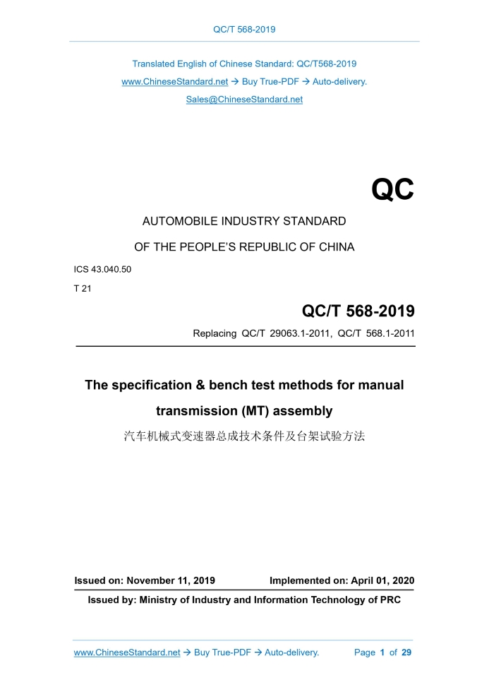 QC/T 568-2019: The specification and bench test methods for manual transmission (MT) assembly Delivery: 9 seconds. True-PDF full-copy in English & invoice will be downloaded + auto-delivered via email. See step-by-step procedure Status: Valid QC/T 568: Historical versions
