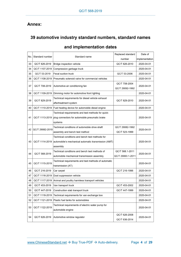 QC/T 568-2019: The specification and bench test methods for manual transmission (MT) assembly---This is an excerpt. Full copy of true-PDF in English version (including equations, symbols, images, flow-chart, tables, and figures etc.), auto-downloaded/delivered in 9 seconds, can be purchased online: https://www.ChineseStandard.net/PDF.aspx/QCT568-2019QC AUTOMOBILE INDUSTRY STANDARD OF THE PEOPLE’S REPUBLIC OF CHINA ICS 43.040.50 T 21 Replacing QC/T 29063.1-2011, QC/T 568.1-2011 The specification & bench test methods for manual transmission (MT) assembly ISSUED ON: NOVEMBER 11, 2019 IMPLEMENTED ON: APRIL 01, 2020 Issued by: Ministry of Industry and Information Technology of PRC Annex: 39 automotive industry standard numbers, standard names and implementation dates No. Standard number Standard name Replaced standard number Date of implementation 33 QC/T 826-2019 Bridge inspection vehicle QC/T 826-2010 2020-04-01 34 QC/T 1107-2019 Compression garbage truck 2020-04-01 35 QC/T 53-2019 Fecal suction truck QC/T 53-2006 2020-04-01 36 QC/T 1108-2019 Pneumatic solenoid valve for commercial vehicles 2020-04-01 37 QC/T 708-2019 Automotive air conditioning fan QC/T 708-2004 QC/T 29092-1992 2020-04-01 38 QC/T 1109-2019 Dimming motor for automotive front lighting 2020-04-01 39 QC/T 829-2019 Technical requirements for diesel vehicle exhaust aftertreatment system QC/T 829-2010 2020-04-01 40 QC/T 1110-2019 Fuel heating device for automobile diesel engine 2020-04-01 41 QC/T 1113-2019 Technical requirements and test methods for quick- plug connectors for automobile pneumatic brake systems 2020-04-01 42 QC/T 29082-2019 Technical conditions of automobile drive shaft assembly and bench test method QC/T 29082-1992 QC/T 523-1999 2020-04-01 43 QC/T 1114-2019 Technical conditions and bench test methods for automobile’s mechanical automatic transmission (AMT) assembly 2020-04-01 44 QC/T 568-2019 Technical conditions and bench test methods of automobile mechanical transmission assembly QC/T 568.1-2011 QC/T 29063.1-2011 2020-04-01 45 QC/T 1115-2019 Technical requirements and test methods of automatic transmission (AT) 2020-04-01 46 QC/T 216-2019 Car carpet QC/T 216-1996 2020-04-01 47 QC/T 1116-2019 Dust suppression vehicle 2020-04-01 48 QC/T 1117-2019 Animal and poultry harmless transport vehicles 2020-04-01 49 QC/T 453-2019 Van transport truck QC/T 453-2002 2020-04-01 50 QC/T 447-2019 Construction slab transport truck QC/T 447-1999 2020-04-01 51 QC/T 1118-2019 Technical requirements for van exchange box 2020-04-01 52 QC/T 1121-2019 Plastic fuel tanks for automobiles 2020-04-01 53 QC/T 1122-2019 Technical requirements of electric water pump for automobile engine 2020-04-01 54 QC/T 626-2019 Automotive window regulator QC/T 626-2008 QC/T 636-2014 2020-04-01 Table of ContentsForeword ... 7 1 Scope ... 9 2 Normative references ... 9 3 Terms and definitions ... 10 4 Technical conditions ... 10 5 Bench test method ... 13 The specification & bench test methods for manual transmission (MT) assembly1 ScopeThis standard specifies the technical conditions of for manual transmission (MT) assembly and the corresponding bench test methods of automobile. This standard is applicable to categories M and N automotive manual transmission (MT) assembly (hereinafter referred to as transmissions).2 Normative referencesThe following documents are essential to the application of this document. For the dated documents, only the versions with the dates indicated are applicable to this document; for the undated documents, only the latest version (including all the amendments) is applicable to this standard. GB/T 2828.1 Sampling procedures for inspection by attributes - Part 1: Sampling schemes indexed by acceptance quality limit (AQL) for lot-by-lot inspection GB/T 6461 Methods for corrosion testing of metallic and other inorganic coatings on metallic substrates - Rating of test specimens and manufactured articles subjected to corrosion tests GB/T 10125 Corrosion tests in artificial atmospheres - Salt spray tests GB/T 15089 Classification of power-driven vehicles and trailers GB/T 30512 Requirements for prohibited substances on automobiles QC/T 465 Automotive mechanical transmission terminology and definition QC/T 941 Test method for mercury in automobile materials QC/T 942 Test method for hexavalent chromium in automobile materials QC/T 943 Test method for lead and cadmium in automobile materials QC/T 944 Test method for poly-brominated biphenyls (PBBs) and poly- brominated diphenyl ethers (PBDEs) in automobile materials The assembly shall be free of rust. If necessary, the exposed surface of the assembly shall be subject to anti-rust treatment. The anti-rust grade shall meet the requirements of GB/T 6461. 4.3 Cleanliness The cleanliness of the non-disassembled transmission assembly shall be calculated according to formula (1): Where: G - The actual measured impurity mass of the transmission assembly, K - Objective evaluation coefficient of cleanliness, i.e., impurity content per liter of lubricating oil, mg/L; the allowable K value is as shown in Table 1; Le - The rated volume of lubricating oil for transmission assembly, L. Table 1 -- Allowable K value Automobile type Allowable K value Category M1 50 Category M2, category M3, category N Without additional transmission 50 With additional transmission 60 4.4 Fatigue life Complete the test according to the method specified in 5.5. During the test, there shall be no abnormal noise, oil leakage, etc., meanwhile the main parts and components shall not be damaged, such as fracture, pitting, peeling, jamming, etc. (for tooth surface pitting, passenger vehicle: single tooth surface's accumulative pitting area is more than 4 mm2 or the depth exceeds 0.5 mm; commercial vehicles: A single pitting area exceeds 4 mm2, or a single tooth surface's accumulative pitting area exceeds 20% of a single tooth surface). 4.5 Shift life For the transmission with synchronizer, the test shall be completed according