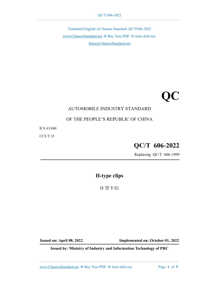 QC/T 606-2022: H-type clips Delivery: 9 seconds. True-PDF full-copy in English & invoice will be downloaded + auto-delivered via email. See step-by-step procedure Status: Valid QC/T 606: Historical versions
