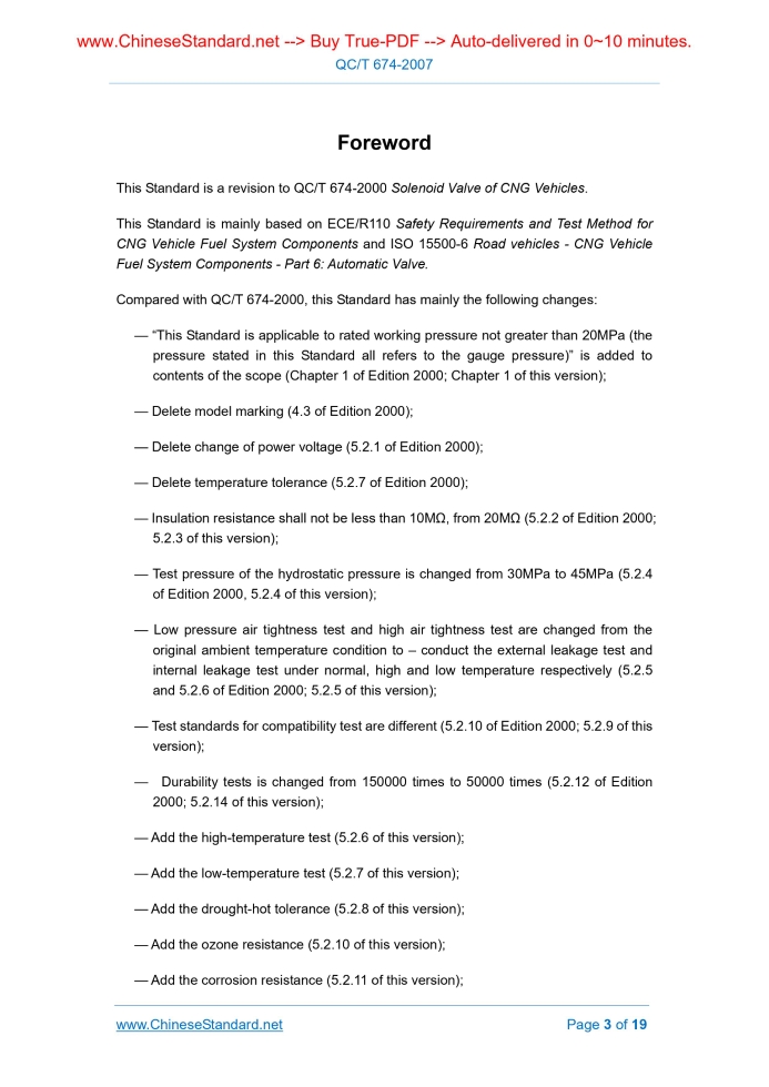 QC/T 674-2007: Solenoid valve of CNG vehicles---This is an excerpt. Full copy of true-PDF in English version (including equations, symbols, images, flow-chart, tables, and figures etc.), auto-downloaded/delivered in 9 seconds, can be purchased online: https://www.ChineseStandard.net/PDF.aspx/QCT674-2007QC AUTOMOBILE INDUSTRY STANDARD ICS 43.080.99 T47 Replacing QC/T 674-2000 Solenoid Valve of CNG Vehicles Issued on: NOVEMBER 14, 2007 Implemented on: MAY 1, 2008 Issued by. National Development and Reform Committee Table of ContentsForeword... 3 1 Scope... 5 2 Normative references... 5 3 Terms and definitions... 6 4 Types and basic parameters... 6 5 Requirements... 7 6 Test methods... 10 7 Inspection rules... 16 8 Mark, packaging, transportation and storage... 17 9 Exit-factory documents... 18ForewordThis Standard is a revision to QC/T 674-2000 Solenoid Valve of CNG Vehicles. This Standard is mainly based on ECE/R110 Safety Requirements and Test Method for CNG Vehicle Fuel System Components and ISO 15500-6 Road vehicles - CNG Vehicle Fuel System Components - Part 6.Automatic Valve. Compared with QC/T 674-2000, this Standard has mainly the following changes. — “This Standard is applicable to rated working pressure not greater than 20MPa (the pressure stated in this Standard all refers to the gauge pressure)” is added to contents of the scope (Chapter 1 of Edition 2000; Chapter 1 of this version); — Delete model marking (4.3 of Edition 2000); — Delete change of power voltage (5.2.1 of Edition 2000); — Delete temperature tolerance (5.2.7 of Edition 2000); — Insulation resistance shall not be less than 10MΩ, from 20MΩ (5.2.2 of Edition 2000; 5.2.3 of this version); — Test pressure of the hydrostatic pressure is changed from 30MPa to 45MPa (5.2.4 of Edition 2000, 5.2.4 of this version); — Low pressure air tightness test and high air tightness test are changed from the original ambient temperature condition to – conduct the external leakage test and internal leakage test under normal, high and low temperature respectively (5.2.5 and 5.2.6 of Edition 2000; 5.2.5 of this version); — Test standards for compatibility test are different (5.2.10 of Edition 2000; 5.2.9 of this version); — Durability tests is changed from 150000 times to 50000 times (5.2.12 of Edition 2000; 5.2.14 of this version); — Add the high-temperature test (5.2.6 of this version); — Add the low-temperature test (5.2.7 of this version); — Add the drought-hot tolerance (5.2.8 of this version); — Add the ozone resistance (5.2.10 of this version); — Add the corrosion resistance (5.2.11 of this version); Solenoid Valve of CNG Vehicles1 ScopeThis Standard specifies the type, basic parameters, requirements, test methods, inspection rules, mark, package, transportation and storage of solenoid valves of CNG vehicles (its definition is in GB/T 17895). This Standard is applicable to the solenoid valve that controls the open-close functions in compressed natural gas supply system of the gas vehicle, of which the working medium of compressed natural gas for vehicles meets the requirements of GB 18047, the operation environment is that - the working pressure is not greater than 20MPa (The pressure stated in this Standard all refers to the gauge pressure), the environment temperature is -40°C~+120°C, and the relative humidity is 5%~100%.2 Normative referencesThe provisions in following documents become the provisions of this Standard through reference in this Standard. For dated references, the subsequent amendments (excluding corrigendum) or revisions do not apply to this Standard, however, parties who reach an agreement based on this Standard are encouraged to study if the latest versions of these documents are applicable. For undated references, the latest edition of the referenced document applies. GB/T 191 Packaging - Pictorial markings for handling of goods GB/T 528 Rubber, vulcanized or thermoplastic - Determination of tensile stress-strain properties GB/T 7762 Rubber, vulcanized or thermoplastic - Resistance to ozone cracking - Static strain test GB 9969.1 General principles for preparation of instructions for use of industrial products GB/T10125 Corrosion tests in artificial atmospheres - Salt spray tests GB/T17895 Natural gas vehicle and liquefied petroleum gas vehicle - Vocabulary GB 18047 Compressed natural gas as vehicle fuel GB/T 19240 Mounting requirements of special equipment for compressed natural vehicles 5.2.1 Minimum start voltage When the rated voltage of the solenoid valve is 12V (DC), its minimum start voltage shall be 8V (DC). When its rated voltage is 24V (DC), the minimum start voltage shall be 18V (DC). When the test is done according to the test method of 6.3, the solenoid valve shall be able to work normally and no abnormal sound. 5.2.2 Over-voltage test When the test is done according to the test method of 6.4, the solenoid valve shall be able to work normally and no abnormal sound. 5.2.3 Insulation resistance When the test is done according to the test method of 6.5, the insulation resistance between the coupling end of the solenoid valve coil and the shell shall not be less than 10MΩ. 5.2.4 Hydro-static pressure When the test is done according to the test method of 6.6, there shall be no fracture or permanent deformation of the solenoid valve. 5.2.5 Leakage test 5.2.5.1 Normal temperature leakage test. When the normal temperature leakage test is done according to the test method regulated in 6.7.1, the displayed value of the pressure gauge shall not decline within one minute, or its leak rate shall not be more than 15*10-6N.m3/h. 5.2.5.2 High temperature leakage test. When the high temperature leakage test is done according to the test method regulated in 6.7.2, the displayed value of the pressure gauge shall not decline within one minute, or its leak rate shall not be more than 15*10-6N.m3/h. 5.2.5.3 Low temperature leakage test. When the low temperature leakage test is don