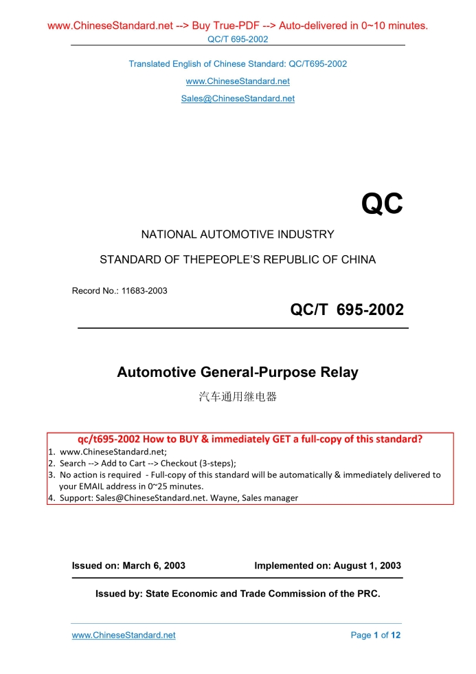Similar standardsQC/T 695-2002: Auto Universal Relay---This is an excerpt. Full copy of true-PDF in English version (including equations, symbols, images, flow-chart, tables, and figures etc.), auto-downloaded/delivered in 9 seconds, can be purchased online: https://www.ChineseStandard.net/PDF.aspx/QCT695-2002QC NATIONAL AUTOMOTIVE INDUSTRY STANDARD OF THEPEOPLE’S REPUBLIC OF CHINA Record No.. 11683-2003 Automotive General-Purpose Relay Issued on: MARCH 6, 2003 Implemented on: AUGUST 1, 2003 Issued by. State Economic and Trade Commission of the PRC. Table of ContentsForeword... 3 1 Scope... 4 2 Normative References... 4 3 Definitions... 4 4 Requirements... 5 5 Test Methods... 8 6 Inspection Rules... 10 7 Mark, Package, Storage and Preservation... 11ForewordThis Standard was prepared in accordance with the standard preparation and modification plan of National Technical Committee of Auto Standardization, combined with the development demand of domestic auto market. This Standard refers to foreign advanced auto enterprise standard like Japan in the field of technical contents. The preparation rules shall take GB/T 1.1-2000 and GB/T 1.2-2002. This Standard was proposed by China Machinery Industry Federation. This Standard shall be under the jurisdiction of National Technical Committee of Auto Standardization. Drafting organization of this Standard. Shanghai SIIC Transportation Electric Co., Ltd. Chief drafting staffs of this Standard. Liu Ye, Zhou Zuoyan, Li Cong, and Tang Fengchun. Automotive General-Purpose Relay1 ScopeThis Standard specifies the technical requirements, test methods and inspection rules, mark, package, storage and preservation of automotive general-purpose relay. This Standard is applicable to the automotive DC circuit mechanical contact type electromagnetic relay (including plug-in small general-purpose relays and other installation of relays, hereinafter referred to as relay).2 Normative ReferencesThe provisions in following documents become the provisions of this Standard through reference in this Standard. For dated references, the subsequent amendments (excluding corrigendum) or revisions do not apply to this Standard, however, parties who reach an agreement based on this Standard are encouraged to study if the latest versions of these documents are applicable. For undated references, the latest edition of the referenced document applies. GB/T 2408-1996 Plastics-Determination of the Burning Behaviour of Horizontal and Vertical Specimens in Contact with a Small-Flame Ignition Source JB/T 4159-1999 General Technical Requirements for Electric Products in the Tropics QC/T 73 Method of Compiling Model of Automobile Electric Equipment Product QC/T 78-1993 Automotive Plug-In Relay and Flasher Mounting Dimension QC/T 413-2002 Basic Technical Requirements for Automotive Electric Equipment3 DefinitionsThis Standard adopts the following definitions. 3.1 Normally open contact The contact that is in the disconnecting state, when the relay coil is not energized. 3.2 Normally closed contact stipulate din Table 1 of QC/T 413; and perform low-temperature test for 8h as per the selected lower limit storing temperature; when restoring to the room temperature, the relay’s operating voltage, release voltage and contact voltage drop shall meet the requirements of 4.6.1 and 4.6.2. 4.8.2 High-temperature resisting property The relay can work as per the requirements in the upper limit working temperature stipulate din Table 1 of QC/T 413; and perform high-temperature test for 8h as per the selected upper limit storing temperature; when restoring to the room temperature, the relay’s operating voltage, release voltage and contact voltage drop shall meet the requirements of 4.6.1 and 4.6.2. 4.8.3 Temperature-change resisting property Perform the temperature-change resisting property test as per the requirements of 3.10.3 of QC/T 413; after the completion of test and the temperature restoring to the room temperature, the relay’s operating voltage, release voltage and contact voltage drop shall meet the requirements of 4.6.1 and 4.6.2. 4.9 Product temperature-and-humidity-change resisting property Perform the temperature-and-humidity-change resisting property test as per the requirements of 3.11 of QC/T 413; after the completion of test and temperature restoring to the room temperature, the relay’s contact voltage drop shall meet the requirements of 4.6.2. 4.10 Vibration property Under non-working conditions, the installation position shall be “other positions” according to Table 3 in 3.12 of QC/T 413, the relay shall withstand sweep vibration test from three directions, namely, X, Y, Z; after the completion of test, relay shall meet the requirements of 4.6.1 and 4.6.2. 4.11 Salt spray resisting property Under non-working conditions, according to the provisions of 3.13 of QC/T 413, perform 48h salt spray test against the relay; after the completion of test, the relay’s operating voltage and release voltage shall meet the requirements of 4.6.1. 4.12 Durability The working times for relay durability shall be 100 000 times, which can also be determined by the client’s specific demand. After the durability test, the relay’s operating voltage and release voltage shall conform to the provisions of 4.6.1; compared with Table 3, the contact voltage drop can increase 50%. 5.7 Insulation and voltage resisting test Perform the insulation and voltage resisting test against the specimen according to the method stipulated in 4.8.1 of QC/T 413; which shall conform to the provisions of 4.7. 5.8 Temperature resisting property test 5.8.1 Low-temperature test Firstly, check whether the relay can start under the lower limit working temperature; then perform the low-temperature storing test according to the test methods stipulated in 4.10.1 of QC/T 413; after the completion of the test, placing the relay under room temperature for 1h, its property shall conform to the provisions of 4.8.1. 5.8.2 Hi