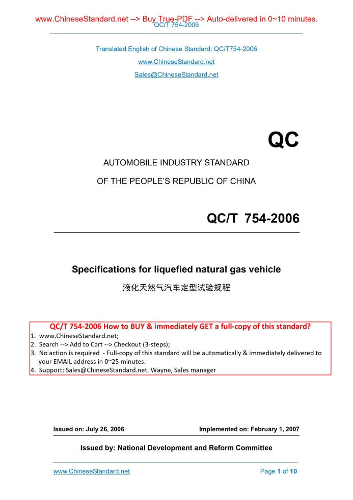 QC/T 754-2006: Specifications for liquefied natural gas vehicle---This is an excerpt. Full copy of true-PDF in English version (including equations, symbols, images, flow-chart, tables, and figures etc.), auto-downloaded/delivered in 9 seconds, can be purchased online: https://www.ChineseStandard.net/PDF.aspx/QCT754-2006QC AUTOMOBILE INDUSTRY STANDARD OF THE PEOPLE’S REPUBLIC OF CHINA Specifications for liquefied natural gas vehicle Issued on: JULY 26, 2006 Implemented on: FEBRUARY 1, 2007 Issued by. National Development and Reform Committee Table of ContentsForeword ... 3 1 Scope ... 4 2 Normative References ... 4 3 Implementation conditions ... 5 4 Test items, procedures and methods ... 6 5 Test report ... 9ForewordThis Standard is formulated for the first time. This Standard was proposed by and shall be under the jurisdiction of China Auto Standardization Committee. Drafting organization of this Standard. National Car Quality Supervision and Inspection Center. Main drafters of this Standard. ZHANG Xiaohui, Feng Yi, Chen Song, Gu Yanping, Liu Guibin, MA Zonghua and ZHANG Fuxing. This Standard shall be responsibly interpreted by China Auto Technical Committee for Standardization. Specifications for liquefied natural gas vehicle1 ScopeThis Standard specifies the type approval test’s implementation conditions, test items, procedures, methods, and contents of the test report of Liquefied Natural Gas Vehicles. This Standard is applicable to Category M and Category N vehicles, which have been type-approved, and which have been installed with special equipment for single-fuel, dual-use fuel and dual-fuel of Liquefied Natural Gas.2 Normative ReferencesThe provisions in following documents become the provisions of this Standard through reference in this Standard. For dated references, the subsequent amendments (excluding corrigendum) or revisions do not apply to this Standard, however, parties who reach an agreement based on this Standard are encouraged to study if the latest versions of these documents are applicable. For undated references, the latest edition of the referenced document applies. GB1495 Limits and measurement methods for noise emitted by accelerating motor vehicles GB 3847 Limits and measurement methods for exhaust visible pollutants from compression ignition (C.I.) engines and vehicles equipped with C.I. engines GB/T 6323.4~6323.6 Controllability and stability test procedure for automobiles GB 7258 Safety specifications for power - driven vehicles operating on roads GB/T 12535 Motor vehicles - Starting performance - Test methods GB/T 12536 Motor vehicles - Coast - down - Test method GB/T 12539 Motor vehicles - Steep hill climbing - Test method GB/T 12543 Motor vehicles - Acceleration performance - Test method GB/T 12544 Motor vehicles - Maximum speed - Test method GB/T 12545.1 Passenger car - Fuel consumption test method GB/T 12545.2 Commercial vehicle - Fuel consumption test method GB/T 12547 Motor vehicles - Minimum stable speed - Test method GB/T 12673 Motor vehicles - Basic dimensions - Measuring method GB/T 12674 Motor vehicles - Weight parameter - Measuring method GB/T 12677 Motor vehicles - Technical condition - Inspection method GB/T 12678 Reliability running test method for automobiles GB 14762 Limits and measurement methods for exhaust emissions from positive ignition (P.I.) engines of vehicles and vehicles equipped with P.I. Engines GB 17691 Limits and measurement methods for exhaust pollutants from compression ignition(C.I.) engines of vehicles GB 18285 Limits and measurement methods for exhausts of pollutants from in - use vehicles GB 18352 Limits and measurement methods for emissions of pollutants from light - duty vehicles(I) GB/T 19204 General characteristics of liquefied natural gas GB/T 20734 Mounting requirements for liquefied natural gas vehicle special equipment QC/T 755 Technology requirements of special equipment for LNG vehicle QC/T 900 - 1990 Quality test assessment method for automotive products3 Implementation conditions3.1 Sample cars for testing can apply for type approval test as long as they can meet the requirements of the design specification, the design drawing and the technical conditions. 3.2 There shall be more than two sample cars for the type approval test. 3.3 Before the type approval test, the manufacturing organization shall provide the following documents. a) Design specification and technical condition approved according to prescribed procedures; b) Assembly and adjustment technical conditions; c) Operation and maintenance instructions; d) Manufacturing and assembly adjustment records for sample cars for type approval stipulations of GB17691. 4.5 Driving inspection of motor vehicles’ technical condition shall be done in accordance with stipulations of GB/T 12677. 4.6 Vehicles’ noise measurement shall be done respectively, when all kinds of fuel are used, according to GB1495. 4.7 Coast down test shall be done according to regulations of GB/T 12536. 4.8 Dynamic test. Dynamic tests shall be done respectively, when all kinds of fuels are used. The test items shall include. 4.8.1 Minimum stable speed test of direct gear shall be done according to GB/T 12547. 4.8.2 Acceleration performance shall be tested according to GB/T 12543. The test items shall include. a) Acceleration performance test of direct gear (or common gear); b) Acceleration performance test of standing-start continuous gear shift. 4.8.3 Maximum speed test shall be done according to regulations of GB/T 12544. 4.8.4 Maximum steep hill climbing test shall be done according to regulations of GB/T 12539. 4.9 Fuel consumption test shall be done according to regulations of GB/T 12545.1 ~ GB/T 12545.2. Fuel economic performance tests shall be done respectively, when all kinds of fuels are used. Test items shall, under limited conditions, include the average fuel consumption, constant speed fuel consumption and driving-condition-mode fuel consumption. 4.10 Controllability an