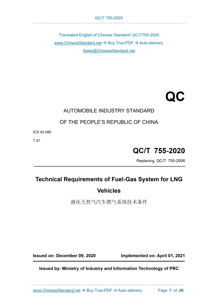 QC/T 755-2020: Technical Requirements of Fuel-Gas System for LNG Vehicles Delivery: 9 seconds. True-PDF full-copy in English & invoice will be downloaded + auto-delivered via email. See step-by-step procedure Status: Valid QC/T 755: Historical versions