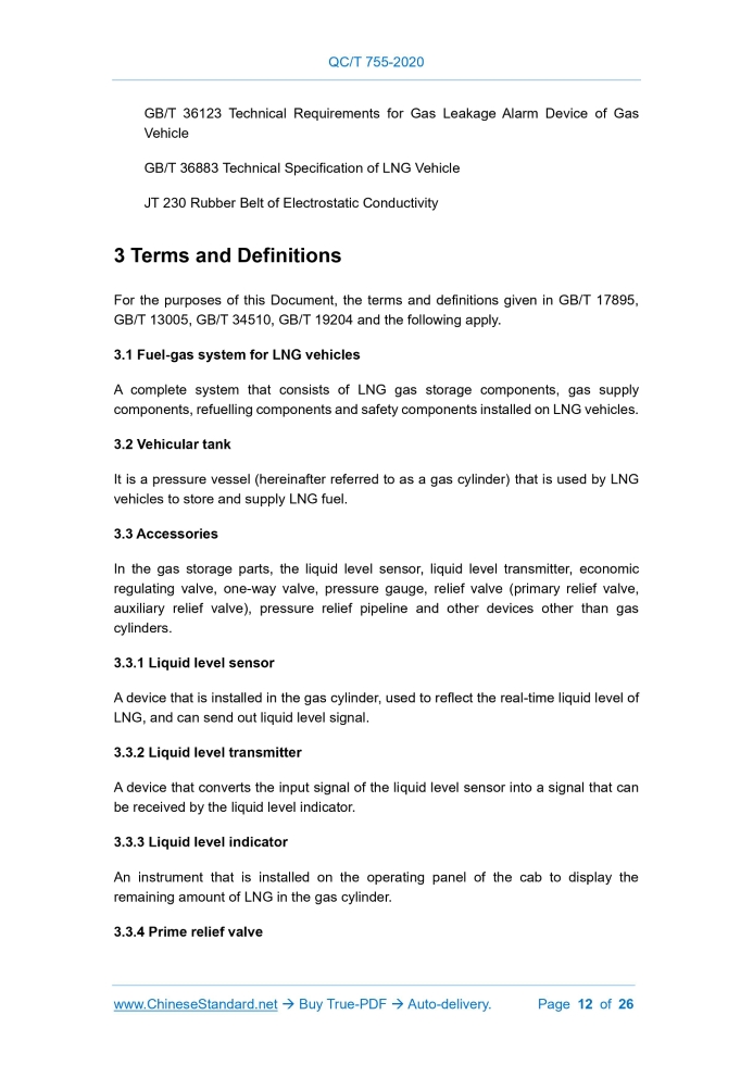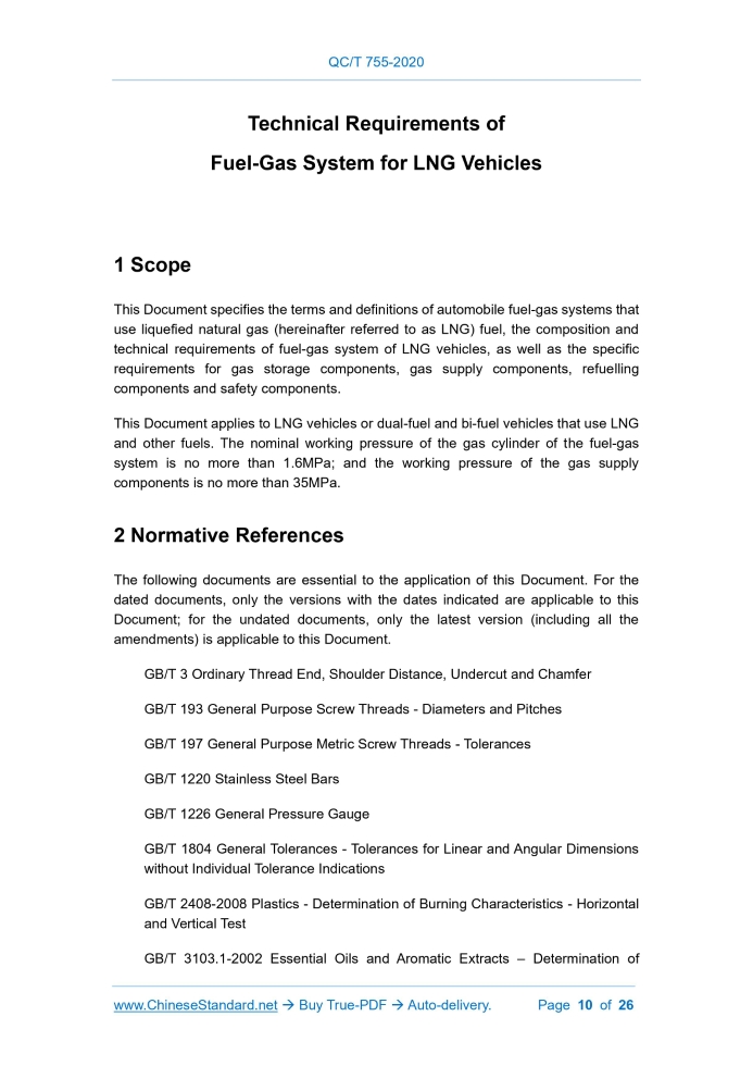 QC/T 755-2020: Technical Requirements of Fuel-Gas System for LNG Vehicles---This is an excerpt. Full copy of true-PDF in English version (including equations, symbols, images, flow-chart, tables, and figures etc.), auto-downloaded/delivered in 9 seconds, can be purchased online: https://www.ChineseStandard.net/PDF.aspx/QCT755-2020QC AUTOMOBILE INDUSTRY STANDARD OF THE PEOPLE’S REPUBLIC OF CHINA ICS 43.080 T 47 Replacing QC/T 755-2006 Technical Requirements of Fuel-Gas System for LNG Vehicles ISSUED ON: DECEMBER 09, 2020 IMPLEMENTED ON: APRIL 01, 2021 Issued by: Ministry of Industry and Information Technology of PRC Technical Requirements of Fuel-Gas System for LNG Vehicles 1 ScopeThis Document specifies the terms and definitions of automobile fuel-gas systems that use liquefied natural gas (hereinafter referred to as LNG) fuel, the composition and technical requirements of fuel-gas system of LNG vehicles, as well as the specific requirements for gas storage components, gas supply components, refuelling components and safety components. This Document applies to LNG vehicles or dual-fuel and bi-fuel vehicles that use LNG and other fuels. The nominal working pressure of the gas cylinder of the fuel-gas system is no more than 1.6MPa; and the working pressure of the gas supply components is no more than 35MPa.2 Normative ReferencesThe following documents are essential to the application of this Document. For the dated documents, only the versions with the dates indicated are applicable to this Document; for the undated documents, only the latest version (including all the amendments) is applicable to this Document. GB/T 3 Ordinary Thread End, Shoulder Distance, Undercut and Chamfer GB/T 193 General Purpose Screw Threads - Diameters and Pitches GB/T 197 General Purpose Metric Screw Threads - Tolerances GB/T 1220 Stainless Steel Bars GB/T 1226 General Pressure Gauge GB/T 1804 General Tolerances - Tolerances for Linear and Angular Dimensions without Individual Tolerance Indications GB/T 2408-2008 Plastics - Determination of Burning Characteristics - Horizontal and Vertical Test GB/T 3103.1-2002 Essential Oils and Aromatic Extracts – Determination of GB/T 36123 Technical Requirements for Gas Leakage Alarm Device of Gas Vehicle GB/T 36883 Technical Specification of LNG Vehicle JT 230 Rubber Belt of Electrostatic Conductivity3 Terms and DefinitionsFor the purposes of this Document, the terms and definitions given in GB/T 17895, GB/T 13005, GB/T 34510, GB/T 19204 and the following apply. 3.1 Fuel-gas system for LNG vehicles A complete system that consists of LNG gas storage components, gas supply components, refuelling components and safety components installed on LNG vehicles. 3.2 Vehicular tank It is a pressure vessel (hereinafter referred to as a gas cylinder) that is used by LNG vehicles to store and supply LNG fuel. 3.3 Accessories In the gas storage parts, the liquid level sensor, liquid level transmitter, economic regulating valve, one-way valve, pressure gauge, relief valve (primary relief valve, auxiliary relief valve), pressure relief pipeline and other devices other than gas cylinders. 3.3.1 Liquid level sensor A device that is installed in the gas cylinder, used to reflect the real-time liquid level of LNG, and can send out liquid level signal. 3.3.2 Liquid level transmitter A device that converts the input signal of the liquid level sensor into a signal that can be received by the liquid level indicator. 3.3.3 Liquid level indicator An instrument that is installed on the operating panel of the cab to display the remaining amount of LNG in the gas cylinder. 3.3.4 Prime relief valve relief valve (primary relief valve, auxiliary relief valve), pressure relief pipeline and venting globe valves, etc., and can be equipped with pressure sensors. For gas storage components with forced liquid supply function, it shall also include forced liquid supply, control and driving devices; --- Gas supply components shall include liquid supply shutoff valve, supply line flow regulation valve, liquid supply pipeline (pipeline and loose joints, etc.) and vaporizer, one-way valve, pressure reducing regulator, solenoid valve, pressure gauge, etc., and can be equipped with buffer tank, gas temperature control device, gas recovery device and pressure sensor and other components; --- Refilling components shall include filling port, air return port, connecting pipeline and one-way valve, etc.; --- Safety components shall include gas leakage alarm devices, gas cylinder protection devices and rubber belt of electrostatic conductivity for motor vehicle, etc. 5 Technical Requirements for Fuel-Gas System 5.1 General requirements 5.1.1 The fuel gas system shall be manufactured in accordance with the product drawings and other technical documents approved by the prescribed procedures; and shall comply with the provisions of GB/T 36883. 5.1.2 All components in the fuel gas system shall have operating conditions and quality inspection certificates provided by the manufacturer; and the explosion-proof performance of electrical components shall comply with the provisions of GB 3836.1. 5.1.3 The installation of the fuel gas system shall comply with the provisions of GB/T 20734 and GB 19239. 5.1.4 When one of the following situations occurs, the fuel gas system shall be able to automatically cut off the LNG supply: a) The ignition switch is not turned on; b) The engine is not running; c) The LNG gas supply pipeline is broken, falling off, etc. 5.1.5 The gas cylinders in the fuel gas system shall be able to adapt to the working environment temperature requirements specified in GB/T 34510-2017. Other parts and components shall be able to adapt to the respective working environment temperature the joint should be a double-ferrule joint or end face sealing joint. 5.4.3 The test pressure of the fuel gas hose and the circulating water hose shall be twice the working pressure; and the burst pressure shall be no less than 4 times