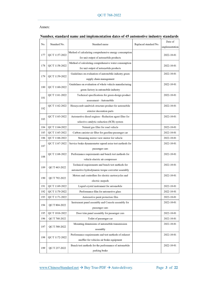 QC/T 768-2022: Coach toilet---This is an excerpt. Full copy of true-PDF in English version (including equations, symbols, images, flow-chart, tables, and figures etc.), auto-downloaded/delivered in 9 seconds, can be purchased online: https://www.ChineseStandard.net/PDF.aspx/QCT768-2022QC AUTOMOBILE INDUSTRY STANDARD OF THE PEOPLE’S REPUBLIC OF CHINA ICS 43.040.40 CCS T 24 Replacing QC/T 768-2006 Coach toilet ISSUED ON: APRIL 08, 2022 IMPLEMENTED ON: OCTOBER 01, 2022 Issued by: Ministry of Industry and Information Technology of PRC Table of ContentsForeword ... 6 1 Scope ... 8 2 Normative references ... 8 3 Terms and definitions ... 9 4 Classification and basic configuration ... 10 5 General requirements ... 11 6 Performance requirements ... 14 7 Test method ... 17 8 Inspection rules ... 20 9 Labeling, packaging, transportation, storage ... 21 Coach toilet1 ScopeThis document stipulates the classification, basic configuration, general requirements, test methods, inspection rules and marking, packaging, transportation, storage of coach toilets. This document applies to toilets used on coaches.2 Normative referencesThe contents of the following documents constitute the essential provisions of this document through normative references in the text. Among them, for dated references, only the version corresponding to the date is applicable to this document; for undated references, the latest version (including all amendments) is applicable to this document. GB/T 191 Packaging - Pictorial marking for handling of goods GB/T 1236 Industrial fan - Performance testing using standardized airways GB/T 2423.10-2019 Environmental testing - Part 2: Test methods - Test Fc: Vibration (sinusoidal) GB/T 2423.22-2012 Environmental testing - Part 2: Tests methods - Test N: Change of temperature GB/T 4892 Dimensions of rigid rectangular transport packages GB/T 6461 Methods for corrosion testing of metallic and other inorganic coatings on metallic substrates - Rating of test specimens and manufactured articles subjected to corrosion tests GB/T 10125-2021 Corrosion tests in artificial atmospheres - Salt spray tests GB/T 13095 Toilet unit GB/T 17729 Hygienic standard for the air quality inside long distance coach GB/T 18655-2018 Vehicles, boats and internal combustion engines - Radio disturbance characteristics - Limits and methods of measurement for the protection of on-board receivers GB/T 21437.2-2008 Road vehicles - Electrical disturbances from conduction and coupling - Part 2: Electrical transient conduction along supply lines only GB/T 21437.3-2012 Road vehicles - Electrical disturbances from conduction and coupling - Part 3: Electrical transient transmission by capacitive and inductive coupling via lines other than supply lines GB/T 28370 Detect methods for the air quality inside long distance coach GB/T 30512 Requirements for prohibited substances on automobiles GB/T 33014.2-2016 Road vehicles - Component test methods for electrical/electronic disturbances from narrowband radiated electromagnetic energy - Part 2: Absorb-lined shielded enclosure GB/T 33014.4-2016 Road vehicles - Component test methods for electrical/electronic disturbances from narrowband radiated electromagnetic energy - Part 4: Bulk current injection (BCI) GB 38262 Flammability of interior materials for buses QC/T 414 Design rule of color and type code for automotive cables QC/T 29106 Technical specification of automobile wire harness ISO 10605:2008 Road vehicles - Test methods for electrical disturbances from electrostatic discharge ISO 11452-8:2015 Road vehicles - Component test methods for electrical disturbances from narrowband radiated electromagnetic energy - Part 8: Immunity to magnetic fields VDA 270 Test method for odor test of non-metallic materials VDA 275 Test method for formazan content of non-metallic materials VDA 277 Test method for volatile organic compounds in non-metallic materials3 Terms and definitionsThe following terms and definitions apply to this document. 3.1 Fresh water tank Containers for storing clean water in coach toilets. two types: electric control waste water discharge and manual waste water discharge. 4.1.4 According to the way of toilet flushing, there are two types of toilets: manual flushing and automatic induction flushing. 4.2 Basic configuration The basic configuration of the toilet shall include: a) Sitting (squatting) toilet; b) Waste water discharge device: Waste water valve, waste water tank, waste container, waste water discharge button or pedal; c) Water purification device: Clean water tank, water pump, water inlet pipe, water inlet pipe connector, faucet and other switches; d) Hand washing device: Hand washing sink, hand sanitizer container; e) Tissue storage rack (box); f) Forced exhaust; g) Lighting devices: Lamps, lines, switches, safety devices, etc.; h) Alarm device: Safety (SOS) alarm, clean (or waste) water tank water level alarm, smoke alarm, high temperature alarm; i) Safety handrails (inner and outer); j) Door locks; k) Mirrors (safety glass shall be used); l) Use status identification; m) Control device: Integrated circuit board module, induction probe; n) Coat hooks (with safety protection functions such as rebound or folding); o) If it is used in an alpine area, it is necessary to add a heating device. At the same time, the fresh and waste water tanks need to be equipped with a heating device and the surface needs to be thermal insulated.5 General requirements5.1 The electric-plating and painting surfaces of the metal parts in the toilet shall be smooth without falling off; the weld seams shall be uniform; there shall be no defects such as rust, scars or pores. 5.2 The exposed parts of the toilet body and all parts shall have smooth surface, uniform color, neat edge, smooth transition of rounded corners, without defects such as cracks, bubbles, burrs, wrinkles, scratches. There shall be no sharp corners, sharp edges or other structures or defects that are likely to cause hum
