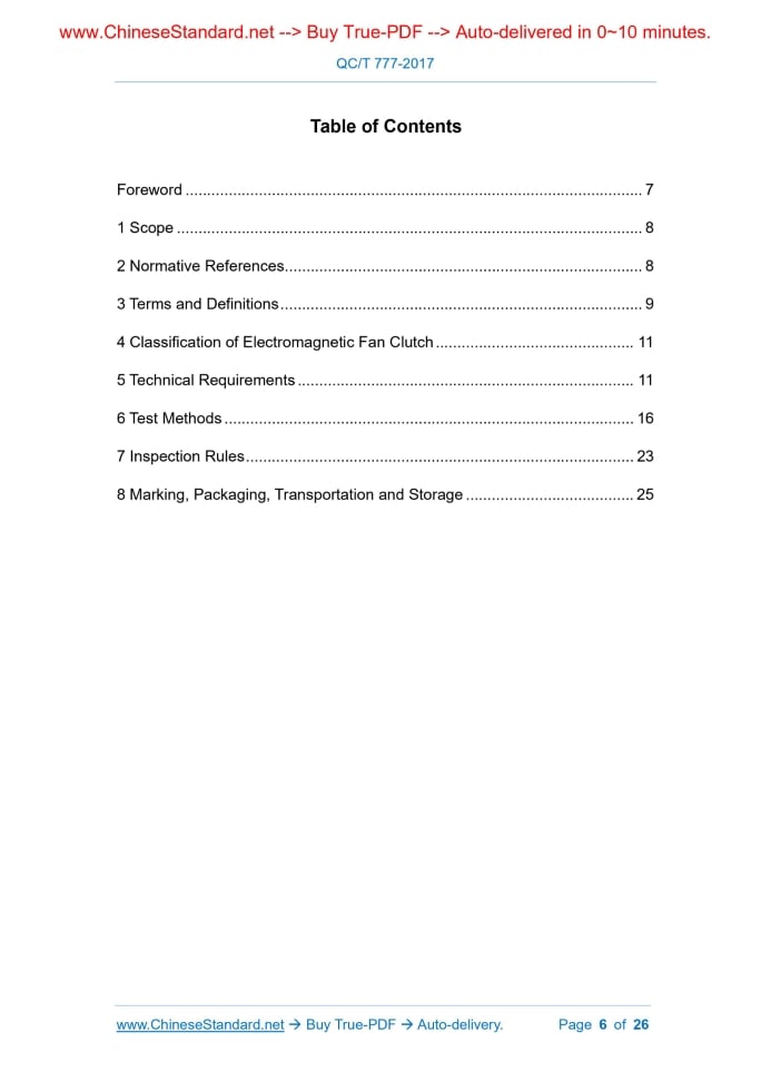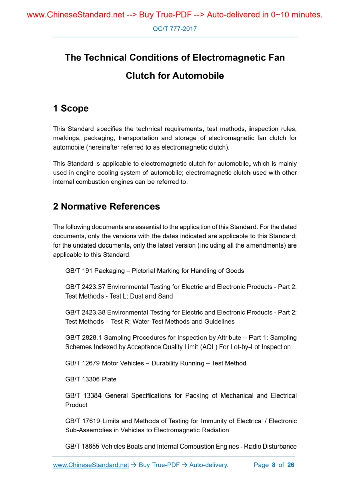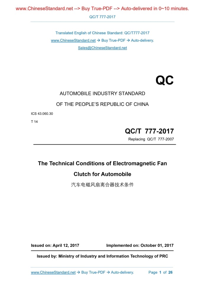 QC/T 777-2017: The Technical Conditions of Electromagnetic Fan Clutch for Automobile---This is an excerpt. Full copy of true-PDF in English version (including equations, symbols, images, flow-chart, tables, and figures etc.), auto-downloaded/delivered in 9 seconds, can be purchased online: https://www.ChineseStandard.net/PDF.aspx/QCT777-2017AUTOMOBILE INDUSTRY STANDARD OF THE PEOPLE’S REPUBLIC OF CHINA ICS 43.060.30 T 14 Replacing QC/T 777-2007 The Technical Conditions of Electromagnetic Fan Clutch for Automobile ISSUED ON: APRIL 12, 2017 IMPLEMENTED ON: OCTOBER 01, 2017 Issued by: Ministry of Industry and Information Technology of PRC Table of ContentsForeword ... 7 1 Scope ... 8 2 Normative References ... 8 3 Terms and Definitions ... 9 4 Classification of Electromagnetic Fan Clutch ... 11 5 Technical Requirements ... 11 6 Test Methods ... 16 7 Inspection Rules ... 23 8 Marking, Packaging, Transportation and Storage ... 25 The Technical Conditions of Electromagnetic Fan Clutch for Automobile1 ScopeThis Standard specifies the technical requirements, test methods, inspection rules, markings, packaging, transportation and storage of electromagnetic fan clutch for automobile (hereinafter referred to as electromagnetic clutch). This Standard is applicable to electromagnetic clutch for automobile, which is mainly used in engine cooling system of automobile; electromagnetic clutch used with other internal combustion engines can be referred to.2 Normative ReferencesThe following documents are essential to the application of this Standard. For the dated documents, only the versions with the dates indicated are applicable to this Standard; for the undated documents, only the latest version (including all the amendments) are applicable to this Standard. GB/T 191 Packaging – Pictorial Marking for Handling of Goods GB/T 2423.37 Environmental Testing for Electric and Electronic Products - Part 2: Test Methods - Test L: Dust and Sand GB/T 2423.38 Environmental Testing for Electric and Electronic Products - Part 2: Test Methods – Test R: Water Test Methods and Guidelines GB/T 2828.1 Sampling Procedures for Inspection by Attribute – Part 1: Sampling Schemes Indexed by Acceptance Quality Limit (AQL) For Lot-by-Lot Inspection GB/T 12679 Motor Vehicles – Durability Running – Test Method GB/T 13306 Plate GB/T 13384 General Specifications for Packing of Mechanical and Electrical Product GB/T 17619 Limits and Methods of Testing for Immunity of Electrical / Electronic Sub-Assemblies in Vehicles to Electromagnetic Radiation GB/T 18655 Vehicles Boats and Internal Combustion Engines - Radio Disturbance Characteristics - Limits and Methods of Measurement for the Protection of on- Board Receivers GB/T 4942.1 Degrees of Protection Provided by the Integral Design of Rotating Electrical Machined (IP Code)-Classification GB/T 4942.2 Low Voltage Electrical Enclosure Protection Class JB/T 4159 General Technical Requirements of Electric Products for Tropical Environment QC/T 238 Storage and Preservation for Automotive Parts QC/T 29106 Technical Specification of Low-Voltage Electric Harness for Motor Vehicles QC/T 413 Basic Technical Requirements for Automotive Electric Equipment QC/T 625-2013 Metallic Coatings and Conversion Coatings for Automobiles3 Terms and DefinitionsFor the purpose of this Standard, the following terms and definitions apply. 3.1 Engaged temperature The temperature of the cooling medium when controlling the combination of electromagnetic clutch driving disc with the driven disc. 3.2 Disengaged temperature The temperature of the cooling medium when controlling the separation of the electromagnetic clutch driving disc from the driven disc. 3.3 Engaged state At the engaged temperature, the combined state of the electromagnetic clutch driving disc with the driven disc. 3.4 Disengaged state At the disengaged temperature, the separated state of the electromagnetic clutch driving disk from the driven disk. 3.5 Engaged gap The distance between the driving disk and the driven disk when the electromagnetic 3.15 Disengaged voltage When the circuit is on, the voltage when the electromagnetic clutch driving disc disengages from the driven disc. 3.16 Single stage electromagnetic clutch The electromagnetic clutch, by turning on/off a winding circuit, that combines or separates the driving disc and the driven disc. 3.17 Multistage electromagnetic clutch The electromagnetic clutch, control multiple sets of winding circuits on/off in order, that realizes the multiple working states of the driving disc and driven disc, such as from follow operation, non-synchronized operation to synchronized operation or stepwise separation from the driving disc.4 Classification of Electromagnetic Fan Clutch4.1 It can be divided into two types of with and without brush according to the structure. 4.2 It can be divided into two types of single stage and multistage according to the work shift. 4.3 It can be divided into two voltage specifications of 12V and 24V according to the rated voltage.5 Technical Requirements5.1 General requirements 5.1.1 The product shall be manufactured according to the product drawings and technical documents approved by the prescribed procedures, and shall conform to the provisions of this Standard. 5.1.2 The product drawings and technical documents of the electromagnetic clutch shall specify: product model, rated voltage, initial static friction torque, performance parameters of electrical components, rotation direction and tightening torque of mechanical fasteners, etc. 5.1.3 The product is not allowed to have defects that affect the performance. The parts of the electromagnetic clutch are not allowed to have defects such as burrs, damage, rust, cracks, etc. 1min without breakdown. 5.2.9 Insulation heat resistance. The insulation heat resistance of the electrical components of the electromagnetic clutch must be no lower than Class F; and the temperature rise of the winding coil shall be no greate
