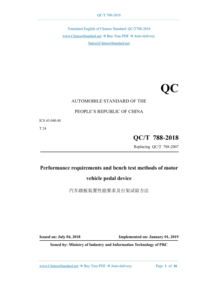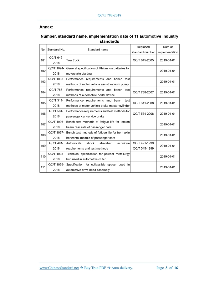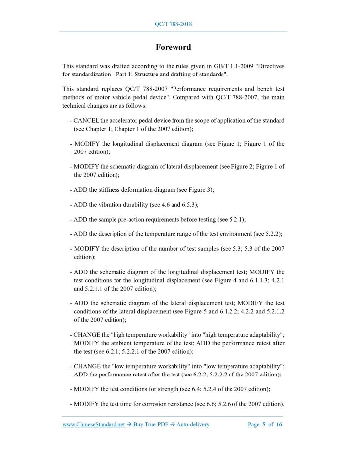 QC/T 788-2018: Performance requirements and bench test methods of automobile pedal device---This is an excerpt. Full copy of true-PDF in English version (including equations, symbols, images, flow-chart, tables, and figures etc.), auto-downloaded/delivered in 9 seconds, can be purchased online: https://www.ChineseStandard.net/PDF.aspx/QCT788-2018QC AUTOMOBILE STANDARD OF THE PEOPLE’S REPUBLIC OF CHINA ICS 43.040.40 T 24 Replacing QC/T 788-2007 Performance requirements and bench test methods of motor vehicle pedal device ISSUED ON: JULY 04, 2018 IMPLEMENTED ON: JANUARY 01, 2019 Issued by: Ministry of Industry and Information Technology of PRC Annex: Number, standard name, implementation date of 11 automotive industry standards No. Standard No. Standard name Replaced standard number Date of implementation 101 QC/T 645-2018 Tow truck QC/T 645-2005 2019-01-01 102 QC/T 1094-2018 General specification of lithium ion batteries for motorcycle starting 2019-01-01 103 QC/T 1095-2018 Performance requirements and bench test methods of motor vehicle assist vacuum pump 2019-01-01 104 QC/T 788-2018 Performance requirements and bench test methods of automobile pedal device QC/T 788-2007 2019-01-01 105 QC/T 311-2018 Performance requirements and bench test methods of motor vehicle brake master cylinder QC/T 311-2008 2019-01-01 106 QC/T 564-2018 Performance requirements and test methods for passenger car service brake QC/T 564-2008 2019-01-01 107 QC/T 1096-2018 Bench test methods of fatigue life for torsion beam rear axle of passenger cars 2019-01-01 108 QC/T 1097-2018 Bench test methods of fatigue life for front axle horizontal module of passenger cars 2019-01-01 109 QC/T 491-2018 Automobile shock absorber technique requirements and test methods QC/T 491-1999 QC/T 545-1999 2019-01-01 110 QC/T 1098-2018 Technical specification for powder metallurgy hub used in automotive clutch 2019-01-01 111 QC/T 1099-2018 Specification for collapsible spacer used in automotive drive head assembly 2019-01-01 ForewordThis standard was drafted according to the rules given in GB/T 1.1-2009 "Directives for standardization - Part 1: Structure and drafting of standards". This standard replaces QC/T 788-2007 "Performance requirements and bench test methods of motor vehicle pedal device". Compared with QC/T 788-2007, the main technical changes are as follows: - CANCEL the accelerator pedal device from the scope of application of the standard (see Chapter 1; Chapter 1 of the 2007 edition); - MODIFY the longitudinal displacement diagram (see Figure 1; Figure 1 of the 2007 edition); - MODIFY the schematic diagram of lateral displacement (see Figure 2; Figure 1 of the 2007 edition); - ADD the stiffness deformation diagram (see Figure 3); - ADD the vibration durability (see 4.6 and 6.5.3); - ADD the sample pre-action requirements before testing (see 5.2.1); - ADD the description of the temperature range of the test environment (see 5.2.2); - MODIFY the description of the number of test samples (see 5.3; 5.3 of the 2007 edition); - ADD the schematic diagram of the longitudinal displacement test; MODIFY the test conditions for the longitudinal displacement (see Figure 4 and 6.1.1.3; 4.2.1 and 5.2.1.1 of the 2007 edition); - ADD the schematic diagram of the lateral displacement test; MODIFY the test conditions of the lateral displacement (see Figure 5 and 6.1.2.2; 4.2.2 and 5.2.1.2 of the 2007 edition); - CHANGE the "high temperature workability" into "high temperature adaptability"; MODIFY the ambient temperature of the test; ADD the performance retest after the test (see 6.2.1; 5.2.2.1 of the 2007 edition); - CHANGE the "low temperature workability" into "low temperature adaptability"; ADD the performance retest after the test (see 6.2.2; 5.2.2.2 of the 2007 edition); - MODIFY the test conditions for strength (see 6.4; 5.2.4 of the 2007 edition); - MODIFY the test time for corrosion resistance (see 6.6; 5.2.6 of the 2007 edition). Performance requirements and bench test methods of motor vehicle pedal device1 Scope1.1 This standard specifies the terms and definitions, performance requirements, test- related requirements, test methods of automobile brake pedals and clutch pedals. 1.2 This standard is applicable to mechanical hinged metal brake pedals and clutch pedals for automobiles. Other types of pedal devices can be implemented with reference to this standard.2 Normative referencesThe following documents are essential to the application of this document. For the dated documents, only the versions with the dates indicated are applicable to this document; for the undated documents, only the latest version (including all the amendments) is applicable to this standard. GB/T 5620 Road vehicles - Braking of automotive vehicles and their trailers - Vocabulary GB/T 10125-2012 Corrosion tests in artificial atmospheres - Salt spray tests3 Terms and definitionsThe terms and definitions, as defined in GB/T 5620, as well as the following terms and definitions, apply to this standard. 3.1 Pedal device A control mechanism, which is operated by the driver's feet. 3.2 Longitudinal displacement Lp1 The vertical displacement of the pedal, under the action of longitudinal force P1, in both positive and negative directions, perpendicular to the pedal surface and passing respectively. 4.3 Torsion resistance Pedals and welds shall not be cracked or damaged. 4.4 Strength The permanent deformation of the pedal device shall not be greater than 5.0 mm, meanwhile there shall be no cracks or damage. 4.5 Working durability 4.5.1 During the working durability test, the pedal device shall not be deformed to affect its function; it shall not have cracks or other abnormal conditions. 4.5.2 After the working durability test, the measured value of the longitudinal displacement of the pedal device shall not be greater than 4.0 mm; the measured value of the lateral displacement shall not be greater than 6.0 mm. 4.6 Vibration durability 4.6.1 After the vibration resista