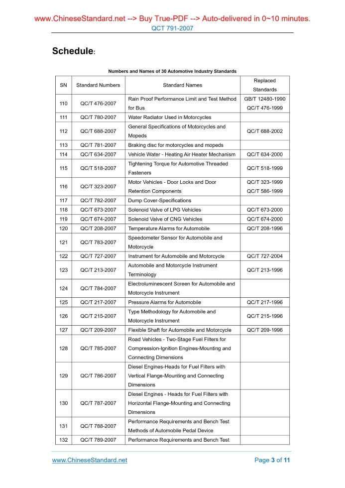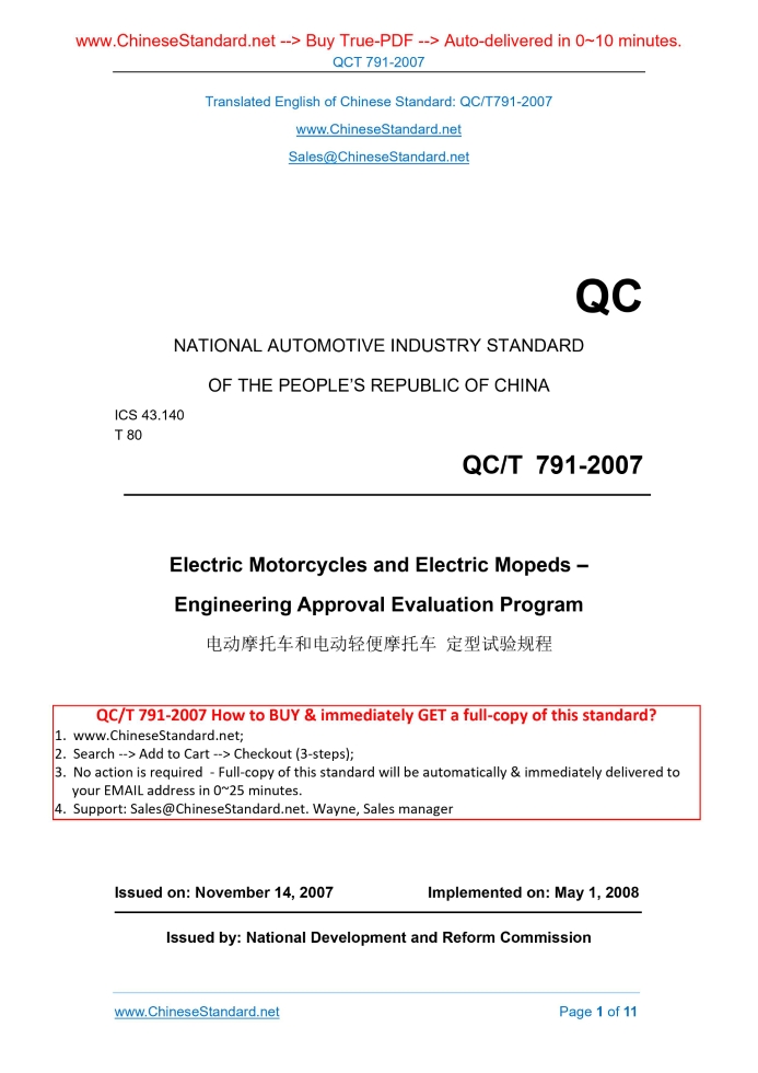 Similar standardsQC/T 791-2007: Electric Motorcycles and Electric Mopeds - Engineering Approval Evaluation Program---This is an excerpt. Full copy of true-PDF in English version (including equations, symbols, images, flow-chart, tables, and figures etc.), auto-downloaded/delivered in 9 seconds, can be purchased online: https://www.ChineseStandard.net/PDF.aspx/QCT791-2007 QC NATIONAL AUTOMOTIVE INDUSTRY STANDARD ICS 43.140 T 80 QC/T 791-2007 Electric Motorcycles and Electric Mopeds – Engineering Approval Evaluation Program Issued on. NOVEMBER 14, 2007 Implemented on. MAY 1, 2008 Issued by. National Development and Reform Commission National Development and Reform Commission of the PRC Table of ContentsForeword... 6 1 Scope... 7 2 Normative References... 7 3 Implementation Conditions... 8 4 Test Items, Test Methods and Evaluation Basis... 9 5 Test Procedures... 9 6 Test Report... 10 Appendix A (Normative) Motorcycle Mandatory Inspection Standard List... 11ForewordThe Appendix A of this Standard belongs to normative appendix. This Standard shall be under the jurisdiction of National Technical Committee of Auto Standardization. Drafting organizations of this Standard. National Motor Vehicle Product Quality Supervision and Inspection Center (Shanghai), China Automotive Technology & Research Center. Participating drafting organizations of this Standard. China Jialing Industrial Co., Ltd. (Group), Zhejiang Qianjiang Motorcycle Co., Ltd., Zhejiang Xingyue Electric Bicycle Co., Ltd., China Qingqi Motorcycles Co., Ltd., National Electric Bicycle Products Quality Supervision and Inspection Center, Zhejiang Qunsheng Industry and Trade Group Co., Ltd., Tianjin Qingyuan Electric Vehicle Co., Ltd., Ananda Drive Techniques (Shanghai) Co., Ltd., Ningbo Harvest Mechanical & Electrical Co., Ltd. Chief drafting staffs of this Standard. Hu Wenhao, Zhao Jingwei, Huang Jinquan, Ye Jianjun, Wang Qiang, Wang Yeming, Huang Xiaodong, Yao Xiangjiang, Zhao Chunming, Jia Aiping, Chen Mingjun. Electric Motorcycles and Electric Mopeds – Engineering Approval Evaluation Program1 ScopeThis Standard specifies the contents required by the implementation conditions, test items, test methods, evaluation basis, test procedures and test report for the new product design type test of electric motorcycles and electric mopeds. This Standard is applicable to electric motorcycles and electric mopeds (see GB/T 24158-2009 for the definitions) (Unless otherwise specified, they are referred to as electric motorcycles).2 Normative ReferencesThe provisions in following documents become the provisions of this Standard through reference in this Standard. For dated references, the subsequent amendments (excluding corrigendum) or revisions do not apply to this Standard, however, parties who reach an agreement based on this Standard are encouraged to study if the latest versions of these documents are applicable. For undated references, the latest edition of the referenced document applies. GB/T 4094.2 Electric Vehicles - Symbols for Controls, Indicators and Tell-Tales GB/T 5374 Test Method of Reliability for Motorcycles and Mopeds GB/T 18387 Limits and Test Methods of Magnetic and Electric Field Strength from Electric Vehicles Broadband 9khz to 30mhz GB 24155 Electric Motorcycles and Electric Mopeds - Safety Specifications GB/T 24156 Electric Motorcycles and Electric Mopeds - Power Performance - Test Methods GB/T 24157 Electric Motorcycles and Electric Mopeds - Energy Consumption and Range - Test Procedures GB/T 24158 Electric Motorcycles and Electric Mopeds - General Specifications The mandatory standards referenced in this Standard can refer to Appendix A.3 Implementation Conditions3.1 The manufacturer is required to provide the following documents. a) Product enterprise standards including product technical conditions and specifications; 3.2 The tested vehicle shall meet the requirements of design drawings and technical documents approved by prescribed procedures. 3.3 Provide 3 test sample vehicles. 3.4 The organization which undertakes the test shall prepare the test program as per the provisions of this Standard. During the test period, if any of the following circumstances occur, the test shall be terminated in advance. 3.5 During the test period, maintain the vehicle as per the provisions of use instructions. 3.6 After the completion of the test, the test organization shall issue the test report as per the provisions of Chapter 6.4 Test Items, Test Methods and Evaluation Basis4.1 The type test consists of three parts, i.e. mandatory standards specified item test, entire-vehicle performance test, and reliability test. 4.2 Mandatory standards specified item test. It contains all compulsory motorcycle test items stipulated in the standards listed in Appendix A. the symbols for controls, indicators, and telltales shall be inspected as per the requirements of GB/T 4094.2. 4.3 Entire-vehicle performance test. 4.3.1 The measurement results of entire-vehicle basic parameters and performance test results shall be evaluated according to the product technical conditions of the enterprise. 4.4 Reliability test. The entire-vehicle reliability test shall be performed as per the method specified in 6.4.18 of GB/T 24158-2009; the test results shall meet the requirements specified in 5.2.18 of GB/T 24158-2009.5 Test ProceduresThe type test shall be performed in the following procedures.6 Test ReportThe test report shall contain the following contents.Appendix A(Normative) Motorcycle Mandatory Inspection Standard List GB 5948 Photometric Characteristics of Motorcycle Headlamps Equipped with QCT 791-2007 QC NATIONAL AUTOMOTIVE INDUSTRY STANDARD ICS 43.140 T 80 QC/T 791-2007 Electric Motorcycles and Electric Mopeds – Engineering Approval Evaluation Program Issued on. NOVEMBER 14, 2007 Implemented on. MAY 1, 2008 Issued by. National Development and Reform Commission National Development and Reform Commission of the PRCTable of ContentsForeword... 6 1