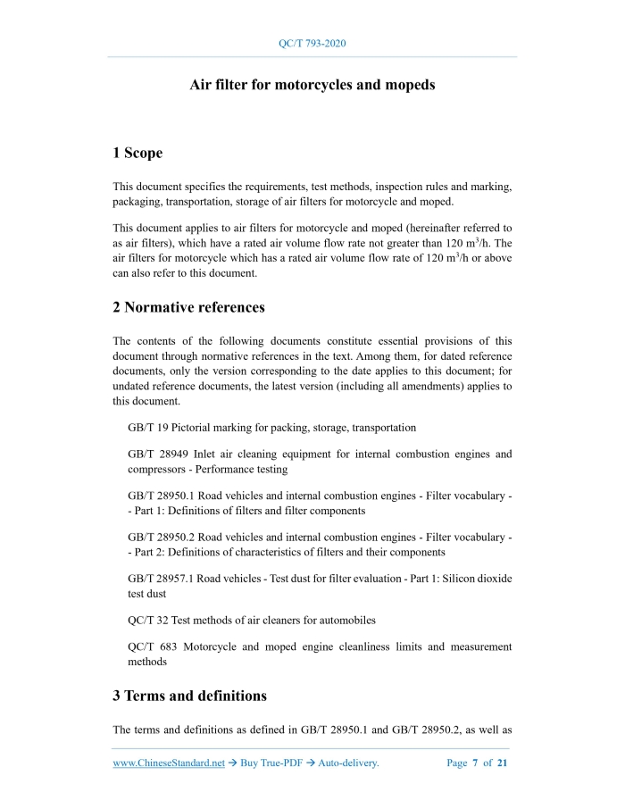 Similar standardsQC/T 793-2020: Air filter for motorcycles and mopeds---This is an excerpt. Full copy of true-PDF in English version (including equations, symbols, images, flow-chart, tables, and figures etc.), auto-downloaded/delivered in 9 seconds, can be purchased online: https://www.ChineseStandard.net/PDF.aspx/QCT793-2020QC AUTOMOTIVE INDUSTRY STANDARD ICS 43.140 T 13 Replacing QC/T 793-2007 Air filter for motorcycles and mopeds Issued on: AUGUST 31, 2020 Implemented on: JANUARY 01, 2021 Issued by. Ministry of Industry and Information Technology of PRC Table of ContentsForeword... 5 1 Scope... 7 2 Normative references... 7 3 Terms and definitions... 7 4 Parameter names, symbols, units... 10 5 Requirements... 10 6 Test methods... 13 7 Inspection rules... 16 8 Marking, packaging, transportation, storage... 17 Appendix A (Normative) Calculation formula for rated air volume flow... 19 Appendix B (Normative) Test device... 20 Air filter for motorcycles and mopeds1 ScopeThis document specifies the requirements, test methods, inspection rules and marking, packaging, transportation, storage of air filters for motorcycle and moped. This document applies to air filters for motorcycle and moped (hereinafter referred to as air filters), which have a rated air volume flow rate not greater than 120 m3/h. The air filters for motorcycle which has a rated air volume flow rate of 120 m3/h or above can also refer to this document.2 Normative referencesThe contents of the following documents constitute essential provisions of this document through normative references in the text. Among them, for dated reference documents, only the version corresponding to the date applies to this document; for undated reference documents, the latest version (including all amendments) applies to this document. GB/T 19 Pictorial marking for packing, storage, transportation GB/T 28949 Inlet air cleaning equipment for internal combustion engines and compressors - Performance testing GB/T 28950.1 Road vehicles and internal combustion engines - Filter vocabulary - - Part 1.Definitions of filters and filter components GB/T 28950.2 Road vehicles and internal combustion engines - Filter vocabulary - - Part 2.Definitions of characteristics of filters and their components GB/T 28957.1 Road vehicles - Test dust for filter evaluation - Part 1.Silicon dioxide test dust QC/T 32 Test methods of air cleaners for automobiles QC/T 683 Motorcycle and moped engine cleanliness limits and measurement methods3 Terms and definitionsThe terms and definitions as defined in GB/T 28950.1 and GB/T 28950.2, as well as the following terms and definitions, apply to this document. 3.1 Air filter with dry paper element An air filter, which uses dry filter paper as the filter element. 3.2 Air filter with paper element louvered by engine oil An air filter, that uses filter paper with an appropriate amount of engine oil sprayed on the surface as the filter element. 3.3 Air filter with foam plastic filter element An air filter, which uses a foam material soaked in an appropriate amount of engine oil as the filter element. 3.4 Rated air volume flow The volume of air flowing through the air filter outlet per unit time under standard atmospheric conditions specified by the user or manufacturer. It is determined based on the actual demand measurement and calculation of the engine. See Appendix A for the recommended calculation formula. 3.5 Resistance When air flows through the air filter, the static pressure value measured at the downstream pressure measuring point of the air filter under test. 3.6 Initial resistance For a new air filter, the static pressure value as measured at the downstream pressure measuring point at rated air volume flow. 3.7 Filtration efficiency The ability of the test piece to filter out specific test dust according to the prescribed test method, which is expressed as the mass percentage (%) of the dust filtered by the test piece to the mass of the added dust. 3.8 Initial filtration efficiency The ability of an air filter equipped with a new filter element to filter out specific test dust according to the prescribed test method, which is expressed as the mass percentage (%) of the filtered dust to the mass of the added dust. 3.9 Full life filtration efficiency The filtration efficiency measured when the test termination condition is reached, which is evaluated by the mass percentage (%) of dust filtered by the test piece during the entire test to the dust added. 3.10 Dust holding capacity The total amount of specific test dust filtered out by the test piece, when the test termination condition is reached. 3.11 Inner cleanliness The mass of impurities remaining in the air filter cavity before use. 3.12 Recovery ratio of air flow resistance The ratio -- of the initial resistance of the assembly with a new filter element TO the resistance after the dust holding capacity test (laboratory life test) is completed, that is, after the filter element is cleaned, expressed as a percentage (%). 3.13 Shower load The amount of water added per unit of effective filtration area of the filter element. 3.14 The damage pressure of the filter element shall not be less than 6 kPa. 5.2.10 Air filter/filter element's water immersion resistance After the air filter with paper filter element is soaked in (23 ± 5) °C pure water for 4 hours, the paper pleats of the filter element shall not be damaged. 5.2.11 Recovery ratio of air flow resistance After the air filter/filter element's dust capacity test is completed, the recovery ratio of air flow resistance shall not be less than 80% after performing restorative treatment on the air filter element. 5.2.12 High and low temperature resistance After the air filter is subject to the high and low temperature resistance test, no structural defects such as brittleness and deformation are allowed; the sealing performance of the assembly shall meet the requirements of 5.2.6. 5.2.13 Water splash resistance of air filter