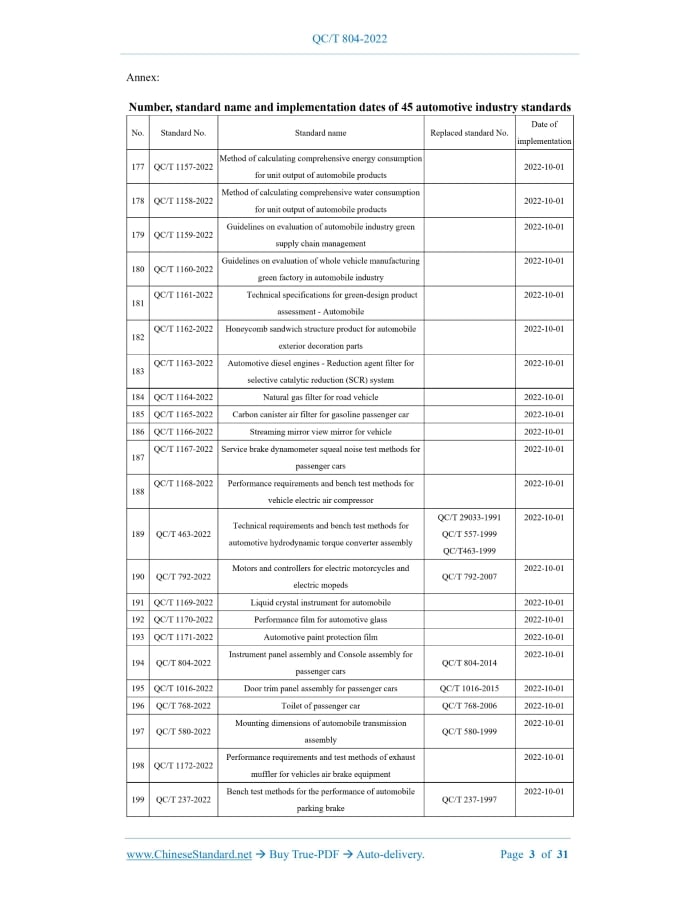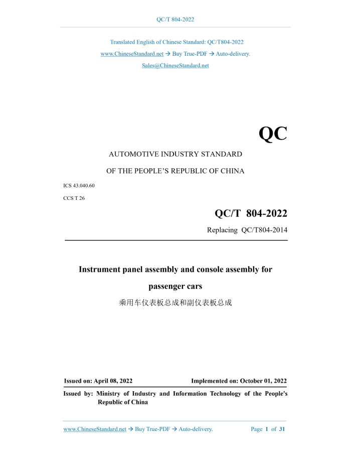 QC/T 804-2022: Instrument panel assembly and console assembly for passenger cars---This is an excerpt. Full copy of true-PDF in English version (including equations, symbols, images, flow-chart, tables, and figures etc.), auto-downloaded/delivered in 9 seconds, can be purchased online: https://www.ChineseStandard.net/PDF.aspx/QCT804-2022QC AUTOMOTIVE INDUSTRY STANDARD OF THE PEOPLE’S REPUBLIC OF CHINA ICS 43.040.60 CCS T 26 Replacing QC/T804-2014 Instrument panel assembly and console assembly for passenger cars ISSUED ON: APRIL 08, 2022 IMPLEMENTED ON: OCTOBER 01, 2022 Issued by: Ministry of Industry and Information Technology of the People's Republic of China Table of ContentsForeword ... 6 1 Scope ... 8 2 Normative references ... 8 3 Terms and definitions ... 9 4 Technical requirements ... 11 5 Test methods ... 15 6 Inspection rules ... 26 7 Marks, packaging, transportation and storage ... 27 Annex A (normative) Sampling method for emission of volatile organic compounds and aldehydes and ketones in assemblies -- Bag method ... 29 Instrument panel assembly and console assembly for passenger cars1 ScopeThis document specifies the requirements, test methods, inspection rules as well as marks, packaging, transportation and storage for instrument panel assembly and console assembly for passenger cars. This document is applicable to the instrument panel assembly and console assembly for passenger cars made of various materials through molding processes. However, it is not applicable to instruments, operating parts, electrical parts installed on it, or decorative parts using water transfer printing, paint, electric locks. This document applies to M1 vehicles. Other types of vehicles can use this document as reference.2 Normative referencesThe following referenced documents are indispensable for the application of this document. For dated references, only the edition cited applies. For undated references, the latest edition of the referenced document (including any amendments) applies. GB/T 250, Textiles - Tests for colour fastness - Grey scale for assessing change in colour GB/T 251, Textiles - Tests for colour fastness - Grey scale for assessing staining GB/T 3922, Textiles - Tests for colour fastness - Colour fastness to perspiration GB/T 7658.2-2008, Textiles - Tests for colour fastness - Standard adjacent fabrics - Part 2: Cotton and viscose GB 8410, Flammability of automotive interior materials GB/T 9286, Paints and varnishes - Cross-cut test GB 11552, The interior fittings of passenger car GB/T 16991-2008, Textiles - Test for colour fastness - Colour fastness and ageing to artificial light at high temperatures: Xenon arc GB/T 23436, Windshield cleaning fluid acrolein, propionaldehyde, methyl ethyl ketone, butyraldehyde, methacrolein, cyclohexanone and hexanal that can be detected by the method in Annex C of HJ/T 400- 2007.4 Technical requirements4.1 General requirements 4.1.1 Instrument panel assembly and console assembly shall comply with the provisions of this document. They are manufactured according to the product drawings and design documents approved by the prescribed procedures. The dimensions and tolerances of the instrument panel assembly and console assembly shall meet the requirements of the drawings or relevant documents. 4.1.2 The internal protrusions of the instrument panel assembly and console assembly shall comply with the relevant provisions of GB 11552. 4.1.3 The requirements for the appearance of instrument panel assembly and console panel assembly include: a) The surface components of the instrument panel assembly and console panel assembly shall be free from defects such as sharp edges, cracks, collapse, wrinkles, marks and dirt; b) The internal components of the instrument panel assembly and console assembly are not allowed to have air bubbles, cracks, paint flow marks, surface warping, blisters, pitting or other defects that affect the appearance; c) The color, pattern and gloss of the surface of the instrument panel assembly and console assembly shall be consistent with the color plates or samples approved by the prescribed procedures. 4.2 Performance requirements 4.2.1 Dimension stability The instrument panel assembly and console assembly shall have no obvious deformation. Dimensional changes shall comply with drawing requirements or technical documents. 4.2.2 Chemical resistance There shall be no obvious gloss change on the surface of the specimen after the test. There shall be no surface softening, peeling, discoloration, fading and so on. According to GB/T 250, the color fastness level shall be higher than or equal to level 4. 4.2.3 Dispersion performance 4.2.16.2 Storage box durability After the test, the storage box shall not show damage to parts, noise, loss of function, loose parts or failure of fastening. 4.2.16.3 Console armrest durability After the test, the console armrest shall not show damage to parts, noise, loss of function, loose parts or failure of fastening. 4.2.16.4 Air register durability After the test, there shall be no damage to parts, noise, loss of function, loose parts, fastening failure or failure to maintain the blades at the air register. 4.2.17 Airbag detonation of instrument panel subsystem During static airbag deployment, the glove box shall remain closed, and the instrument panel airbag door shall be able to open normally. During the static airbag deployment test and after the test, the airbag door on the instrument panel shall not have any hard splashes hitting a normal sitting occupant (considering soft flying objects, no more than 3g).5 Test methods5.1 General inspection requirements 5.1.1 Test environment conditions Unless otherwise specified, the environmental conditions of the test shall be a temperature of 23°C±5°C and a relative humidity of 50%±10%. Each of the following performance tests shall comply with this environmental condition. Room temperature shown below is the environmental condition. 5.1.2 Pretreatment B