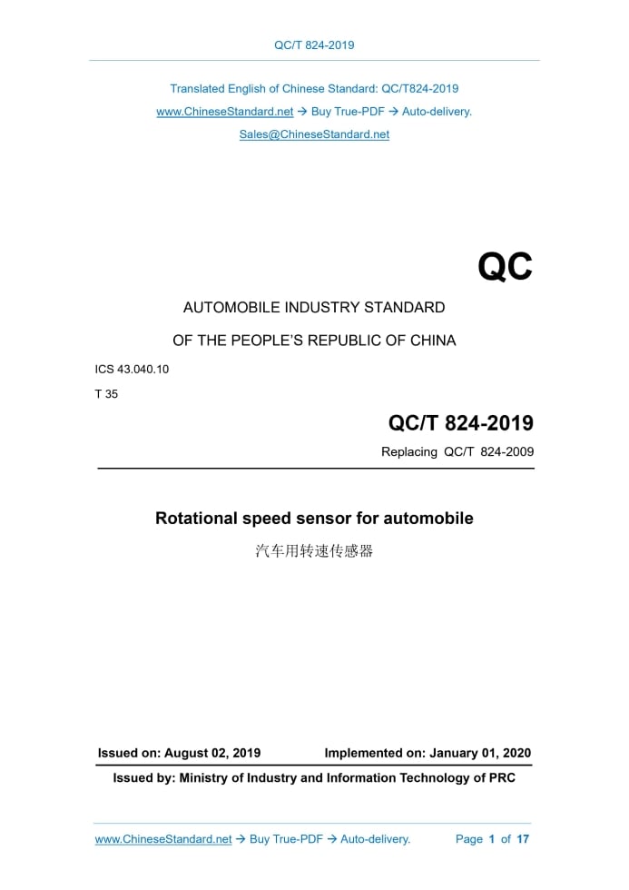 QC AUTOMOBILE INDUSTRY STANDARD ICS 43.040.10 T 35 Replacing QC/T 824-2009 Rotational speed sensor for automobile Issued on. AUGUST 02, 2019 Implemented on. JANUARY 01, 2020 Issued by. Ministry of Industry and Information Technology of PRC