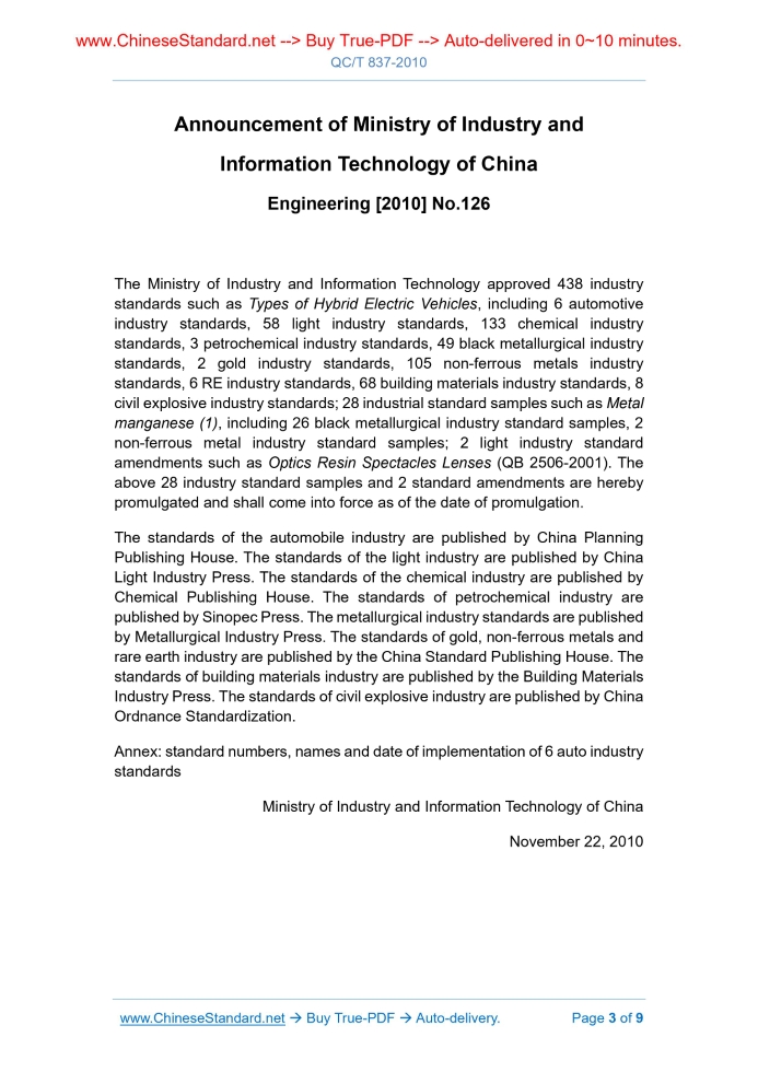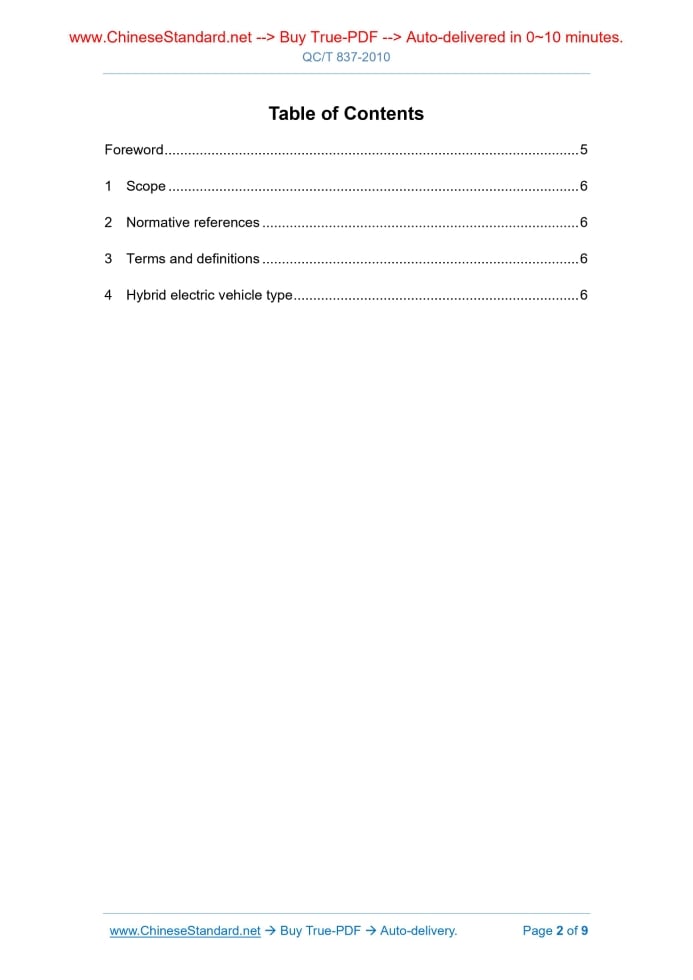 QC/T 837-2010: Types of hybrid electric vehicles---This is an excerpt. Full copy of true-PDF in English version (including equations, symbols, images, flow-chart, tables, and figures etc.), auto-downloaded/delivered in 9 seconds, can be purchased online: https://www.ChineseStandard.net/PDF.aspx/QCT837-2010QC AUTOMOBILE INDUSTRY STANDARD ICS 43.020 T 47 Type of hybrid electric vehicles Issued on. NOVEMBER 22, 2010 Implemented on. MARCH 01, 2011 Issued by. Ministry of Industry and Information Technology of the People's Republic of China Table of ContentsForeword... 5 1 Scope... 6 2 Normative references... 6 3 Terms and definitions... 6 4 Hybrid electric vehicle type... 6ForewordThis standard was proposed by AND shall be under the jurisdiction of the National Automotive Standardization Technical Committee. The responsible drafting organization of this standard. China Automotive Technology Research Center. The participating drafting organization of this standard. Qingyuan Electric Vehicle Co., Ltd., Dongfeng Electric Vehicle Co., Ltd., Shenzhen BYD Automobile Co., Ltd., Shanghai Automotive Group Co., Ltd. Technology Center, Chery Automobile Co., Ltd., Chongqing Changan Automobile Co., Ltd., Wanxiang Electric Vehicle Co., Ltd., China FAW Group Technology Center. The responsible drafters of this standard. Ma Yue, He Yuntang. The participating drafters of this standard. Wu Zhixin, Yang Xiaolun, Li Zheng, Luo Hongbin, Li Bin, Fang Yunzhou, Su Ling, Miao Huachun, Jin Qiqian. Type of hybrid electric vehicles1 ScopeThis standard specifies the type and definition of hybrid electric vehicles (as defined in GB/T 19596). This standard applies to hybrid electric vehicles.2 Normative referencesThe provisions in following documents become the provisions of this Standard through reference in this Standard. For the dated references, the subsequent amendments (excluding corrections) or revisions do not apply to this Standard; however, parties who reach an agreement based on this Standard are encouraged to study if the latest versions of these documents are applicable. For undated references, the latest edition of the referenced document applies. GB/T 19596 Terminology of electric vehicles3 Terms and definitionsThe following terms and definitions apply to this standard.4 Hybrid electric vehicle type4.1 By powertrain structure type 4.1.1 Series hybrid electric vehicle The hybrid electric vehicle the driving force of the vehicle driving system of which is supplied by the motor and engine, simultaneously or separately. 1 In this standard, it refers to the peak power of the driving motor. 4.2 By hybrid degree 4.2.2.1 Micro hybrid electric vehicle The hybrid electric vehicle using the engine as the main power source AND the motor as an auxiliary power, which has the braking energy recovery function. The ratio of motor peak power to total power is less than 10%. 4.3 By external charging capacity 4.3.1 Off-vehicle chargeable hybrid electric vehicle A hybrid electric vehicle designed to take electrical energy from off-board devices under normal use. 4.4 By choice of driving mode 4.4.1 Hybrid electric vehicle with selection switch Hybrid electric vehicles with manual selection of driving modes. Vehicle selectable driving modes include engine mode, pure electric mode and hybrid mode. 4.4.2 Hybrid electric vehicle without selective switch Hybrid electric vehicles that do not have driving mode manual selection functions. Vehicle driving mode is automatically switched based on different conditions. 4.5 Other types of division 4.5.1 It can be divided into, but not limited to, the following types in accordance with the difference of the rechargeable energy storage system. 4.5.2 Hybrid electric vehicles may have other types of division based on their technical characteristics, fuel type, functional structure and vehicle use. QC/T 837-2010 QC AUTOMOBILE INDUSTRY STANDARD ICS 43.020 T 47 Type of hybrid electric vehicles Issued on. NOVEMBER 22, 2010 Implemented on. MARCH 01, 2011 Issued by. Ministry of Industry and Information Technology of the People's Republic of ChinaTable of ContentsForeword... 5 1 Scope... 6 2 Normative references... 6 3 Terms and definitions... 6 4 Hybrid electric vehicle type... 6ForewordThis standard was proposed by AND shall be under the jurisdiction of the National Automotive Standardization Technical Committee. The responsible drafting organization of this standard. China Automotive Technology Research Center. The participating drafting organization of this standard. Qingyuan Electric Vehicle Co., Ltd., Dongfeng Electric Vehicle Co., Ltd., Shenzhen BYD Automobile Co., Ltd., Shanghai Automotive Group Co., Ltd. Technology Center, Chery Automobile Co., Ltd., Chongqing Changan Automobile Co., Ltd., Wanxiang Electric Vehicle Co., Ltd., China FAW Group Technology Center. The responsible drafters of this standard. Ma Yue, He Yuntang. The participating drafters of this standard. Wu Zhixin, Yang Xiaolun, Li Zheng, Luo Hongbin, Li Bin, Fang Yunzhou, Su Ling, Miao Huachun, Jin Qiqian. Type of hybrid electric vehicles1 ScopeThis standard specifies the type and definition of hybrid electric vehicles (as defined in GB/T 19596). This standard applies to hybrid electric vehicles.2 Normative referencesThe provisions in following documents become the provisions of this Standard through reference in this Standard. For the dated references, the subsequent amendments (excluding corrections) or revisions do not apply to this Standard; however, parties who reach an agreement based on this Standard are encouraged to study if the latest versions of these documents are applicable. For undated references, the latest edition of the referenced document applies. GB/T 19596 Terminology of electric vehicles3 Terms and definitionsThe following terms and definitions apply to this standard.4 Hybrid electric vehicle type4.1 By powertrain structure type 4.1.1 Series hybrid electric vehicle The hybrid electric vehicle the driving force o