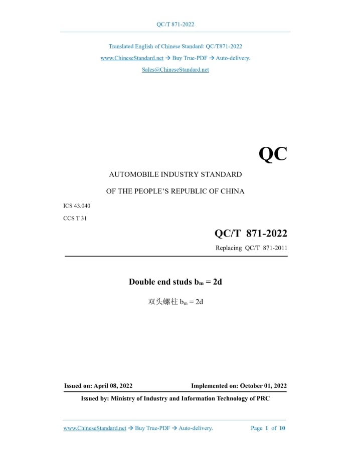 QC/T 871-2022: Double end studs bm=2d Delivery: 9 seconds. True-PDF full-copy in English & invoice will be downloaded + auto-delivered via email. See step-by-step procedure Status: Valid QC/T 871: Historical versions