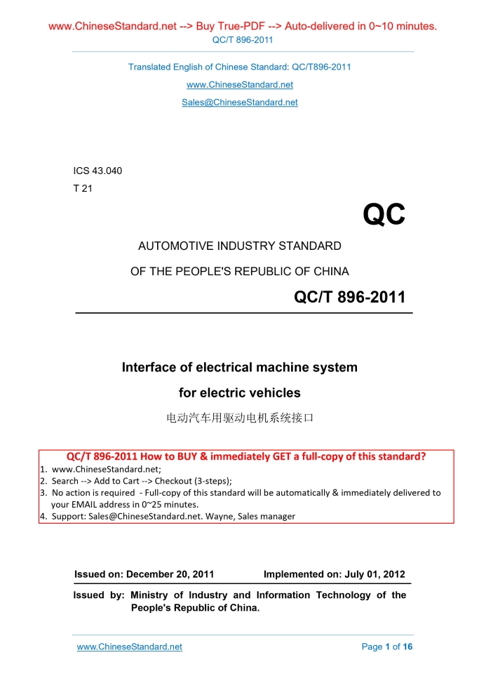 QC/T 896-2011: Interface of electrical machine system for electric vehicles Delivery: 9 seconds. True-PDF full-copy in English & invoice will be downloaded + auto-delivered via email. See step-by-step procedure Status: Valid