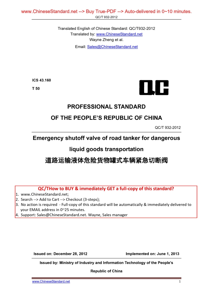 QC/T 932-2012: Emergency shutoff valve of road tanker for dangerous liquid goods transportation Delivery: 9 seconds. True-PDF full-copy in English & invoice will be downloaded + auto-delivered via email. See step-by-step procedure Status: Obsolete QC/T 932: Historical versions