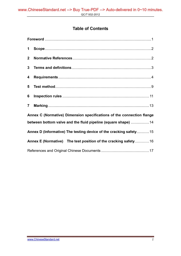 Similar standardsQC/T 932-2012: Emergency shutoff valve of road tanker for dangerous liquid goods transportation---This is an excerpt. Full copy of true-PDF in English version (including equations, symbols, images, flow-chart, tables, and figures etc.), auto-downloaded/delivered in 9 seconds, can be purchased online: https://www.ChineseStandard.net/PDF.aspx/QCT932-2012ICS 43.160 T 50 PROFESSIONAL STANDARD Emergency shutoff valve of road tanker for dangerous liquid goods transportation Issued on: DECEMBER 28, 2012 Implemented on: JUNE 1, 2013 Issued by. Ministry of Industry and Information Technology of the People’s Republic of China Table of ContentsForeword... 1 1 Scope... 2 2 Normative References... 2 3 Terms and definitions... 3 4 Requirements... 4 5 Test method... 9 6 Inspection rules... 11 7 Marking... 13 Annex C (Normative) Dimension specifications of the connection flange between bottom valve and the fluid pipeline (square shape)... 14 Annex D (Informative) The testing device of the cracking safety... 15 Annex E (Normative) The test position of the cracking safety... 16 References and Original Chinese Documents... 17ForewordThis Standard is prepared according to the rules specified in GB/T 1.1-2009. Annex A, B, C and E of this Standard are normative, annex D is informative. This Standard is proposed and is under the jurisdiction of National Technical Committee (SAC/TC 114) on Road Vehicles of Standardization Administration of China. The responsible drafting organizations. Dongguan Yongqiang Auto Co., Ltd, Hanyang Special Purpose Vehicle Institute, Yongjia Sanjiang Petroleum Machinery Plant, Zhejiang Jialong Machinery Equipment Co., Ltd, Xiagong Chusheng (Hubei) Special Vehicle Co., Ltd and Dufu (Shanghai) Trade Co., Ltd. The chief drafting staffs of this Standard. Su Debiao, Wu Yueling, Gong Zhangyong, Lyu Shixiang, Wang Zhaoping and Yu Shijiang. Emergency shutoff valve of road tanker for dangerous liquid goods transportation1 ScopeThis Standard stipulates the terms and definitions, requirements, test methods, inspection rules and markings of the emergency shutoff valve of road tanker for dangerous liquid goods transportation. This Standard is applicable to the transportation of liquid petroleum products and other dangerous liquids which comply with the Class III dangerous liquid in GB 6944 “Classification and Code of Dangerous Goods”, including petroleum whose steam pressure is not higher than 110kPa at 50 °C, but excluding the emergency shutoff valve of road tanker for liquid desensitized explosives, poisons and corrosives.2 Normative ReferencesThe articles contained in the following documents have become part of this Standard when they are quoted herein. For the dated documents so quoted, all the modifications (Including all corrections) or revisions made thereafter shall be applicable to this Standard. GB/T 1239.2-2009 Cold coiled helical spring technical specifications - Part 2. Compressions spring GB/T 2828.1-2003 Sampling procedures for inspection by attributea-Part1.Sampling schemes indexed by acceptance quality limit (AQL) for lot-by-lot inspection GB/T 4356 Stainless steel wire rods GB/T 5218 Alloy spring steel wires GB/T 13927-2008 Industrial valves - Pressure testing GB/T 15114 Aluminum alloy die castings GB/T 15115 Die casting aluminum alloys JB/T 9092-1999 Valve inspection and testing the experiment pressure is maintained continuously for at least 10min, the valve body of the non-pressure-balance bottom valve shall be in good state. 4.12 Sealing performance of the valve body Within the designed temperature range, the valve body of the bottom valves (including the operating mechanisms) shall not leak under the specified pressure state for 60s. 4.13 Sealing performance of the valve seats Within the designed temperature range, under the specified pressure state, after pressurized for 60s - valve clacks, valve seats and surfaces of valve body, etc. shall not have any apparent and visible leakage. The leaking volume shall comply with the requirements in “All Resiliently Sealed Deputy Valve” in Table 4 of JB/T 9092-1999. 4.14 Operability After the assembly is completed, bottom valve shall be able to turn-on and turn-off quickly through the on-off operating device; no blocking symptoms; and the closing time must not be longer than 2s. 4.15 Service life After 25,000 times of opening and closing actions without lubricating, bottom valve shall still have good operability and good sealing performance on the valve seats, and pass the sealing performance test on the valve seats. 4.16 Cracking safety 4.16.1 When the valve seat of the bottom valve (sealing mechanical part) is designed, it shall guarantee to be in the wrapping range of the independent barn of installed tank. 4.16.2 The bottom valve shall be designed as shear structure (shear grooving design). When it suddenly cracks and falls off under the accidental damages like the collision of external shell of the bottom valve, etc., the sealing mechanism in the wrapping range of the independent barn of the installed tank shall be in good state without damage. 4.16.3 The impact energy causing the cracking and falling off of the external shell of the bottom valve due to collision shall not be more than 1000J. 4.16.4 When the external shell of the bottom valve cracks and falls off caused by external force, its sealing mechanism and the installation connection of the bottom seat shall be in good state. The requirements for leaking volume are as follows. 5.7.1 In this test, at least 4 samples shall be taken from each type of products as sample-group for testing. 5.7.2 Testing device. a) The testing device has a small container of which the side is connected to the connecting-flange of the tested bottom valve, before the test is conducted. b) The typical device structure parts are shown in Annex D. c) The impact loading will be successively loaded to the four vertical-central-line-surfaces of the tank-body-installation-con