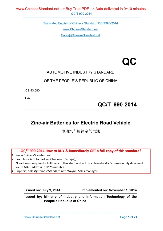 QC/T 990-2014: Zinc-air batteries for electric road vehicle---This is an excerpt. Full copy of true-PDF in English version (including equations, symbols, images, flow-chart, tables, and figures etc.), auto-downloaded/delivered in 9 seconds, can be purchased online: https://www.ChineseStandard.net/PDF.aspx/QCT990-2014QC AUTOMOTIVE INDUSTRY STANDARD OF THE PEOPLE’S REPUBLIC OF CHINA ICS 43.080 T 47 Zinc-air Batteries for Electric Road Vehicle Issued on: JULY 9, 2014 Implemented on: NOVEMBER 1, 2014 Issued by. Ministry of Industry and Information Technology of the People's Republic of China Ministry of Industry and Information Technology of the People's Republic of China Announcement No. 47 of 2014 The Ministry of Industry and Information Technology has approved 676 industrial standards including Blister Packaging Machine (see Attachment for standard numbers, names, main contents and initial implementation dates), including 394 mechanical industry standards (including 16 standards of pharmaceutical equipment), 1 automotive industry standard, 41 aviation industry standards, 135 light industry standards, 37 textile industry standards, 4 packaging standards, 42 chemical industry standards, 6 petrochemical industry standards, 4 non-ferrous industry standards, 7 metallurgical standards, 2 building material industry standards, 1 electronic industry standard, 2 communication industry standards. The mechanical industry standards are published by China Machine Press; the standards of automotive, pharmaceutical equipment and packaging industry are published by China Planning Press; the aviation industry standards are published under the organization of AVIC China Aero-polytechnology Establishment; the light industry standards are published by China Light Industry Press; the standards of textile and non-ferrous industry are published by China Standards Press; the chemical industry standards are published by Chemical Industry Press; the petrochemical industry standards are published by China Petrochemcial Press; the metallurgical industry standards are published by Metallurgical Industry Press; the building material industry standards are published by China Building Materials Press; the electronic industry standard is published under the organization of China Electronics Standardization Institute of the Ministry of Industry and Information Technology; the communication industry standard is published by Posts and Telecom Press. Attachment. Number, name and initial implementation date of 1 automotive industry standard. Ministry of Industry and Information Technology of the People 's Republic of China July 9, 2014 Table of ContentsForeword ... 5 1 Application Scope ... 6 2 Normative References ... 6 3 Terms and Definitions ... 6 4 Symbols and Definitions ... 7 5 Requirements ... 8 6 Test Method ... 10 7 Inspection Rules ... 18 8 Marking, Packaging, Transportation and Storage ... 20 Zinc-air Batteries for Electric Road Vehicle1 Application ScopeThis standard specifies the terms and definitions, symbols and definitions, requirements, test method and marking, packaging, transportation and storage of zinc-air batteries for electric road vehicle (hereinafter referred to as batteries). This standard applies to zinc-air batteries for electric road vehicle using mechanical switching as the energy supplement method.2 Normative ReferencesThe provisions in following documents become the provisions of this Standard through reference in this Standard. For dated references, the subsequent amendments (excluding corrigendum) or revisions do not apply to this Standard, however, parties who reach an agreement based on this Standard are encouraged to study if the latest versions of these documents are applicable. For undated references, the latest edition of the referenced document applies. GB/T 2900.41-2008, Electrotechnical Terminology - Primary and Secondary Cells and Batteries GB/T 19596-2004, Terminology of Electric Vehicles (ISO 8713.2002, NEQ) GB/T 2423.17-2008, Environmental Testing for Electric and Electronic Products – Part 2. Test Method – Test Ka. Salt Mist3 Terms and DefinitionsFor the purposes of this Standard, those defined in GB/T 2900.41-2008 and GB/T 19596-2004 and the following terms and definitions apply. 3.1 zinc-air battery a device which transforms chemical energy into electric energy using the oxygen in the air as positive active material, zinc metal as negative active material and alkaline solution as electrolyte.5 Requirements5.1 Cell 5.1.1 Appearance Carry out inspection in accordance with 6.2.1. The appearance of battery shall be clean, intact without deformation, rust, crack or alkali liquor. Marking shall be clear, correct. 5.1.2 Polarity marking Carry out inspection in accordance with 6.2.2. Marking for the polarities of battery terminals shall be correct. 5.1.3 Shape, dimensions and mass Carry out inspection in accordance with 6.2.3. The shape, dimensions and mass of battery shall meet the specifications of the products supplied by the manufacturer. 5.1.4 Tilting Carry out inspection in accordance with 6.2.4. Battery shall have no leakage. 5.1.5 Discharge performance Carry out inspection in accordance with 6.2.5. When using I5 to discharge, the mean value of discharge capacity shall not be less than 95% of nominal capacity; when using I3 to discharge, the mean value of discharge capacity shall not be less than 65% of rated capacity. 5.1.6 Low-temperature performance Carry out inspection in accordance with 6.2.6. When battery is subjected to the test under specified conditions, the discharge capacity of battery shall not be less than 60% of the initial rated capacity; the terminals and appearance shall be intact. 5.1.7 High-temperature performance Carry out inspection in accordance with 6.2.7. When battery is subjected to the test under specified conditions, the discharge capacity of battery shall not be less than 80% of the initial rated capacity; the terminals and appearance shall be i