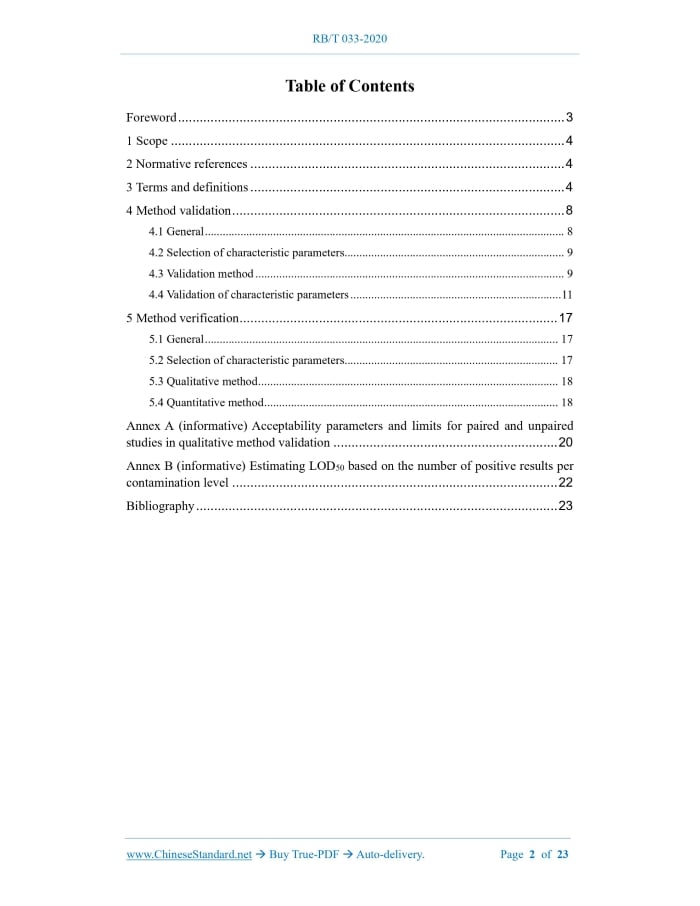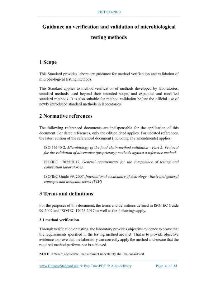 RB/T 033-2020: Guidance on verification and validation of microbiological testing methods---This is an excerpt. Full copy of true-PDF in English version (including equations, symbols, images, flow-chart, tables, and figures etc.), auto-downloaded/delivered in 9 seconds, can be purchased online: https://www.ChineseStandard.net/PDF.aspx/RBT033-2020RB CERTIFICATION AND ACCREDITATION INDUSTRY STANDARD OF THE PEOPLE’S REPUBLIC OF CHINA ICS 03.120.00 A 00 Guidance on verification and validation of microbiological testing methods ISSUED ON: AUGUST 26, 2020 IMPLEMENTED ON: DECEMBER 01, 2020 Issued by: Certification and Accreditation Administration Table of ContentsForeword ... 3 1 Scope ... 4 2 Normative references ... 4 3 Terms and definitions ... 4 4 Method validation ... 8 4.1 General ... 8 4.2 Selection of characteristic parameters... 9 4.3 Validation method ... 9 4.4 Validation of characteristic parameters ... 11 5 Method verification ... 17 5.1 General ... 17 5.2 Selection of characteristic parameters... 17 5.3 Qualitative method ... 18 5.4 Quantitative method ... 18 Annex A (informative) Acceptability parameters and limits for paired and unpaired studies in qualitative method validation ... 20 Annex B (informative) Estimating LOD50 based on the number of positive results per contamination level ... 22 Bibliography ... 23 Guidance on verification and validation of microbiological testing methods1 ScopeThis Standard provides laboratory guidance for method verification and validation of microbiological testing methods. This Standard applies to method verification of methods developed by laboratories, standard methods used beyond their intended scope, and expanded and modified standard methods. It is also suitable for method validation before the official use of newly introduced standard methods in laboratories.2 Normative referencesThe following referenced documents are indispensable for the application of this document. For dated references, only the edition cited applies. For undated references, the latest edition of the referenced document (including any amendments) applies. ISO 16140-2, Microbiology of the food chain-method validation - Part 2: Protocol for the validation of alternative (proprietary) methods against a reference method ISO/IEC 17025:2017, General requirements for the competence of testing and calibration laboratories ISO/IEC Guide 99: 2007, International vocabulary of metrology - Basic and general concepts and associate terms (VIM)3 Terms and definitionsFor the purposes of this document, the terms and definitions defined in ISO/IEC Guide 99:2007 and ISO/IEC 17025:2017 as well as the followings apply. 3.1 method verification Through verification or testing, the laboratory provides objective evidence to prove that the requirements specified in the testing method are met. That is to provide objective evidence to prove that the laboratory can correctly apply the method and ensure that the required method performance is achieved. NOTE 1: Where applicable, measurement uncertainty shall be considered. NOTE 2: It is adapted from ISO/IEC Guide 99:2007, Definition 2.44. 3.2 method validation Through testing, the laboratory provides objective evidence that the method to be determined meets the intended use. NOTE 1: Method validation shall identify the factors that affect method performance and their degree of influence, verify the performance characteristics of the method, and determine the matrix to which the method is applicable and the limitations of its use. NOTE 2: Validation may include validation of sampling, handling and transportation procedures for test items. NOTE 3: It is adapted from ISO/IEC Guide 99:2007, Definition 2.45. 3.3 reference method Methods that are recognized and widely accepted by international, national, industry or organizations. NOTE: The reference method gives priority to the methods recommended by the International Organization for Standardization (ISO), Chinese National Standards (GB), and the Association of Analysts International (AOAC). Other industry accepted methods may also serve as reference methods. 3.4 qualitative method An analytical method that detects the presence of target microorganisms using direct or indirect methods. 3.5 quantitative method An analytical method that measures the number of target microorganisms directly (such as counting a certain mass or volume of samples) or indirectly (such as absorbance value, impedance, etc.) on a certain number of samples. 3.6 confirmatory method A method that can provide all or part of the information on the target, based on which information can be clearly identified and, if necessary, quantified at the concentration level of concern. 3.7 screening method A method that has the ability to efficiently process large numbers of samples and is used to detect the presence of a substance or group of substances at a concentration level of interest. NOTE: These methods are used to screen large numbers of samples for possible positive results and to avoid false negative results. The detection results obtained by such methods are usually qualitative results or semi-quantitative results. 3.8 sensitivity The ability of a reference method or method to be validated to detect an analyte. 3.9 relative trueness; RT The same sample is tested using the validation method and the reference method to see how consistent the results are. That is, the sum of the number of validated positives and the number of negative validated by both the method to be validated and the reference method is divided by the total number of samples used for validation. 3.10 level of detection; LODx Using a microbial qualitative detection method, through a given detection step, the content of the measured analyte is obtained with a probability x of a positive detection result. Example: LOD50 means the level of detection at which 50% of tests give positive results. [ISO 16140-1:2016, Definition 2.35] 3.11 relative level of detection; RLOD Fo