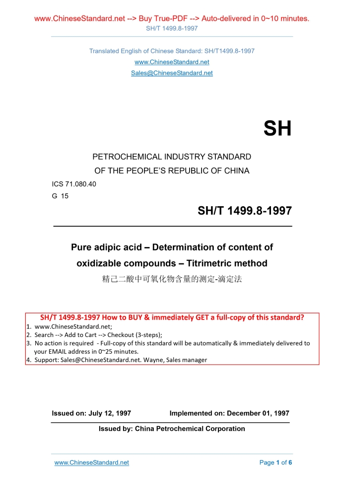 SH/T 1499.8-1997: Pure adipic acid. Determination of content of oxidixable compounds. Titrimetric method Delivery: 9 seconds. True-PDF full-copy in English & invoice will be downloaded + auto-delivered via email. See step-by-step procedure