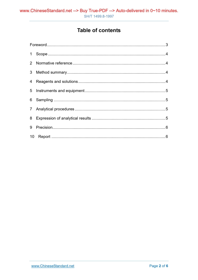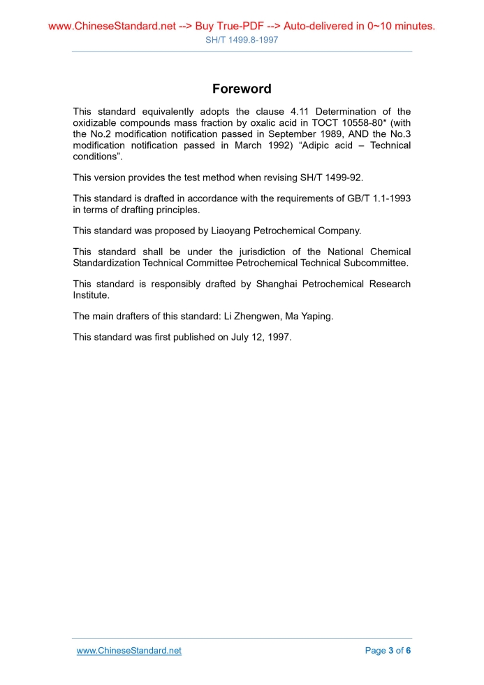 Similar standardsSH/T 1499.8-1997: Pure adipic acid. Determination of content of oxidixable compounds. Titrimetric method---This is an excerpt. Full copy of true-PDF in English version (including equations, symbols, images, flow-chart, tables, and figures etc.), auto-downloaded/delivered in 9 seconds, can be purchased online: https://www.ChineseStandard.net/PDF.aspx/SHT1499.8-1997 SH PETROCHEMICAL INDUSTRY STANDARD OF THE PEOPLE’S REPUBLIC OF CHINA ICS 71.080.40 G 15 Pure adipic acid – Determination of content of oxidizable compounds – Titrimetric method Issued on: JULY 12, 1997 Implemented on: DECEMBER 01, 1997 Issued by. China Petrochemical Corporation Table of ContentsForeword ... 3 1 Scope ... 4 2 Normative reference ... 4 3 Method summary ... 4 4 Reagents and solutions ... 4 5 Instruments and equipment ... 5 6 Sampling ... 5 7 Analytical procedures ... 5 8 Expression of analytical results ... 5 9 Precision... 6 10 Report ... 6ForewordThis standard equivalently adopts the clause 4.11 Determination of the oxidizable compounds mass fraction by oxalic acid in TOCT 10558-80* (with the No.2 modification notification passed in September 1989, AND the No.3 modification notification passed in March 1992) “Adipic acid – Technical conditions”. This version provides the test method when revising SH/T 1499-92. This standard is drafted in accordance with the requirements of GB/T 1.1-1993 in terms of drafting principles. This standard was proposed by Liaoyang Petrochemical Company. This standard shall be under the jurisdiction of the National Chemical Standardization Technical Committee Petrochemical Technical Subcommittee. This standard is responsibly drafted by Shanghai Petrochemical Research Institute. The main drafters of this standard. Li Zhengwen, Ma Yaping. This standard was first published on July 12, 1997. Pure adipic acid – Determination of content of oxidizable compounds – Titrimetric method1 ScopeThis standard specifies the potassium permanganate oxidation-reduction titration method for the determination of the content of the oxidizable compounds (by oxalic acid) in the pure adipic acid. This standard is applicable to the determination of the content of the oxidizable compounds (by oxalic acid) in the pure adipic acid2 Normative referenceThe provisions in following documents become the provisions of this Standard through reference in this Standard. The versions indicated at the time of publication of this standard are valid. All standards are subjected to revision, AND parties who reach an agreement based on this Standard are encouraged to study if the latest versions of these documents are applicable. GB/T 601-88 Chemical reagent – Preparations of standard volumetric solutions GB/T 6678-86 General principles for sampling chemical products GB/T 6679-86 General rules for sampling of solid chemical products GB/T 6682-92 Water for laboratory use; Specifications3 Method summaryThe solid sample is dissolved in a strong acid medium AND then titrated by the potassium permanganate standard titration solution at a temperature of 80 °C ~ 85 °C.4 Reagents and solutionsUnless otherwise noted, the reagents used are analytical pure, AND the water used shall comply with the level III water specifications of GB/T 6682. 4.1 Sulfuric acid solution (1.4). 4.2 Potassium permanganate standard titration solution [c(1/5KMnO4 = 0.1mol/L)]. PREPARE it in accordance with the requirements of GB/T 601. ......Source: Above contents are excerpted from the full-copy PDF -- translated/reviewed by: www.ChineseStandard.net / Wayne Zheng et al. Tips & Frequently Asked Questions:Question 1: How long will the true-PDF of English version of SH/T 1499.8-1997 be delivered?Answer: The full copy PDF of English version of SH/T 1499.8-1997 can be downloaded in 9 seconds, and it will also be emailed to you in 9 seconds (double mechanisms to ensure the delivery reliably), with PDF-invoice.Question 2: Can I share the purchased PDF of SH/T 1499.8-1997_English with my colleagues?Answer: Yes. The purchased PDF of SH/T 1499.8-1997_English will be deemed to be sold to your employer/organization who actually paid for it, including your colleagues and your employer's intranet.Question 3: Does the price include tax/VAT?Answer: Yes. Our tax invoice, downloaded/delivered in 9 seconds, includes all tax/VAT and complies with 100+ countries' tax regulations (tax exempted in 100+ countries) -- See Avoidance of Double Taxation Agreements (DTAs): List of DTAs signed between Singapore and 100+ countriesQuestion 4: Do you accept my currency other than USD?Answer: Yes. www.ChineseStandard.us -- SH/T 1499.8-1997 -- Click this link and select your country/currency to pay, the exact amount in your currency will be printed on the invoice. Full PDF will also be downloaded/emailed in 9 seconds.How to buy and download a true PDF of English version of SH/T 1499.8-1997?A step-by-step guide to download PDF of SH/T 1499.8-1997_EnglishStep 1: Visit website https://www.ChineseStandard.net (Pay in USD), or https://www.ChineseStandard.us (Pay in any currencies such as Euro, KRW, JPY, AUD).Step 2: Search keyword "SH/T 1499.8-1997". Step 3: Click "Add to Cart". If multiple PDFs are required, repeat steps 2 and 3 to add up to 12 PDFs to cart. Step 4: Select payment option (Via payment agents Stripe or PayPal). Step 5: Customize Tax Invoice -- Fill up your email etc. Step 6: Click "Checkout". Step 7: Make payment by credit card, PayPal, Google Pay etc. After the payment is completed and in 9 seconds, you will receive 2 emails attached with the purchased PDFs and PDF-invoice, respectively. Step 8: Optional -- Go to download PDF. Step 9: Optional -- Click Open/Download PDF to download PDFs and invoice. See screenshots for above steps: Steps 1~3 Steps 4~6 Step 7 Step 8 Step 9 |