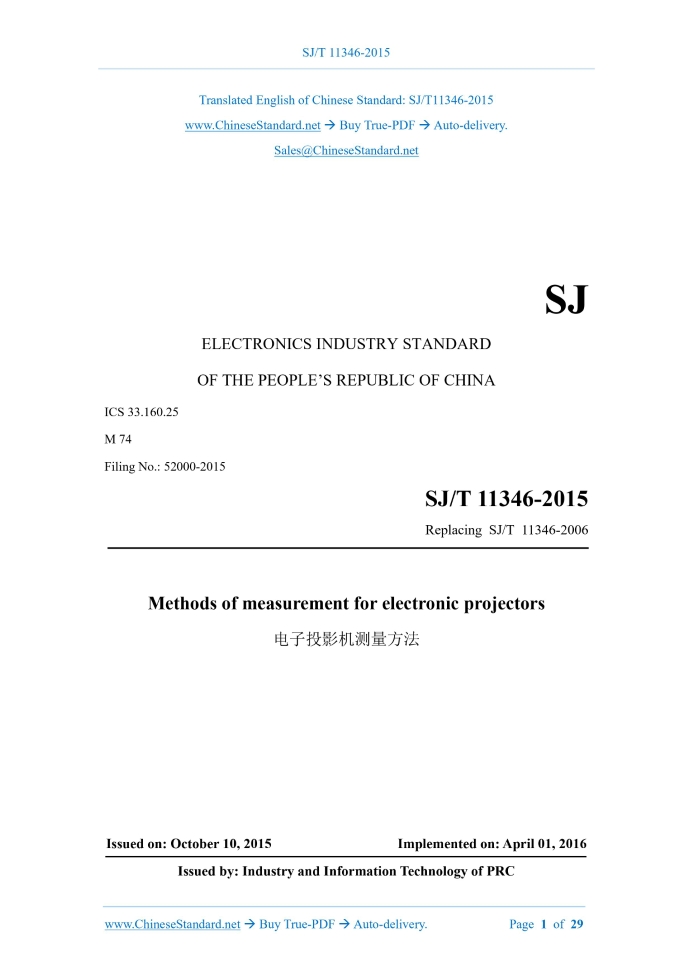 SJ/T 11346-2015: Methods of measurement for electronic projectors Delivery: 9 seconds. True-PDF full-copy in English & invoice will be downloaded + auto-delivered via email. See step-by-step procedure Status: Valid SJ/T 11346: Historical versions