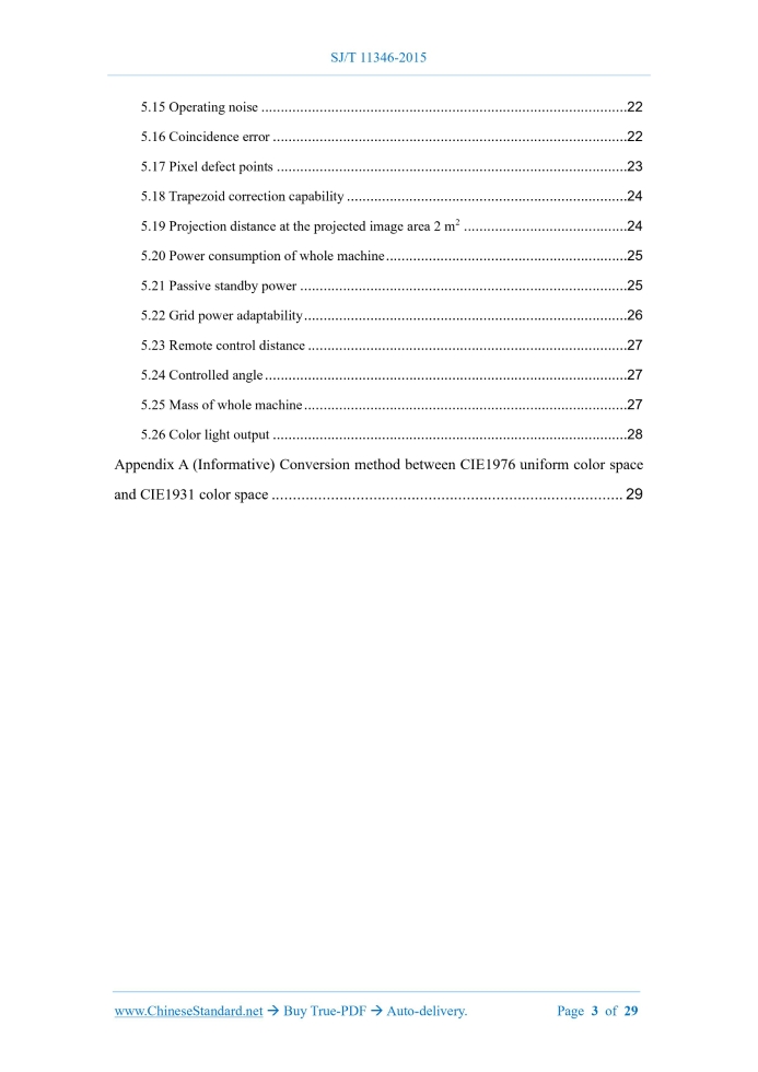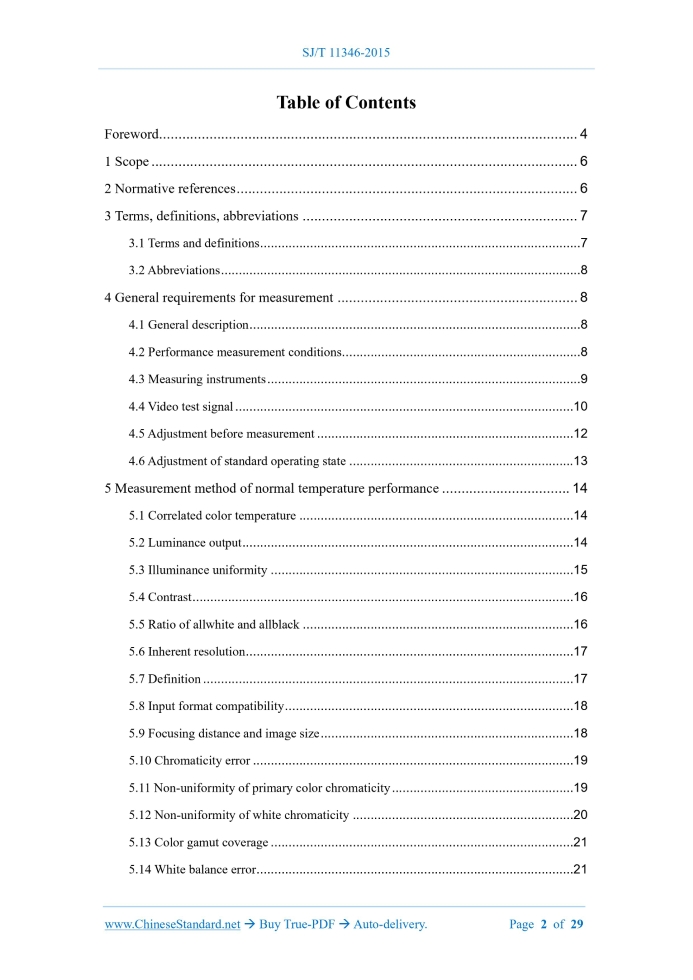 Similar standardsSJ/T 11346-2015: Methods of measurement for electronic projectors---This is an excerpt. Full copy of true-PDF in English version (including equations, symbols, images, flow-chart, tables, and figures etc.), auto-downloaded/delivered in 9 seconds, can be purchased online: https://www.ChineseStandard.net/PDF.aspx/SJT11346-2015ELECTRONICS INDUSTRY STANDARD ICS 33.160.25 M 74 Filing No.. 52000-2015 Replacing SJ/T 11346-2006 Methods of measurement for electronic projectors Issued on. OCTOBER 10, 2015 Implemented on. APRIL 01, 2016 Issued by. Industry and Information Technology of PRC Table of ContentsForeword... 4 1 Scope... 6 2 Normative references... 6 3 Terms, definitions, abbreviations... 7 4 General requirements for measurement... 8 5 Measurement method of normal temperature performance... 14 Appendix A (Informative) Conversion method between CIE1976 uniform color space and CIE1931 color space... 29 Methods of measurement for electronic projectors1 ScopeThis standard specifies the terms and definitions, measurement conditions, measurement items, measurement methods, measurement results expression, etc., of electronic projectors. This standard applies to electronic projection type fixed resolution projectors (hereinafter referred to as projectors), including liquid crystal display (LCD) projectors, liquid crystal on silicon (LCoS) projectors, digital light processing (DLP) projectors, etc. Other projection methods and electronic projectors, which are used in different occasions, can be implemented with reference to it.2 Normative referencesThe following documents are essential to the application of this document. For the dated documents, only the versions with the dates indicated are applicable to this document; for the undated documents, only the latest version (including all the amendments) is applicable to this standard. GB 3174 PAL-D system TV broadcasting technical specification GB/T 6882 Acoustics - Determination of sound power levels of noise sources using pressure - Precision methods for anechoic and hemi-anechoic rooms GB/T 7921 Uniform color space and color difference formula GB/T 14857 The specifications of encoding parameters of digital television for studio GB/T 15644 Application of connectors for the interconnection of equipment in audio-visual systems GB/T 17953 Interfaces for 4.2.2 digital component video signals3 Terms, definitions, abbreviations3.1 Terms and definitions The terms and definitions, which are defined in SJ/T 11324, as well as the following terms and definitions, apply to this document. 3.2 Abbreviations The following abbreviations apply to this document. CCT. Correlated colour temperature CIE. Commission internationale de L' Eclairage (fr) DLP. Digital light process LCD. Liquid crystal display LCoS. Liquid crystal on silicon4 General requirements for measurement4.1 General description Unless otherwise specified, the voltage values, which are given in this standard, are valid values. 4.2 Performance measurement conditions 4.3 Measuring instruments 4.3.1 Illuminometer The illuminometer requirements are as follows. 4.3.2 Video signal generator The requirements for video signal generator are as follows. 4.3.3 Anechoic chamber The anechoic chamber and related equipment shall comply with the provisions of GB/T 6882. 4.3.4 Power supply The power supply requirements are as follows. 4.3.5 Power meter The power meter is an active power meter. The minimum current range is less than or equal to 10 mA. The reading is accurate to at least 0.01 W, when measuring power less than or equal to 10 W. 4.3.6 Weighing device The measurement results of the weighing device shall be accurate to at least 0.1 kg. 4.4 Video test signal 4.4.1 Overview The test signal shall have a signal format, which is consistent with the inherent resolution of the projector. The standard definition signal conforms to the provisions of GB/T 14857.The high-definition test signal conforms to the provisions of GY/T 155. The input interface, aspect ratio, input format of the test signal shall be indicated, in the measurement results. 4.4.3 Color bar signal See 5.3 in GB/T 26270-2010, for the description and examples of test diagram. 4.4.4 All-white field signal and all-black field signal See 5.4 in GB/T 26270-2010, for the description and examples of test diagram. 4.4.5 Location map of uniformity test points See Figure D.2 in GB/T 26270-2010, for the description and examples of test diagram. 4.4.6 Black and white window signal See 5.8 in GB/T 26270-2010, for the description and examples of test diagram. 4.4.7 Single pixel signal See 5.20 in GB/T 26270-2010, for the description and examples of test diagram.5 Measurement method of normal temperature performance5.1 Correlated color temperature 5.1.1 Overview This clause is to measure the correlated color temperature (CCT) of the projector, under standard operating state. 5.1.2 Measurement steps 5.1.3 Presentation of measurement results Measurement results are expressed in Kelvin (K). 5.2 Luminance output 5.2.1 Overview This clause specifies the measurement of the luminance output of the projector, under standard operating state. 5.3 Illuminance uniformity 5.3.1 Overview This clause specifies the measurement of the consistency of the projector's output on the entire screen on the projection surface, under standard operating states. 5.3.2 Measurement steps 5.3.3 Presentation of measurement results Illuminance uniformity is expressed as a percentage (%). 5.4 Contrast 5.4.1 Overview This clause specifies the measurement of the ratio of the average illuminance of the brightest area to the darkest area, on the same screen, under normal operating states of the projector. 5.4.2 Measurement steps 5.7 Definition 5.7.1 Overview The vertical and horizontal definition of the image is observed subjectively. 5.7.2 Measurement steps 5.8 Input format compatibility 5.8.1 Overview This clause specifies the measurement of the playback capability of the projector