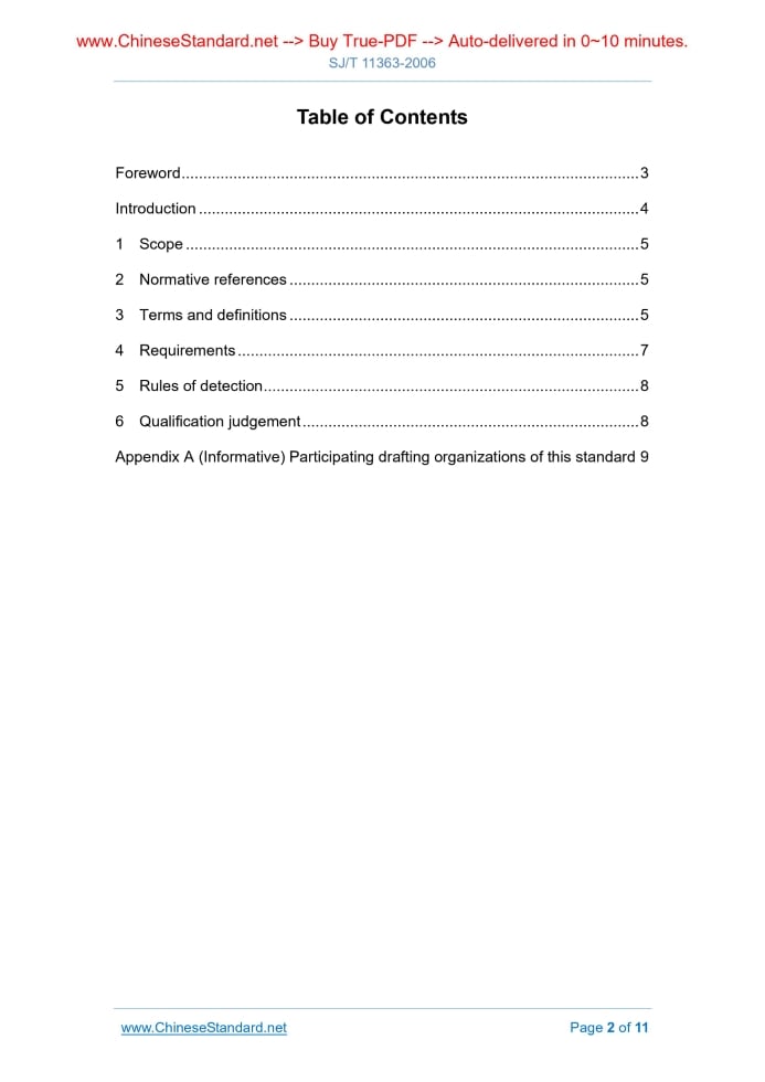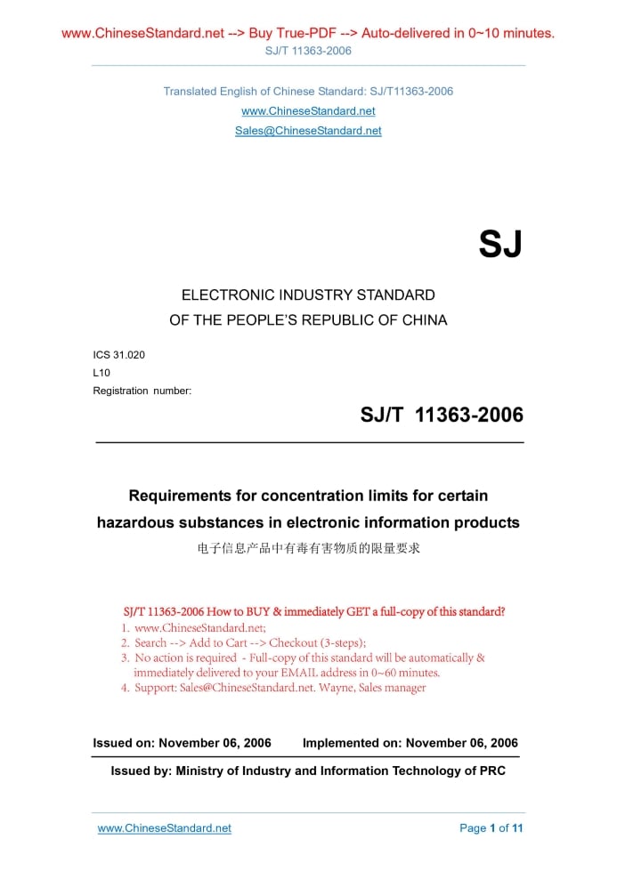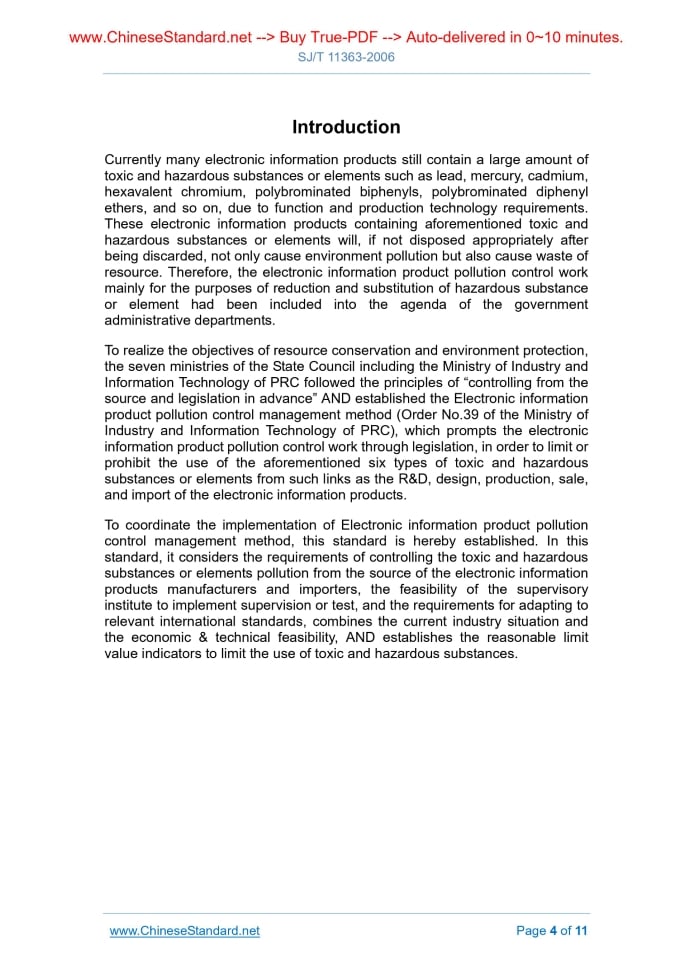 Similar standardsSJ/T 11363-2006: Requirements for concentration limits for certain hazardous substances in electronic information products---This is an excerpt. Full copy of true-PDF in English version (including equations, symbols, images, flow-chart, tables, and figures etc.), auto-downloaded/delivered in 9 seconds, can be purchased online: https://www.ChineseStandard.net/PDF.aspx/SJT11363-2006 SJ ELECTRONIC INDUSTRY STANDARD ICS 31.020 L10 Registration number. Requirements for concentration limits for certain hazardous substances in electronic information products Issued on. NOVEMBER 06, 2006 Implemented on. NOVEMBER 06, 2006 Issued by. Ministry of Industry and Information Technology of PRC Table of ContentsForeword... 3 Introduction... 4 1 Scope... 5 2 Normative references... 5 3 Terms and definitions... 5 4 Requirements... 7 5 Rules of detection... 8 6 Qualification judgement... 8 Appendix A (Informative) Participating drafting organizations of this standard 9ForewordThe Appendix A of this standard is informative. This standard was proposed by the China Electronic Technical Standardization Institute. The main drafting organization of this standard. Ministry of Information Industry Electronics Fifth Research Institute. The participating drafting organizations of this standard. REFER to Appendix A. The main drafters of this standard. Wang Xiaohan, Luo Daojun.1 ScopeThis standard specifies the maximum allowable concentration of the toxic and hazardous substances which are contained in the electronic information products. This standard is applicable to the electronic information products which are covered in the pollution control key management catalogue as specified in the Electronic information product pollution control management method.2 Normative referencesThe provisions in following documents become the provisions of this Standard through reference in this Standard. For the dated references, the subsequent amendments (excluding corrections) or revisions do not apply to this Standard; however, parties who reach an agreement based on this Standard are encouraged to study if the latest versions of these documents are applicable. For undated references, the latest edition of the referenced document applies. SJ/T 11365-2006 Testing methods for hazardous substances in electronic information products3 Terms and definitionsThe following terms and definitions apply to this document. 3.1 Substance It refers to the elementary substance or compound which is existed in nature AND is composed of chemical elements. 3.2 Hazardous substance HS It refers to the lead, mercury, cadmium, hexavalent chromium, polybrominated biphenyls (PBB), and polybrominated diphenyl ethers (PBDE, excluding decabromodiphenyl ether) as contained in the electronic information products. 3.9 Components It refers to the structural unit in the electronic information product which has a certain function or application, such as components, chassis, bracket, screws, switches, wires, and so on. 3.10 Test unit It refers to the sample which can be directly submitted for quantitative detection without requiring further mechanical disassembly.4 RequirementsThe electronic information products are generally composed of components and materials. AND its basic composition unit is material. To control the use of the toxic and hazardous substance, first CLASSIFY these composition units of the electronic information products in accordance with Table 1.5 Rules of detection5.1 Detection unit The detection unit shall be each composition unit constituting the electronic information product as listed in Table 1.6 Qualification judgementIf the hazardous substance of all the composition units in the electronic information product complies with the requirements of Table 2 after detection, this electronic information product is deemed as qualified;Appendix A(Informative) Participating drafting organizations of this standard (In the order of acronym) SJ/T 11363-2006 SJ ELECTRONIC INDUSTRY STANDARD ICS 31.020 L10 Registration number. Requirements for concentration limits for certain hazardous substances in electronic information products Issued on. NOVEMBER 06, 2006 Implemented on. NOVEMBER 06, 2006 Issued by. Ministry of Industry and Information Technology of PRCTable of ContentsForeword... 3 Introduction... 4 1 Scope... 5 2 Normative references... 5 3 Terms and definitions... 5 4 Requirements... 7 5 Rules of detection... 8 6 Qualification judgement... 8 Appendix A (Informative) Participating drafting organizations of this standard 9ForewordThe Appendix A of this standard is informative. This standard was proposed by the China Electronic Technical Standardization Institute. The main drafting organization of this standard. Ministry of Information Industry Electronics Fifth Research Institute. The participating drafting organizations of this standard. REFER to Appendix A. The main drafters of this standard. Wang Xiaohan, Luo Daojun.1 ScopeThis standard specifies the maximum allowable concentration of the toxic and hazardous substances which are contained in the electronic information products. This standard is applicable to the electronic information products which are covered in the pollution control key management catalogue as specified in the Electronic information product pollution control management method.2 Normative referencesThe provisions in following documents become the provisions of this Standard through reference in this Standard. For the dated references, the subsequent amendments (excluding corrections) or revisions do not apply to this Standard; however, parties who reach an agreement based on this Standard are encouraged to study if the latest versions of these documents are applicable. For undated references, the latest edition of the referenced document applies. SJ/T 11365-2006 Testing methods for hazardous substances in electronic information products3 Terms and definitionsThe following terms and definitions apply to this documen