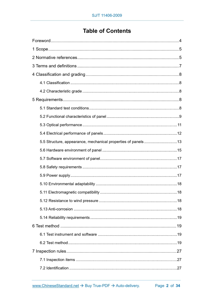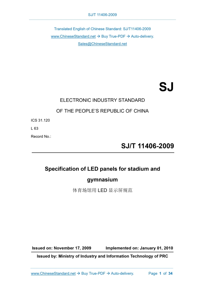 Similar standardsSJ/T 11406-2009: Specification of LED panels for stadium and gymnasium---This is an excerpt. Full copy of true-PDF in English version (including equations, symbols, images, flow-chart, tables, and figures etc.), auto-downloaded/delivered in 9 seconds, can be purchased online: https://www.ChineseStandard.net/PDF.aspx/SJT11406-2009SJ ELECTRONIC INDUSTRY STANDARD ICS 31.120 L 63 Record No.. Specification of LED panels for stadium and gymnasium Issued on. NOVEMBER 17, 2009 Implemented on. JANUARY 01, 2010 Issued by. Ministry of Industry and Information Technology of PRC Table of ContentsForeword... 4 1 Scope... 5 2 Normative references... 5 3 Terms and definitions... 7 4 Classification and grading... 8 4.1 Classification... 8 4.2 Characteristic grade... 8 5 Requirements... 8 5.1 Standard test conditions... 8 5.2 Functional characteristics of panel... 9 5.3 Optical performance... 11 5.4 Electrical performance of panels... 12 5.5 Structure, appearance, mechanical properties of panels... 13 5.6 Hardware environment of panel... 15 5.7 Software environment of panel... 17 5.8 Safety requirements... 17 5.9 Power supply... 17 5.10 Environmental adaptability... 18 5.11 Electromagnetic compatibility... 18 5.12 Resistance to wind pressure... 18 5.13 Anti-corrosion... 18 5.14 Reliability requirements... 19 6 Test method... 19 6.1 Test instrument and software... 19 6.2 Test method... 19 7 Inspection rules... 27 7.1 Inspection items... 27 7.2 Identification... 27 7.3 Quality consistency inspection... 29 8 Markings, packaging, transportation, storage... 31 8.1 Markings... 32 8.2 Packaging... 32 8.3 Transportation... 33 8.4 Storage... 33 References... 34ForewordThis standard shall be under the jurisdiction of the Institute of Standardization of Electronic Technology of PRC. Drafting organizations of this specification. Sichuan Kewei Industry Co., Ltd. The main drafters of this standard. Lan Banggu, Cao Xingyong, Cao Jian, Zhang Lixin, Lu Feng, Pu Hongchun, Chen Kunhua, etc. Specification of LED panels for stadium and gymnasium1 ScopeThis specification stipulates the definition, classification and grading, technical requirements, test methods, inspection rules, marking, packaging, transportation, storage requirements of LED panels for stadium and gymnasium. This specification applies to the design, manufacturing, quality inspection, installation, acceptance of LED panels for stadium and gymnasium (hereinafter abbreviated panel). This specification does not include panels for guiding directions OR the panels in the timing and scoring system, in the stadium and gymnasium.2 Normative referencesThe provisions in following documents become the provisions of this Standard through reference in this Standard. For the dated references, the subsequent amendments (excluding corrections) or revisions do not apply to this Standard; however, parties who reach an agreement based on this Standard are encouraged to study if the latest versions of these documents are applicable. For undated references, the latest edition of the referenced document applies. GB/T 191 Packaging - Pictorial marking for handling of goods GB 2312 Code of Chinese graphic character set for information interchange - Primary set GB/T 2423.17-1993 Basic environmental testing procedures for electric and electronic products Test Ka. Salt mist GB/T 3453-1994 Basic mode control procedures for data communications (ISO 1745.1975; 1177; 2111; 2628; 2629, NEQ) GB 4208-1993 Degrees of protection provided by enclosure (IP code) (IEC 529.1989, EQV) GB/T 6107-2000 Interface between data terminal equipment and data circuit terminating equipment employing serial binary data interchange (EIA/TIA- 232-E, IDT) GB/T 6388 Transport package shipping mark GB/T 9813 Generic specification for microcomputer GB/T 11463 Reliability test for electronic measuring instruments GB 12345 Code of Chinese ideogram set for information interchange supplementary set GB 18030-2005 Information technology - Chinese coded character set GB/T 19271.1-2003 Protection against lightning electromagnetic impulse - Part 1.General principles (IEC 61312-1.1995, IDT) GB/T 19607-2004 Protection types of special environmental condition and their symbols3 Terms and definitionsThe terms and definitions as established in SJ/T 11141-2003, SJ/T 11281, TY/T 1001.1-2005, as well as the following terms and definitions, apply to this specification. 3.1 Display area In response to the requirements of sports competitions, the area, which is divided on the panel, can be independently controlled, has independent display function (such as graphics & text display area or video display area, clock area). 3.2 Density of pixel The number of pixels, per square meter of the display area, of the panel.4 Classification and grading4.1 Classification 4.1.1 By the use environment The panels are divided into indoor panels (for gymnasiums) and outdoor panels (for stadiums). 4.1.4 By installation structure The LED panels for stadium and gymnasium are divided into flat panels, bucket panels, ring panels, according to different installation structures. 4.2 Characteristic grade The optical performance, electrical performance, mechanical performance of the panel are divided into three grades.5 Requirements5.1 Standard test conditions Unless otherwise specified, the test conditions are as follows. The ambient temperature is 15 °C ~ 35 °C; the relative humidity is 15%RH ~ 80%RH; the atmospheric pressure is 86 kPa ~ 106 kPa; 5.2 Functional characteristics of panel 5.2.1 Graphic & text panels It has the display function of letters, numbers, text, charts, graphics. Each primary color shall have a grayscale processing capability, which is greater than level 16 (color level equal to 4 bits). The animation display is consistent with the display of the corresponding area, on the main computer monitor. 5.2.4 Characters displayed on the flat panel For the flat panels of swimming venues used for international competitions, they mu