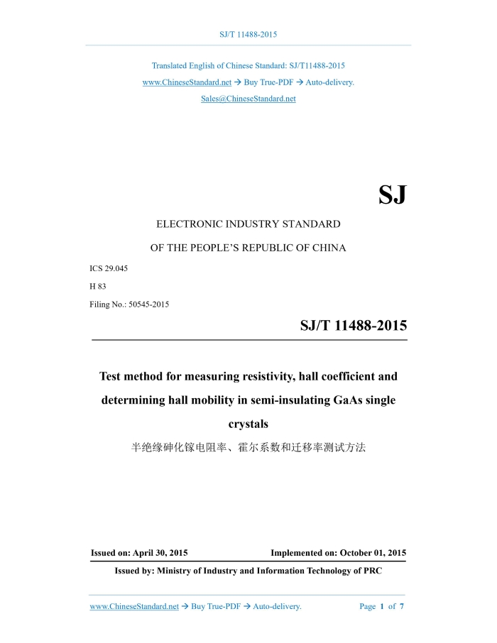 SJ/T 11488-2015: Test method for measuring resistivity, hall coefficient and determining hall mobility in semi-insulating GaAs single crystals Delivery: 9 seconds. True-PDF full-copy in English & invoice will be downloaded + auto-delivered via email. See step-by-step procedure Status: Valid