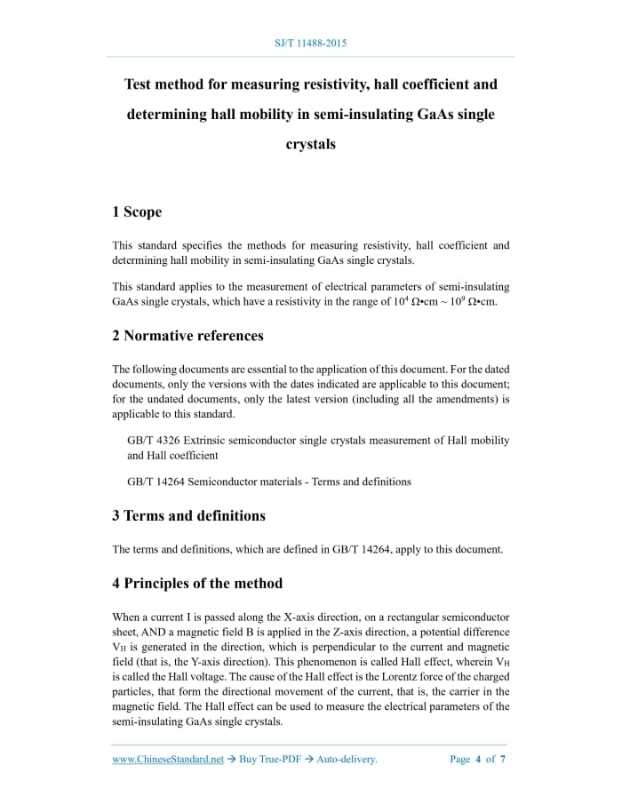 Similar standardsSJ/T 11488-2015: Test method for measuring resistivity, hall coefficient and determining hall mobility in semi-insulating GaAs single crystals---This is an excerpt. Full copy of true-PDF in English version (including equations, symbols, images, flow-chart, tables, and figures etc.), auto-downloaded/delivered in 9 seconds, can be purchased online: https://www.ChineseStandard.net/PDF.aspx/SJT11488-2015 SJ ELECTRONIC INDUSTRY STANDARD OF THE PEOPLE’S REPUBLIC OF CHINA ICS 29.045 H 83 Filing No.: 50545-2015 Test method for measuring resistivity, hall coefficient and determining hall mobility in semi-insulating GaAs single crystals ISSUED ON: APRIL 30, 2015 IMPLEMENTED ON: OCTOBER 01, 2015 Issued by: Ministry of Industry and Information Technology of PRC Table of ContentsForeword ... 3 1 Scope ... 4 2 Normative references ... 4 3 Terms and definitions ... 4 4 Principles of the method ... 4 5 Interfering factors ... 5 6 Instruments ... 5 7 Environmental requirements ... 5 8 Sample preparation ... 5 9 Measurement procedure ... 5 10 Calculations ... 6 11 Precision ... 7 12 Reports ... 7 Test method for measuring resistivity, hall coefficient and determining hall mobility in semi-insulating GaAs single crystals1 ScopeThis standard specifies the methods for measuring resistivity, hall coefficient and determining hall mobility in semi-insulating GaAs single crystals. This standard applies to the measurement of electrical parameters of semi-insulating GaAs single crystals, which have a resistivity in the range of 104 Ω•cm ~ 109 Ω•cm.2 Normative referencesThe following documents are essential to the application of this document. For the dated documents, only the versions with the dates indicated are applicable to this document; for the undated documents, only the latest version (including all the amendments) is applicable to this standard. GB/T 4326 Extrinsic semiconductor single crystals measurement of Hall mobility and Hall coefficient GB/T 14264 Semiconductor materials - Terms and definitions3 Terms and definitionsThe terms and definitions, which are defined in GB/T 14264, apply to this document.4 Principles of the methodWhen a current I is passed along the X-axis direction, on a rectangular semiconductor sheet, AND a magnetic field B is applied in the Z-axis direction, a potential difference VH is generated in the direction, which is perpendicular to the current and magnetic field (that is, the Y-axis direction). This phenomenon is called Hall effect, wherein VH is called the Hall voltage. The cause of the Hall effect is the Lorentz force of the charged particles, that form the directional movement of the current, that is, the carrier in the magnetic field. The Hall effect can be used to measure the electrical parameters of the semi-insulating GaAs single crystals.5 Interfering factorsMeasurement temperature, ohmic contact electrode preparation, etc. will all affect the measurement results.6 InstrumentsThe measuring instrument consists of the following parts: a) Hall test system. The applied magnetic field strength is 0.3 T ~ 1.0 T; the uniformity of the magnetic field within the sample measurement range is better than 1%; the input impedance is lower than 1013 Ω; the accuracy of the current source is better than 1%; the temperature accuracy is better than 0.1 °C; b) Micrometer, accuracy ±0.01 mm; c) Sample holder, protected from light.7 Environmental requirementsThe ambient temperature is 22 °C ~ 24 °C; the relative humidity is less than 60%. The test shielding room shall not have mechanical shock, vibration, or electromagnetic interference.8 Sample preparation8.1 Cutting, grinding, cleaning of specimen Follow the requirements of GB/T 4326, to carry out cutting, grinding, cleaning of specimen. 8.2 Ohm contact electrodes Follow the requirements of GB/T 4326, use In, AuGe/Au or AuGe/Ni alloys to prepare ohmic contact electrodes.9 Measurement procedureMake measurement, according to the measurement steps which are specified in GB/T 4326. ......Source: Above contents are excerpted from the full-copy PDF -- translated/reviewed by: www.ChineseStandard.net / Wayne Zheng et al. Tips & Frequently Asked Questions:Question 1: How long will the true-PDF of English version of SJ/T 11488-2015 be delivered?Answer: The full copy PDF of English version of SJ/T 11488-2015 can be downloaded in 9 seconds, and it will also be emailed to you in 9 seconds (double mechanisms to ensure the delivery reliably), with PDF-invoice.Question 2: Can I share the purchased PDF of SJ/T 11488-2015_English with my colleagues?Answer: Yes. The purchased PDF of SJ/T 11488-2015_English will be deemed to be sold to your employer/organization who actually paid for it, including your colleagues and your employer's intranet.Question 3: Does the price include tax/VAT?Answer: Yes. Our tax invoice, downloaded/delivered in 9 seconds, includes all tax/VAT and complies with 100+ countries' tax regulations (tax exempted in 100+ countries) -- See Avoidance of Double Taxation Agreements (DTAs): List of DTAs signed between Singapore and 100+ countriesQuestion 4: Do you accept my currency other than USD?Answer: Yes. www.ChineseStandard.us -- SJ/T 11488-2015 -- Click this link and select your country/currency to pay, the exact amount in your currency will be printed on the invoice. Full PDF will also be downloaded/emailed in 9 seconds.How to buy and download a true PDF of English version of SJ/T 11488-2015?A step-by-step guide to download PDF of SJ/T 11488-2015_EnglishStep 1: Visit website https://www.ChineseStandard.net (Pay in USD), or https://www.ChineseStandard.us (Pay in any currencies such as Euro, KRW, JPY, AUD).Step 2: Search keyword "SJ/T 11488-2015". Step 3: Click "Add to Cart". If multiple PDFs are required, repeat steps 2 and 3 to add up to 12 PDFs to cart. Step 4: Select payment option (Via payment agents Stripe or PayPal). Step 5: Customize Tax Invoice -- Fill up your email etc. Step 6: Click "Checkout". Step 