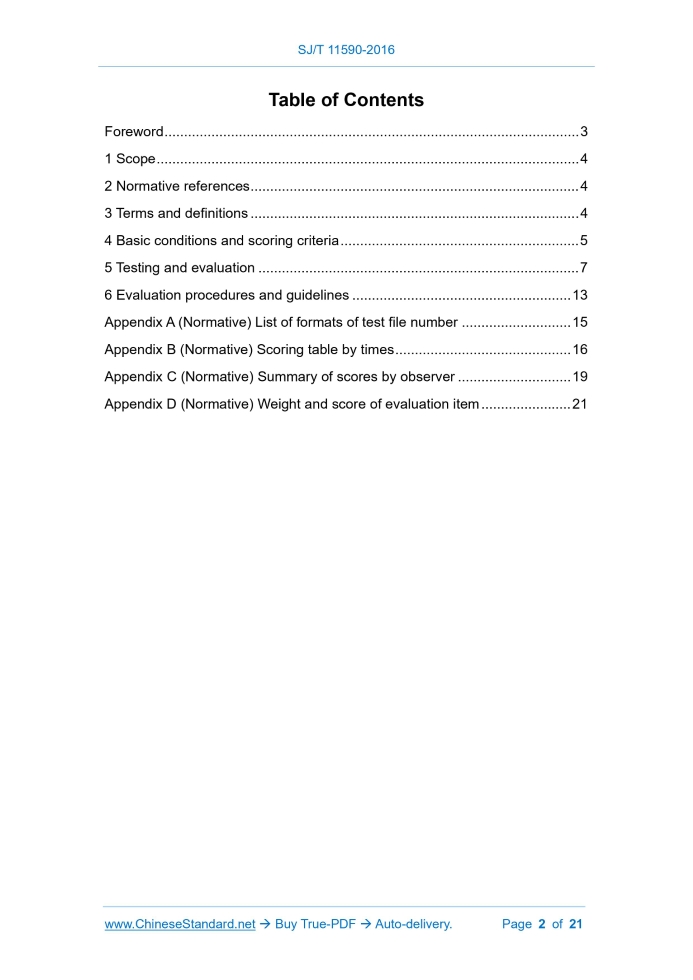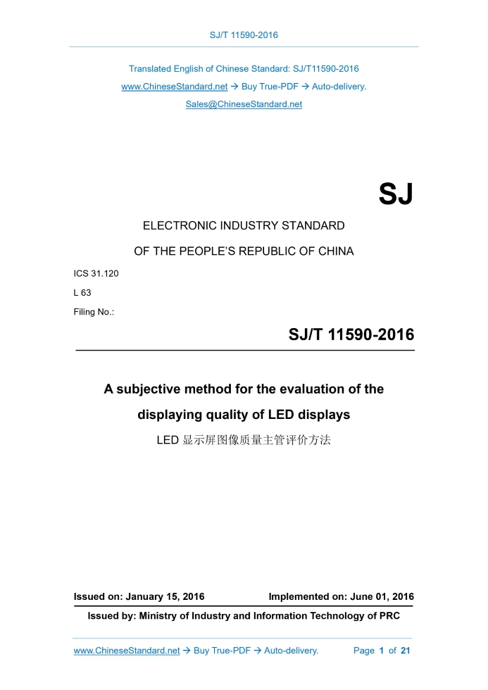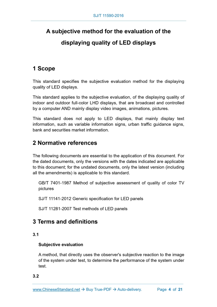 Similar standardsSJ/T 11590-2016: A subjective method for the evaluation of the displaying quality of LED displays---This is an excerpt. Full copy of true-PDF in English version (including equations, symbols, images, flow-chart, tables, and figures etc.), auto-downloaded/delivered in 9 seconds, can be purchased online: https://www.ChineseStandard.net/PDF.aspx/SJT11590-2016SJ ELECTRONIC INDUSTRY STANDARD ICS 31.120 L 63 Filing No.. A subjective method for the evaluation of the displaying quality of LED displays Issued on. JANUARY 15, 2016 Implemented on. JUNE 01, 2016 Issued by. Ministry of Industry and Information Technology of PRC Table of ContentsForeword... 3 1 Scope... 4 2 Normative references... 4 3 Terms and definitions... 4 4 Basic conditions and scoring criteria... 5 5 Testing and evaluation... 7 6 Evaluation procedures and guidelines... 13 Appendix A (Normative) List of formats of test file number... 15 Appendix B (Normative) Scoring table by times... 16 Appendix C (Normative) Summary of scores by observer... 19 Appendix D (Normative) Weight and score of evaluation item... 21ForewordThis standard was drafted in accordance with the rules given in GB/T 1.1-2009. Please note that certain contents of this standard may involve patents. The issuing organization of this standard does not bear the responsibility for identifying these patents. This standard shall be under the jurisdiction of the Electronics Industry Standardization Research Institute of the Ministry of Industry and Information Technology. Drafting organizations of this standard. Shanghai Sansi Technology Development Co., Ltd., Xi'an Qingsong Technology Co., Ltd., Shenzhen Lianjian Optoelectronics Co., Ltd., Nanjing Luopu Co., Ltd. The main drafters of this standard. Cheng Deshi, Li Dahong, Xu Yongfu, Liu Hanping, Lan Lan. A subjective method for the evaluation of the displaying quality of LED displays1 ScopeThis standard specifies the subjective evaluation method for the displaying quality of LED displays. This standard applies to the subjective evaluation, of the displaying quality of indoor and outdoor full-color LHD displays, that are broadcast and controlled by a computer AND mainly display video images, animations, pictures. This standard does not apply to LED displays, that mainly display text information, such as variable information signs, urban traffic guidance signs, bank and securities market information.2 Normative referencesThe following documents are essential to the application of this document. For the dated documents, only the versions with the dates indicated are applicable to this document; for the undated documents, only the latest version (including all the amendments) is applicable to this standard. GB/T 7401-1987 Method of subjective assessment of quality of color TV pictures SJ/T 11141-2012 Generic specification for LED panels SJ/T 11281-2007 Test methods of LED panels3 Terms and definitions3.1 Subjective evaluation A method, that directly uses the observer's subjective reaction to the image of the system under test, to determine the performance of the system under test. 3.2 Quality evaluation A subjective evaluation of the performance of the tested display system, under certain viewing conditions. 3.3 Test image An image or image sequence, which has specific requirements on the image material, AND is used for the subjective evaluation of the system under test. 3.4 Rating scale The scoring scale, which is used in subjective evaluation.4 Basic conditions and scoring criteria4.1 Basic observation conditions Unless otherwise specified, subjective evaluation shall be carried out under the conditions, which are specified in Table 1.When other observation conditions are required for individual specific evaluation items, they shall be explained separately in the evaluation items. 4.2 Test material A set of discs, which contain static images and moving images, of different resolutions. During evaluation, select the appropriate test image resolution, according to the resolution and aspect ratio of the display. 4.4 Scoring criteria It adopts a five-level subjective image quality evaluation method. Table 2 shows the corresponding relationship, between the subjective evaluation and the score.5 Testing and evaluation5.1 Definition of static image According to the resolution of the display under test, select a set of sharpness test card SD-01 and SD-02, which is suitable for its resolution AND can reflect the details of the image. 5.2 Definition of moving images According to the resolution of the tested display, select a group of dynamic definition test videos MD-01 ~ MD-02, that are suitable for its resolution AND can reflect the definition of the moving image. Observe from the front, on whether the license plate of the car, which is driving at high speed, is identifiable; whether the face of athletes, who is running, is clearly identifiable; whether there is obvious tailing phenomenon. 5.5 Assembly precision Under the condition that the 128-level full-white image test card (W-128) is displayed on the full screen, observe from the front and side, respectively, on whether there are bright lines, which are higher than normal brightness, OR dark lines, which are lower than normal brightness, at the joints of the module and cabinet. It will be evaluated, according to the quality degree. See Table 7, for the scoring of assembly precision. 5.7 Grayscale performance 2 (false contour phenomenon) According to the resolution of the display under test, display the "round moon" video test file MOON-01; the ambient brightness is the low value under the conditions of use. 5.8 Flyback line or stroboscopic phenomenon Select the horizontal bar test image (the bar height is greater than 64 pixels) HLINE-01, that can display non-grayscale (dark, low-bright, medium-bright, high-bright). The observer observes the display, by clicking teeth, shaking heads (nodding), blink, shaking the palm of hand, etc. 5.9 Virtual image phenomenon