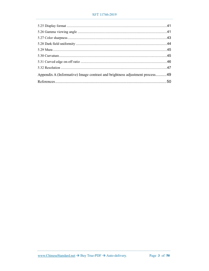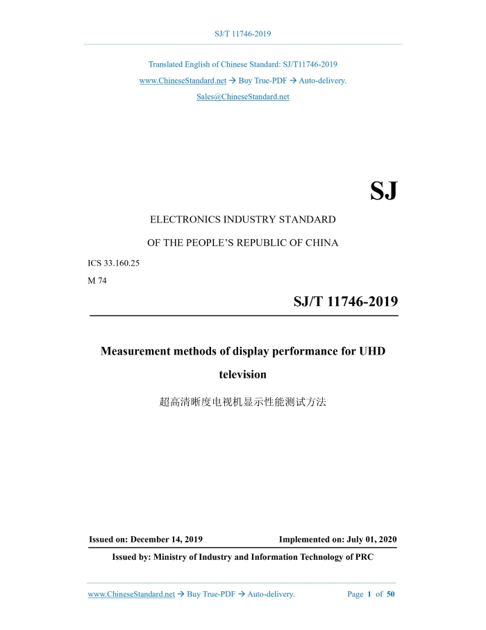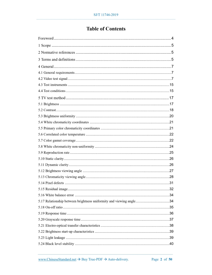 Similar standardsSJ/T 11746-2019: Measurement methods of display performance for UHD television---This is an excerpt. Full copy of true-PDF in English version (including equations, symbols, images, flow-chart, tables, and figures etc.), auto-downloaded/delivered in 9 seconds, can be purchased online: https://www.ChineseStandard.net/PDF.aspx/SJT11746-2019SJ ELECTRONICS INDUSTRY STANDARD ICS 33.160.25 M 74 Measurement methods of display performance for UHD television Issued on. DECEMBER 14, 2019 Implemented on. JULY 01, 2020 Issued by. Ministry of Industry and Information Technology of PRC Table of ContentsForeword... 4 1 Scope... 5 2 Normative references... 5 3 Terms and definitions... 5 4 General... 7 5 TV test method... 17 Appendix A (Informative) Image contrast and brightness adjustment process... 49 References... 501 ScopeThis standard describes the test conditions and test methods for ultra-high-definition televisions (hereinafter referred to as televisions). This standard applies to ultra-high-definition televisions and ultra-high-definition displays with display modes such as LCD; other types of display modes can use it as a reference.2 Normative referencesThe following documents are essential to the application of this document. For the dated documents, only the versions with the dates indicated are applicable to this document; for the undated documents, only the latest version (including all the amendments) is applicable to this standard. SJ/T 11324 Terminology of digital television receiving equipment GY/T 307 Parameter values for ultra-high definition television systems for production and program exchange3 Terms and definitionsThe terms and definitions defined in SJ/T 11324, as well as the following terms and definitions, apply to this document. 3.1 Response time The response process of each pixel point changing from dark to bright and from bright to dark under the action of the excitation signal. The response time is equal to the sum of the rise time and the fall time. 3.2 Rise time The time required for the image brightness of each pixel point to rise from 10% to 90% under the action of the excitation signal. 3.3 Fall time The time required for the image brightness of each pixel point to fall from 90% to 10% under the action of the excitation signal.4 General4.1 General requirements 4.1.1 Test environment conditions The test is carried out under the following standard atmospheric conditions for measurement. 4.1.2 Power supply The test shall be carried out under the condition of rated power supply voltage. The power supply voltage shall vary within ±2% during the test; the power supply frequency shall fluctuate within ±2%; the harmonic component shall fluctuate within ±5%. 4.1.3 Test site The test shall be carried out indoors without interference from external electromagnetic fields. If interference can affect the test results, the test shall be carried out in a shielded room. 4.2 Video test signal 4.2.1 Overview The signal shall comply with the provisions of GY/T 307.The 4K ultra-high-definition test uses a 3840×2160/50/1.1 format signal; the 8K ultra-high-definition test uses a 7680×4320/50/1.1 format signal. The encoding format is 10 bit. 4.2.3 Color bar signal The color bar signal consists of white, yellow, cyan, green, purple, red, blue, black vertical color bands, arranged from left to right according to brightness. The display test shall use a 100/0/100/0 color bar signal, as shown in Figure 2. 4.2.5 Uniformity test point location diagram 4.2.6 Composite test chart The composite test chart signal is composed of a combination of black and white and color components. In order to provide more information for the TV performance test, the chart shall include the following. 4.2.7 Full red field, full green field, full blue field signal The full red field, full green field, full blue field signal are full screen red, full screen green, full screen blue primary color signals with 100% saturation and 100% amplitude, respectively, as shown in Figure 6, Figure 7, Figure 8. 4.3 Test instruments 4.3.1 Video test signal generator The video test signal generator shall be able to generate the test signals required for the test; the output interface adopts a digital video interface. 4.4 Test conditions 4.4.1 Adjustment of standard working state Unless otherwise specified, the standard working state of the TV is adjusted according to the following steps.5 TV test method5.1 Brightness 5.1.1 Overview This item tests the brightness of the TV set. 5.1.2 Test method 5.1.2.2 Test steps The test steps are as follows. 5.2.2 Test method 1 5.2.2.1 Test conditions Video test signal. black and white window signal. During the test, the displayed image other than the tested window is shielded. The exposed image range shall not be larger than the tested window size. 5.4 White chromaticity coordinates 5.4.1 Overview This item tests the white chromaticity coordinates of the TV screen. 5.4.2 Test method 5.4.2.1 Test conditions Video test signal. Full white field signal. 5.4.2.2 Test steps The test steps are as follows. 5.4.3 Result expression The test result is the chromaticity coordinate value of the center point of the screen. 5.5 Primary color chromaticity coordinates SJ/T 11746-2019 SJ ELECTRONICS INDUSTRY STANDARD ICS 33.160.25 M 74 Measurement methods of display performance for UHD television Issued on. DECEMBER 14, 2019 Implemented on. JULY 01, 2020 Issued by. Ministry of Industry and Information Technology of PRCTable of ContentsForeword... 4 1 Scope... 5 2 Normative references... 5 3 Terms and definitions... 5 4 General... 7 5 TV test method... 17 Appendix A (Informative) Image contrast and brightness adjustment process... 49 References... 501 ScopeThis standard describes the test conditions and test methods for ultra-high-definition televisions (hereinafter referred to as televisions). This standard applies to ultra-high-definition televisions and ultra-high-definition displays with display