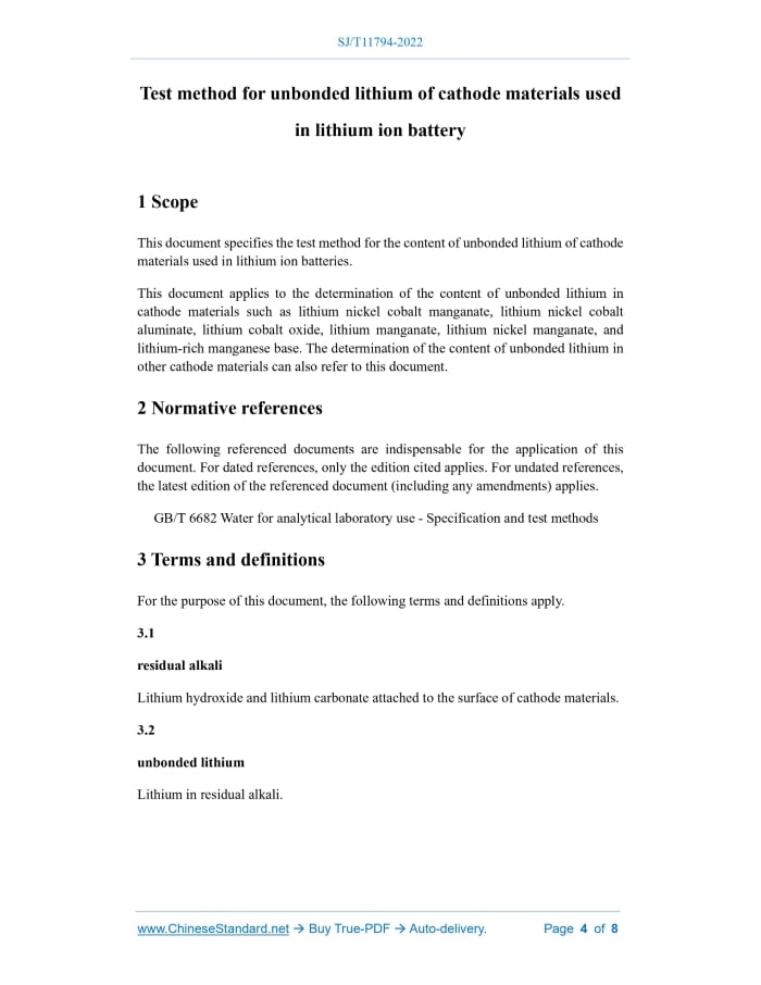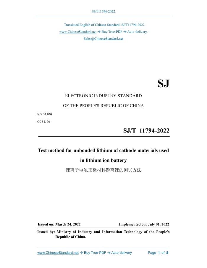SJ/T 11794-2022: Test method for unbonded lithium of cathode materials used in lithium ion battery Delivery: 9 seconds. True-PDF full-copy in English & invoice will be downloaded + auto-delivered via email. See step-by-step procedure Status: Valid